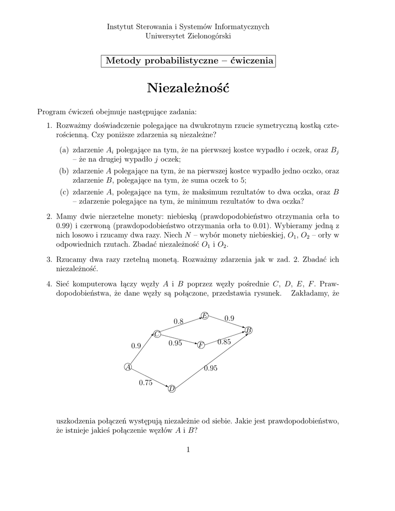 Instytut Sterowania i Systemów Informatycznych Uniwersytet Zielonogórski Metody probabilistyczne – ćwiczenia Niezależność Program ćwiczeń obejmuje następujące zadania: 1. Rozważmy doświadczenie polegające na dwukrotnym rzucie symetryczną kostką czterościenną. Czy poniższe zdarzenia są niezależne? (a) zdarzenie Ai polegające na tym, że na pierwszej kostce wypadło i oczek, oraz Bj – że na drugiej wypadło j oczek; (b) zdarzenie A polegające na tym, że na pierwszej kostce wypadło jedno oczko, oraz zdarzenie B, polegające na tym, że suma oczek to 5; (c) zdarzenie A, polegające na tym, że maksimum rezultatów to dwa oczka, oraz B – zdarzenie polegające na tym, że minimum rezultatów to dwa oczka? 2. Mamy dwie nierzetelne monety: niebieską (prawdopodobieństwo otrzymania orła to 0.99) i czerwoną (prawdopodobieństwo otrzymania orła to 0.01). Wybieramy jedną z nich losowo i rzucamy dwa razy. Niech N – wybór monety niebieskiej, O1 , O2 – orły w odpowiednich rzutach. Zbadać niezależność O1 i O2 . 3. Rzucamy dwa razy rzetelną monetą. Rozważmy zdarzenia jak w zad. 2. Zbadać ich niezależność. 4. Sieć komputerowa łączy węzły A i B poprzez węzły pośrednie C, D, E, F . Prawdopodobieństwa, że dane węzły są połączone, przedstawia rysunek. Zakładamy, że 1E 0.8 7 C z 0.95 0.9 A 0.9 0.85 F q 1B > 0.95 0.75 j D uszkodzenia połączeń występują niezależnie od siebie. Jakie jest prawdopodobieństwo, że istnieje jakieś połączenie węzłów A i B? 1 5. Test na obecność pewnej choroby ma dokładność 90%, tzn. jeżeli osoba choruje na tę chorobę, rezultat testu jest pozytywny z prawdopodobieństwem 0.9, a jeżeli osoba jest zdrowa, rezultaty testu są negatywne z prawdopodobieństwem 0.9. Losowo wybrana osoba ma chorobę z prawdopodobieństwem 0.001. Dla danej osoby test dał wynik pozytywny. Jakie jest prawdopodobieństwo tego, że jest ona chora? 6. Myśliwy ma dwa psy. Pewnego dnia, ścigając zwierzę dotarł do miejsca, gdzie ścieżka się rozgałęzia. Wiedząc, że każdy pies, niezależnie od drugiego, wybierze prawidłową drogę z prawdopodobieństwem p, decyduje się wypuścić psy, żeby wybrały ścieżki. Jeżeli się zgodzą, wybierze tę samą ścieżkę, a jeżeli nie – sam wybierze ścieżkę losowo. Czy ta strategia jest lepsza niż wypuszczenie tylko jednego psa, żeby wybrał drogę? 7. Sygnał binarny transmitowany przez zaszumiony kanał komunikacyjny może zostać otrzymany wg następującego schematu: 0 0 1 1 1 − 0 1 − 1 0 1 (a) Załóżmy, że nadajnik transmituje 0 z prawdopodobieństwem p, a 1 z prawdopodobieństwem 1 − p. Jakie jest prawdopodobieństwo, że losowo wybrany symbol zostanie odebrany poprawnie? (b) Załóżmy, że nadano ciąg 1011. Jakie jest prawdopodobieństwo, że wszystkie symbole zostaną odebrane poprawnie? (c) Aby poprawić niezawodność, każdy symbol jest nadawany trzy razy, a otrzymany symbol jest dekodowany przez regułę większościową. Jakie jest prawdopodobieństwo, że wysłane 0 zostanie poprawnie zdekodowane? (d) Załóżmy, że nadajnik transmituje 0 z prawdopodobieństwem p, a 1 z prawdopodobieństwem 1 − p, oraz że stosuje się schemat z poprzedniego podpunktu. Jakie jest prawdopodobieństwo, że wysłano 0, jeżeli otrzymano 101? 8. Pijany linoskoczek stara się utrzymać równowagę robiąc krok do przodu z prawdopodobieństwem p oraz krok do tyłu z prawdopodobieństwem 1 − p, niezależnie od poprzednich kroków. (a) Jakie jest prawdopodobieństwo, że po dwóch krokach będzie w tym samym miejscu? (b) Jakie jest prawdopodobieństwo, że po trzech krokach posunie się o jeden krok naprzód? (c) Wiedząc, że po trzech krokach przesunął się o jeden krok do przodu, jakie jest prawdopodobieństwo, że pierwszy krok był do przodu? 2 9. Miasto zasilane jest energią elektryczną z n elektrowni, ale w zasadzie każda z nich z osobna jest w stanie dostarczyć całą potrzebną energię. Załóżmy, że w każdej z nich może nastąpić awaria (z prawdopodobieństwem pi dla elektrowni i), niezależnie od pozostałych. (a) Jakie jest prawdopodobieństwo, że nad miastem zapadną ciemności? (b) Jeżeli do oświetlenia miasta wymagana jest energia z przynajmniej dwóch elektrowni, to jakie jest prawdopodobieństwo zapadnięcia ciemności? 3