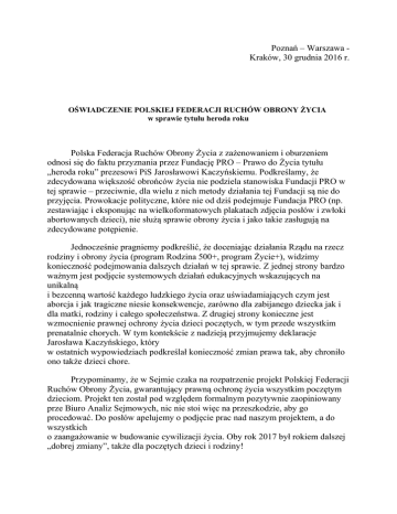 Poznań – Warszawa Kraków, 30 grudnia 2016 r. OŚWIADCZENIE POLSKIEJ FEDERACJI RUCHÓW OBRONY ŻYCIA w sprawie tytułu heroda roku Polska Federacja Ruchów Obrony Życia z zażenowaniem i oburzeniem odnosi się do faktu przyznania przez Fundację PRO – Prawo do Życia tytułu „heroda roku” prezesowi PiS Jarosławowi Kaczyńskiemu. Podkreślamy, że zdecydowana większość obrońców życia nie podziela stanowiska Fundacji PRO w tej sprawie – przeciwnie, dla wielu z nich metody działania tej Fundacji są nie do przyjęcia. Prowokacje polityczne, które nie od dziś podejmuje Fundacja PRO (np. zestawiając i eksponując na wielkoformatowych plakatach zdjęcia posłów i zwłoki abortowanych dzieci), nie służą sprawie obrony życia i jako takie zasługują na zdecydowane potępienie. Jednocześnie pragniemy podkreślić, że doceniając działania Rządu na rzecz rodziny i obrony życia (program Rodzina 500+, program Życie+), widzimy konieczność podejmowania dalszych działań w tej sprawie. Z jednej strony bardzo ważnym jest podjęcie systemowych działań edukacyjnych wskazujących na unikalną i bezcenną wartość każdego ludzkiego życia oraz uświadamiających czym jest aborcja i jak tragiczne niesie konsekwencje, zarówno dla zabijanego dziecka jak i dla matki, rodziny i całego społeczeństwa. Z drugiej strony konieczne jest wzmocnienie prawnej ochrony życia dzieci poczętych, w tym przede wszystkim prenatalnie chorych. W tym kontekście z nadzieją przyjmujemy deklaracje Jarosława Kaczyńskiego, który w ostatnich wypowiedziach podkreślał konieczność zmian prawa tak, aby chroniło ono także dzieci chore. Przypominamy, że w Sejmie czaka na rozpatrzenie projekt Polskiej Federacji Ruchów Obrony Życia, gwarantujący prawną ochronę życia wszystkim poczętym dzieciom. Projekt ten został pod względem formalnym pozytywnie zaopiniowany prze Biuro Analiz Sejmowych, nic nie stoi więc na przeszkodzie, aby go procedować. Do posłów apelujemy o podjęcie prac nad naszym projektem, a do wszystkich o zaangażowanie w budowanie cywilizacji życia. Oby rok 2017 był rokiem dalszej „dobrej zmiany”, także dla poczętych dzieci i rodziny! W imieniu Polskiej Federacji Ruchów Obrony Życia dr Paweł Wosicki – prezes, dr inż. Antoni Zięba – wiceprezes, Anna Dyndul sekretarz