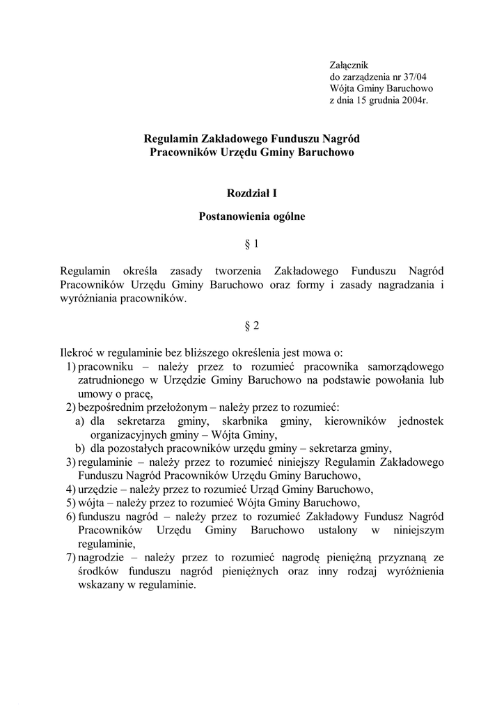 Załącznik do zarządzenia nr 37/04 Wójta Gminy Baruchowo z dnia 15 grudnia 2004r. Regulamin Zakładowego Funduszu Nagród Pracowników Urzędu Gminy Baruchowo Rozdział I Postanowienia ogólne §1 Regulamin określa zasady tworzenia Zakładowego Funduszu Nagród Pracowników Urzędu Gminy Baruchowo oraz formy i zasady nagradzania i wyróżniania pracowników. §2 Ilekroć w regulaminie bez bliższego określenia jest mowa o: 1) pracowniku – należy przez to rozumieć pracownika samorządowego zatrudnionego w Urzędzie Gminy Baruchowo na podstawie powołania lub umowy o pracę, 2) bezpośrednim przełożonym – należy przez to rozumieć: a) dla sekretarza gminy, skarbnika gminy, kierowników jednostek organizacyjnych gminy – Wójta Gminy, b) dla pozostałych pracowników urzędu gminy – sekretarza gminy, 3) regulaminie – należy przez to rozumieć niniejszy Regulamin Zakładowego Funduszu Nagród Pracowników Urzędu Gminy Baruchowo, 4) urzędzie – należy przez to rozumieć Urząd Gminy Baruchowo, 5) wójta – należy przez to rozumieć Wójta Gminy Baruchowo, 6) funduszu nagród – należy przez to rozumieć Zakładowy Fundusz Nagród Pracowników Urzędu Gminy Baruchowo ustalony w niniejszym regulaminie, 7) nagrodzie – należy przez to rozumieć nagrodę pieniężną przyznaną ze środków funduszu nagród pieniężnych oraz inny rodzaj wyróżnienia wskazany w regulaminie. Rozdział II Zasady tworzenia funduszu nagród. §3 1. Tworzy się fundusz nagród pieniężnych dla pracowników urzędu w wysokości do 3% rocznego planowanego funduszu wynagrodzeń osobowych z przeznaczeniem na nagrody pieniężne za szczególne osiągnięcia w pracy zawodowej. 2. Fundusz nagród pieniężnych pozostaje w wyłącznej dyspozycji wójta. 3. Wysokość funduszu nagród pieniężnych może być podwyższany przez wójta w ramach powstałych oszczędności w wynagrodzeniach osobowych pracowników. §4 1. Odpowiedzialnym za obsługę finansową funduszu nagród pieniężnych jest skarbnik gminy. 2. Odpowiedzialnym za obsługę techniczno – organizacyjną funduszu nagród jest inspektor do spraw organizacyjnych. Rozdział III Zasady przyznawania nagród. §5 1. Wójt może przyznać pracownikowi nagrodę z inicjatywy własnej lub na umotywowany wniosek bezpośredniego przełożonego. Wnioskodawca jest zobowiązany wskazać formę nagrody. 2. Wójt przy podejmowaniu decyzji o przyznaniu nagrody nie jest związany wnioskiem bezpośredniego przełożonego pracownika. §6 1. Nagroda może być przyznana pracownikowi, który, z zastrzeżeniem ust. 2, spełnia łącznie wszystkie poniższe warunki: 1) umiejętnie i skutecznie wykorzystuje swoje kwalifikacje oraz doświadczenie zawodowe na zajmowanym stanowisku, 2) wykazuje się szczególnym zaangażowaniem w wykonywaniu powierzonych zadań, 3) dba o jakość wykonywanej pracy i jej terminowość, 4) przejawia inicjatywę oraz podnosi wydajność pracy, 5) nie był karany karą porządkową. 2. Nagroda może być pracownikowi przyznawana także w przypadku, kiedy jego praca została pozytywnie oceniona przez podmioty zewnętrzne i dobrze służyła kreowaniu pozytywnego wizerunku urzędu i promocji gminy oraz przyczyniła się do popularyzacji efektów jego pracy. §7 1. Pracownikowi spełniającemu kryteria określone w § 6 może być przyznana nagroda w następujących terminach: 1) w maju – z okazji Święta Konstytucji 3-go Maja, 2) w listopadzie – z okazji Święta Niepodległości, 3) w grudniu – po dokonaniu oceny całorocznych osiągnięć pracownika. 2. Wójt uwzględniając kryteria określone w § 6 może przyznać pracownikowi nagrodę w każdym czasie, niezależnie od terminów, o których mowa w ust. 1. §8 Nagroda może mieć formę: 1) nagrody pieniężnej, 2) pochwały pisemnej, 3) dyplomu uznania, 4) pochwały publicznej. §9 Nagroda ma charakter uznaniowy i jest elementem motywacyjnym do dalszego podnoszenia jakości świadczonej pracy, w ramach kryteriów, o których mowa w § 6 ust. 1. § 10 Odpis zawiadomienia o przyznaniu nagrody składa się do akt osobowych pracowników. Rozdział IV Postanowienia końcowe. § 11 Nie wykorzystane w danym roku środki funduszu nagród pieniężnych przechodzą na rok następny. § 12 Interpretacja przepisów niniejszego regulaminu należy do wójta. § 13 Zmiany regulaminu mogą być dokonywane w trybie przewidzianym dla jego ustalenia. WÓJT inż. Stanisław Sadowski