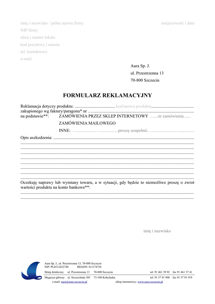 imię i nazwisko / pełna nazwa firmy miejscowość i data NIP firmy ulica i numer lokalu kod pocztowy i miasto tel. kontaktowy e-mail Aura Sp. J. ul. Przestrzenna 13 70-800 Szczecin FORMULARZ REKLAMACYJNY Reklamacja dotyczy produktu: ......................................kod/nazwa produktu....................................... zakupionego wg faktury/paragonu* nr ….............................................................................................. na podstawie**: ZAMÓWIENIA PRZEZ SKLEP INTERNETOWY …....nr zamówienia....... ZAMÓWIENIA MAILOWEGO INNE: …..................….................proszę uzupełnić….....................….............. Opis uszkodzenia: .................................................................................................................................. ................................................................................................................................................................ ................................................................................................................................................................ ................................................................................................................................................................ ................................................................................................................................................................ ................................................................................................................................................................ ................................................................................................................................................................ ................................................................................................................................................................ ................................................................................................................................................................ Oczekuję naprawy lub wymiany towaru, a w sytuacji, gdy będzie to niemożliwe proszę o zwrot wartości produktu na konto bankowe**: ................................................................................................................................................................ ................................................................................................................................................................ imię i nazwisko Aura Sp. J., ul. Przestrzenna 13, 70-800 Szczecin NIP: PL8512422748 REGON: 811174726 Sklep detaliczny ul. Przestrzenna 13 Magazyn główny ul. Szczecińska 30f e-mail: [email protected] 70-800 Szczecin 73-108 Kobylanka tel. 91 461 39 92 fax 91 461 37 41 tel. 91 57 91 900 sklep internetowy: www.aura.szczecin.pl fax 91 57 91 919 Objaśnienia: *) W przypadku częściowej rezygnacji z zakupu należy podać kody produktów wyszczególnione na dokumencie sprzedaży wraz ze zwracaną ilością. Przy rezygnacji całościowej wpisać „wszystkie towary”. **) Niepotrzebne skreślić. W przypadku sprzedaży paragonowej warunkiem przyjęcia lub wymiany towaru jest odesłanie kopii lub oryginału paragonu fiskalnego. Osoba zwracająca towar powinna zachować kopię paragonu. Numer paragonu znajduje się w jego dolnej części: W przypadku sprzedaży fakturowanej zwrot pieniędzy na konto jest dokonywany w momencie otrzymania podpisanej kopii faktury korygującej. ***) Niepotrzebne skreślić. ****) Numer konta bankowego należy podać bezwzględnie. W przypadku zaistnienia konieczności zwrotu pieniędzy klientowi (a numer konta nie został podany), zastrzegamy sobie prawo do zwrotu pieniędzy Przekazem Pocztowym za potwierdzeniem odbioru za pośrednictwem Poczty Polskiej w kwocie pomniejszonej o koszt wykonania tej usługi. TOWAR NALEŻY ODESŁAĆ NA NASTĘPUJĄCE ADRESY: • zakupy w sklepie w Szczecinie – Aura Sp. J., Przestrzenna 13, 70-800 Szczecin • zamówienia wysyłkowe realizowane przez sklep w Szczecinie - Aura Sp. J., Przestrzenna 13, 70-800 Szczecin • zamówienia realizowane przez sklep internetowy – Aura Sp. J., Szczecińska 30f, 73-108 Kobylanka • zamówienia realizowane przez Magazyn Główny – Aura Sp. J., Szczecińska 30f, 73-108 Kobylanka W przypadku wątpliwości, prosimy o kontakt telefoniczny pod nr 91 461 39 92 lub 91 57 91 900 Aura Sp. J., ul. Przestrzenna 13, 70-800 Szczecin NIP: PL8512422748 REGON: 811174726 Sklep detaliczny ul. Przestrzenna 13 Magazyn główny ul. Szczecińska 30f e-mail: [email protected] 70-800 Szczecin 73-108 Kobylanka tel. 91 461 39 92 fax 91 461 37 41 tel. 91 57 91 900 sklep internetowy: www.aura.szczecin.pl fax 91 57 91 919