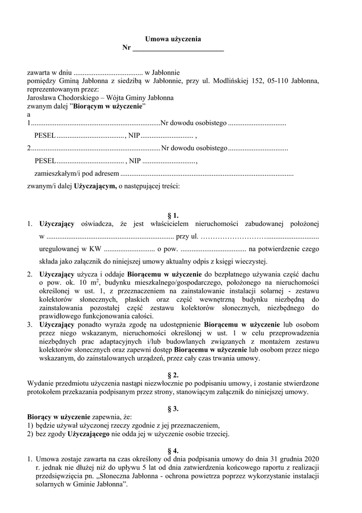 Umowa użyczenia Nr _________________________ zawarta w dniu ...................................... w Jabłonnie pomiędzy Gminą Jabłonna z siedzibą w Jabłonnie, przy ul. Modlińskiej 152, 05-110 Jabłonna, reprezentowanym przez: Jarosława Chodorskiego – Wójta Gminy Jabłonna zwanym dalej ”Biorącym w użyczenie” a 1.......................................................................Nr dowodu osobistego ................................ PESEL ..................................... , NIP ............................. , 2....................................................................... Nr dowodu osobistego ................................. PESEL ..................................... , NIP ............................. , zamieszkałym/i pod adresem ............................................................................................... zwanym/i dalej Użyczającym, o następującej treści: § 1. 1. Użyczający oświadcza, że jest właścicielem nieruchomości zabudowanej położonej w ...................................................................... przy ul. ………………………............................. uregulowanej w KW ............................ o pow. .................................... na potwierdzenie czego składa jako załącznik do niniejszej umowy aktualny odpis z księgi wieczystej. 2. Użyczający użycza i oddaje Biorącemu w użyczenie do bezpłatnego używania część dachu o pow. ok. 10 m2, budynku mieszkalnego/gospodarczego, położonego na nieruchomości określonej w ust. 1, z przeznaczeniem na zainstalowanie instalacji solarnej - zestawu kolektorów słonecznych, płaskich oraz część wewnętrzną budynku niezbędną do zainstalowania pozostałej część zestawu kolektorów słonecznych, niezbędnego do prawidłowego funkcjonowania całości. 3. Użyczający ponadto wyraża zgodę na udostępnienie Biorącemu w użyczenie lub osobom przez niego wskazanym, nieruchomości określonej w ust. 1 w celu przeprowadzenia niezbędnych prac adaptacyjnych i/lub budowlanych związanych z montażem zestawu kolektorów słonecznych oraz zapewni dostęp Biorącemu w użyczenie lub osobom przez niego wskazanym, do zainstalowanych urządzeń, przez cały czas trwania umowy. § 2. Wydanie przedmiotu użyczenia nastąpi niezwłocznie po podpisaniu umowy, i zostanie stwierdzone protokołem przekazania podpisanym przez strony, stanowiącym załącznik do niniejszej umowy. § 3. Biorący w użyczenie zapewnia, że: 1) będzie używał użyczonej rzeczy zgodnie z jej przeznaczeniem, 2) bez zgody Użyczającego nie odda jej w użyczenie osobie trzeciej. § 4. 1. Umowa zostaje zawarta na czas określony od dnia podpisania umowy do dnia 31 grudnia 2020 r. jednak nie dłużej niż do upływu 5 lat od dnia zatwierdzenia końcowego raportu z realizacji przedsięwzięcia pn. „Słoneczna Jabłonna - ochrona powietrza poprzez wykorzystanie instalacji solarnych w Gminie Jabłonna”. 2. Umowa użyczenia może ulec rozwiązaniu ze skutkiem natychmiastowym w następujących przypadkach: 1) gdy Biorąca w użyczenie Gmina Jabłonna nie uzyska pozytywnego wyniku na etapie oceny formalnej lub merytorycznej wniosku aplikacyjnego złożonego w 2010 r. w ramach RPO Województwa Mazowieckiego – Działanie 4.3 „Ochrona powietrza, energetyka” o dofinansowanie przedsięwzięcia pod nazwą „Słoneczna Jabłonna - ochrona powietrza poprzez wykorzystanie instalacji solarnych w Gminie Jabłonna” obejmującego zakup i instalację zestawów kolektorów słonecznych, płaskich w indywidualnych gospodarstwach domowych mieszkańców Gminy, 2) gdy nie dojdzie do podpisania umowy o dofinansowanie przedsięwzięcia pod nazwą „Słoneczna Jabłonna - ochrona powietrza poprzez wykorzystanie instalacji solarnych w Gminie Jabłonna”, 3) rozwiązania umowy montażu zestawu kolektorów słonecznych zawartej pomiędzy tymi samymi stronami. 3. W przypadku wcześniejszego rozwiązania umowy przez Użyczającego, dokona on zwrotu nakładów poniesionych przez Biorącego w użyczenie na zakup i zainstalowanie zestawu kolektorów słonecznych, płaskich, którego szacunkową wartość w dniu podpisania umowy określa się na kwotę 20.000 zł. 4. Postanowienia ust. 3 mają zastosowanie w przypadku, zbycia nieruchomości, jeśli nabywca lub następca prawny nie wstąpi w prawa strony niniejszej umowy. § 5. Po zakończeniu użyczenia, Biorący w użyczenie obowiązany jest zwrócić przedmiot umowy w stanie niepogorszonym wraz z zainstalowaną infrastrukturą, bez dodatkowego wezwania ze strony Użyczającego, co zostanie stwierdzone protokołem odbioru podpisanym przez obie strony, jednakże Biorący w użyczenie nie ponosi odpowiedzialności za zużycie rzeczy będące następstwem prawidłowego użytkowania. § 6. Wszelkie zmiany umowy mogą być dokonywane przez strony w formie pisemnej pod rygorem nieważności. § 7. Do spraw nieuregulowanych niniejszą umową zastosowane mają właściwe przepisy Kodeksu Cywilnego. § 8. Umowę sporządzono w dwóch jednobrzmiących egzemplarzach, po jednym dla każdej ze stron. Użyczający: Biorący w użyczenie: UMOWA Nr _________________________ zawarta w dniu ...................................... w Jabłonnie pomiędzy Gminą Jabłonna z siedzibą w Jabłonnie, przy ul. Modlińskiej 152, 05-110 Jabłonna, reprezentowanym przez: Jarosława Chodorskiego – Wójta Gminy Jabłonna zwanym dalej ”Gminą” a 1.......................................................................Nr dowodu osobistego ................................ PESEL ..................................... , NIP ............................. , 2....................................................................... Nr dowodu osobistego ................................. PESEL ..................................... , NIP ............................. , zamieszkałym/i pod adresem ......................................................................................