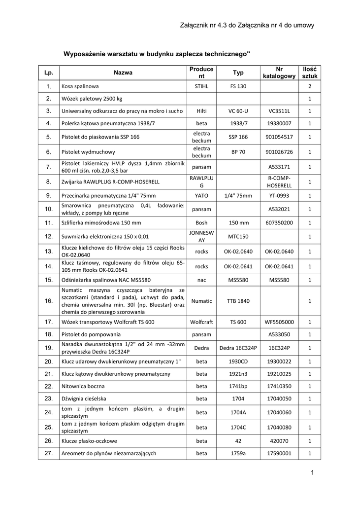 Załącznik nr 4.3 do Załącznika nr 4 do umowy Wyposażenie warsztatu w budynku zaplecza technicznego" Lp. Nazwa Produce nt Typ STIHL FS 130 Nr katalogowy Ilość sztuk 1. Kosa spalinowa 2. Wózek paletowy 2500 kg 3. Uniwersalny odkurzacz do pracy na mokro i sucho Hilti VC 60-U VC3511L 1 4. Polerka kątowa pneumatyczna 1938/7 beta 1938/7 19380007 1 5. Pistolet do piaskowania SSP 166 SSP 166 901054517 1 6. Pistolet wydmuchowy BP 70 901026726 1 7. Pistolet lakierniczy HVLP dysza 1,4mm zbiornik 600 ml ciśn. rob.2,0-3,5 bar pansam A533171 1 8. Zwijarka RAWLPLUG R-COMP-HOSERELL RAWLPLU G R-COMPHOSERELL 1 9. Przecinarka pneumatyczna 1/4" 75mm YT-0993 1 10. Smarownica pneumatyczna wkłady, z pompy lub ręczne A532021 1 11. Szlifierka mimośrodowa 150 mm 607350200 1 12. Suwmiarka elektroniczna 150 x 0,01 13. 14. 2 1 electra beckum electra beckum 0,4L YATO ładowanie: Klucze kielichowe do filtrów oleju 15 części Rooks OK-02.0640 Klucz taśmowy, regulowany do filtrów oleju 65105 mm Rooks OK-02.0641 1/4" 75mm pansam Bosh 150 mm JONNESW AY MTC150 rocks OK-02.0640 OK-02.0640 1 rocks OK-02.0641 OK-02.0641 1 nac MS5580 MS5580 1 15. Odśnieżarka spalinowa NAC MS5580 16. Numatic maszyna czyszcząca bateryjna ze szczotkami (standard i pada), uchwyt do pada, chemia uniwersalna min. 30l (np. Bluestar) oraz chemia do pierwszego szorowania Numatic TTB 1840 17. Wózek transportowy Wolfcraft TS 600 Wolfcraft TS 600 18. Pistolet do pompowania 19. Nasadka dwunastokątna 1/2" od 24 mm -32mm przywieszka Dedra 16C324P 20. pansam 1 1 WF5505000 1 A533050 1 Dedra Dedra 16C324P 16C324P 1 Klucz udarowy dwukierunkowy pneumatyczny 1" beta 1930CD 19300022 1 21. Klucz kątowy dwukierunkowy pneumatyczny beta 1921n3 19210025 1 22. Nitownica boczna beta 1741bp 17410350 1 23. Dźwignia cieśelska beta 1704 17040050 1 beta 1704A 17040060 1 beta 1704C 17040080 1 24. 25. Łom z jednym końcem płaskim, a drugim spiczastym Łom z jednym końcem płaskim odgiętym drugim spiczastym 26. Klucze płasko-oczkowe beta 42 420070 1 27. Areometr do płynów niezamarzających beta 1759a 17590001 1 1 Załącznik nr 4.3 do Załącznika nr 4 do umowy 28. Zestaw dwóch wsporników beta 3010t6 30100006 1 29. AG 125-A22 Akumulatorowa szlifierka kątowa hilti Set AG 125-A22 + B 22/3.3 (2) 2062086 1 30. WSR 22-A Akumulatorowa piła szablasta hilti WSR 22-A 2031936 1 31. Wiertarka stołowa B-1316B/400 proma B-1316B/400 25401303 1 32. Wiertarka udarowa Bosch GSB 19-2 Bosh GSB 19-2 RE ZUW 060117B600 1 33. Klucz pneumatyczny krótki beta BE1930hla 34. Klucz z przekładnia 4800Nm 35. 36. ŚCIĄGACZ HYDRAULICZNY DO ŁOŻYSK 20 TON GEKO IMADŁO ŚLUSARSKIE MAXSTEEL, OBROTOWE 150m 1 1 GEKO 1 Stanley 83-068 2 GEKO Profit G02304 1 37. Imadło ślusarskie OBROTOWE 200mm 38. Giętarka do rur z napędem elektrycznym xzl60-3 39. Gwintownica ręczna EVA R 3/8” 1/2” 3/4” 1” 11/4” 11/2” 2” 40. Szlifierka dwutarczowa 1 41. Przecinarka do metalu fi100 1 42. Szlifierka kątowa Bosch GWS 24-230 LVI Bosh GWS 24-230 LVI 0601893F00 1 43. Szlifierka kątowa Bosch GWS 1000 Bosh GWS 1000 601821800 1 44. Przecinaki 3 45. Młotki ( 200 gram,500 gram, 1kg., 1,5 kg., 2kg.) 5 46. Młotek igłowy pneumatyczny Beta 1944 47. Klucze do pobijania oczkowe od 24-65 1 48. Zestaw kombinerek i kleszczy xxl 200mm 1 49. Zestaw kluczy oczkowo-widlastych 6-32 mm 2 50. Zestaw kluczy nasadowych 6-32 mm 1 51. klucz dynamometryczny 60-330Nm 1/2 cala BETA 667/30 6670130 1 52. klucz dynamometryczny 300-1000 Nm 3/4 cala beta 678/C100 6780610 1 53. Klucze z grzechotka płasko-oczkowe łamane 8-22 1 54. Wkrętaki do pobijania (śrubokręty) 1 55. Klucze oczkowe jednostronne od 30do 65 w77a1 1 56. Przedłużki do klucza oczkowego jednostronnego w 77a (30), w77h01, w77h04 1 57. Klucz do rur fi (80) 6 58. Klucz do rur fi (60) 1 59. Klucz do rur fi (25) 1 1 rems EVA R Beta 520016 1944 1 1 2 Załącznik nr 4.3 do Załącznika nr 4 do umowy 60. Łom 1700mm 1 61. Łom 1500mm 1 62. Łom 1000mm 1 63. Zwijadła automatyczne ciśnieniowym 64. 50 [m] węża ciśnieniowego na bębnie 12 [bar] 1 65. 50 [m] węża do wody 3/4" na bębnach 25 [m] 1 66. Akumulatorowa wkrętarka stalowych 1500 Nm 4 67. Pompki pneumatyczne ( na paliwo , chemie, oleje) 68. Wycinarka do uszczelek płaskich ze stosów 69. 70. z do przewodem Beta 1910 191030001 konstrukcji Wyciągnik ręczny łańcuchowy + zawieszenie klamrowe 1500kg Drabina aluminiowa wielofunkcyjna wysoka (wysuwana trzyelementowa) 2 4 Chesterto n 179 Promag Drobex 1 1 400,4001 1 71. Rozpieraki hydrauliczne 10 ton wraz z pompą Frame 1 72. Giętarka ręczna Gedore 1 73. Stanowisko do testowania i legalizacji zaworów bezpieczeństwa kompatybilne z rozmiarami zaworów zastosowanych na Obiekcie Radoszyn. Średnica przyłączeniowa zgodna ze średnicą gwintów i kołnierzy zastosowanych na zaworach 74. Wózek narzędziowy z 11 szufladami /kółka beta c38o 38000001 1 75. skrzynia narzędziowa boczna z 7 szufladami beta c38l 38000081 2 76. 77. 78. ZESTAW giętarka w walizce z narzędziami do obróbki rurek( WG. ZASTOSOWANEJ ARMATURY PNEUMATYCZNEJ) Pistolet do przedmuchiwania z regulacją strumienia powietrza Komplet 19 igieł do pneumatycznego młotka igłowego 1 Parker 1 beta 1949G 3 beta 1944AR BE1944AR 3 79. Uniwersalne magnetyczne pojemniki na butelki BETA 2499PF/M 24990050 5 80. Wózek transportowy beta CD23S 23000610 2 81. Taboret na kółkach beta 2252 22520001 4 82. Skrzynia narzędziowa z 5 szufladami beta C23ST O 23000521 2 83. Wykrętaki do uszkodzonych śrub i szpilek beta 1430/S8 143000108 1 84. Komplet wkrętaków rolkowych 1/2" beta 1434/c7 14340170 1 85. Nasadki specjalne do odkręcania uszkodzonych nakrętek beta 1428/SB11 14280111 1 86. Młotki bezodrzutowe pokryte guma beta 1391 13910155 4 87. Łącznik zmniejszający beta 729/15 7290810 1 3 Załącznik nr 4.3 do Załącznika nr 4 do umowy 88. Nasadki 1" 89. Zestawy wierteł do metalu-155 wierteł 90. 91. 92. 93. 94. 95. 96. WURT H WURT Tarcze do cięcia stali paczka (115,125,250) H WURT 