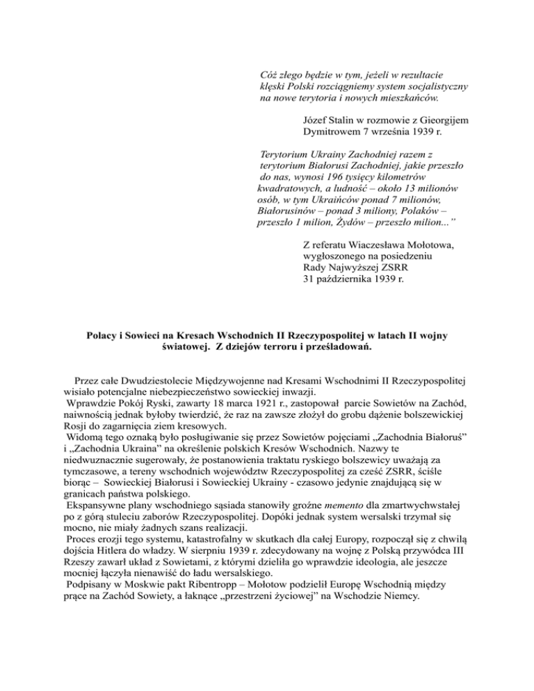 Cóż złego będzie w tym, jeżeli w rezultacie klęski Polski rozciągniemy system socjalistyczny na nowe terytoria i nowych mieszkańców. Józef Stalin w rozmowie z Gieorgijem Dymitrowem 7 września 1939 r. Terytorium Ukrainy Zachodniej razem z terytorium Białorusi Zachodniej, jakie przeszło do nas, wynosi 196 tysięcy kilometrów kwadratowych, a ludność – około 13 milionów osób, w tym Ukraińców ponad 7 milionów, Białorusinów – ponad 3 miliony, Polaków – przeszło 1 milion, Żydów – przeszło milion...” Z referatu Wiaczesława Mołotowa, wygłoszonego na posiedzeniu Rady Najwyższej ZSRR 31 października 1939 r. Polacy i Sowieci na Kresach Wschodnich II Rzeczypospolitej w latach II wojny światowej. Z dziejów terroru i prześladowań. Przez całe Dwudziestolecie Międzywojenne nad Kresami Wschodnimi II Rzeczypospolitej wisiało potencjalne niebezpieczeństwo sowieckiej inwazji. Wprawdzie Pokój Ryski, zawarty 18 marca 1921 r., zastopował parcie Sowietów na Zachód, naiwnością jednak byłoby twierdzić, że raz na zawsze złożył do grobu dążenie bolszewickiej Rosji do zagarnięcia ziem kresowych. Widomą tego oznaką było posługiwanie się przez Sowietów pojęciami „Zachodnia Białoruś” i „Zachodnia Ukraina” na określenie polskich Kresów Wschodnich. Nazwy te niedwuznacznie sugerowały, że postanowienia traktatu ryskiego bolszewicy uważają za tymczasowe, a tereny wschodnich województw Rzeczypospolitej za cześć ZSRR, ściśle biorąc – Sowieckiej Białorusi i Sowieckiej Ukrainy - czasowo jedynie znajdującą się w granicach państwa polskiego. Ekspansywne plany wschodniego sąsiada stanowiły groźne memento dla zmartwychwstałej po z górą stuleciu zaborów Rzeczypospolitej. Dopóki jednak system wersalski trzymał się mocno, nie miały żadnych szans realizacji. Proces erozji tego systemu, katastrofalny w skutkach dla całej Europy, rozpoczął się z chwilą dojścia Hitlera do władzy. W sierpniu 1939 r. zdecydowany na wojnę z Polską przywódca III Rzeszy zawarł układ z Sowietami, z którymi dzieliła go wprawdzie ideologia, ale jeszcze mocniej łączyła nienawiść do ładu wersalskiego. Podpisany w Moskwie pakt Ribentropp – Mołotow podzielił Europę Wschodnią między prące na Zachód Sowiety, a łaknące „przestrzeni życiowej” na Wschodzie Niemcy. 2 17 września 1939 r. Armia Czerwona przekroczyła wschodnią granicę Polski, by zająć tereny po Narew, Wisłę i San, przyznane Sowietom w układzie moskiewskim. Jeszcze w trakcie działań wojennych przeciwko Polsce, w końcu września 1939 r., Rosja Sowiecka i Niemcy podpisały kolejny układ – „o przyjaźni i granicy” – w którym linia rozgraniczenia między obu zaborczymi mocarstwami została przesunięta z Wisły na Bug. Stalin oddawał Hitlerowi Lubelszczyznę i część województwa warszawskiego, pragnąc uniknąć kłopotliwego z różnych względów wcielania tych czysto polskich terytoriów. Rekompensatą była zgoda Niemiec na włączenie Litwy do sowieckiej sfery interesów. Agresja ZSRR wydała społeczeństwo kresowe sowieckiemu barbarzyństwu, wsławionemu krwawymi czystkami, ludobójczą kolektywizacją rolnictwa i budzącym grozę GUŁagiem. Pierwszymi jego ofiarami na Kresach Wschodnich byli żołnierze Wojska Polskiego i funkcjonariusze Policji Państwowej, rozstrzeliwani przez zbrodniarzy w mundurach Armii Czerwonej już po dostaniu się do niewoli. A także osoby cywilne, z różnych przyczyn mordowane przez „wyzwolicieli” ze Wschodu. Do najbardziej wstrząsających zbrodni, popełnionych przez czerwonoarmistów we wrześniu 1939 r. należą morderstwa, do których doszło w Grodnie. Obrońcy miasta - żołnierze, policjanci, a także walczący z poświęceniem cywile - stawili nacierającym wojskom sowieckim zacięty opór. Rozwścieczeni poniesionymi stratami bolszewicy jeszcze w trakcie walk zastosowali niegodne, zbrodnicze metody, przywiązując schwytanych, nieletnich obrońców miasta do pancerzy czołgów w charakterze „żywych tarcz”. Tak zginął 13 – letni Polak, Tadeusz Jasiński. Krwawej zemsty na wielką skalę dokonali jednak dopiero po zdobyciu Grodna, rozstrzeliwując w różnych miejscach około 300 osób, biorących udział w jego obronie. Nie oszczędzono nawet bohaterskich harcerzy i uczniów... W nieodległych Sopoćkiniach żołnierze Armii Czerwonej pojmali i rozstrzelali gen. Józefa Olszynę – Wilczyńskiego, wraz z towarzyszącym mu adiutantem – kpt. Mieczysławem Strzemeskim. W Złoczowie sowiecki politruk aresztował, a następnie zastrzelił 10 osób, wśród nich zastępcę prokuratora w tym mieście M. S. Łukaszewskiego oraz naczelnika miejscowego więzienia W. W. Klimeckiego. W Tołstobabach z rąk Sowietów zginęła ziemianka Baranowska, właścicielka majątku Baranowo w województwie nowogródzkim. Krasnoarmiejcy oskarżyli ją o złe traktowanie robotników i na miejscu wymierzyli „sprawiedliwość”: Polkę rozebrano do naga, uderzono naganem w twarz i zastrzelono. Podobny los spotkał innego przedstawiciela warstwy ziemiańskiej, Huberta Lubomirskiego, właściciela majątku Aleksandria w powiecie rówieńskim. Raniony przez żołnierza sowieckiego, po „sądzie”, który skazał go na śmierć za zabranie chłopu krowy za zaległy czynsz - został dobity. Fala zbrodni, których sprawcami byli żołnierze Armii Czerwonej, a ofiarami polscy oficerowie, policjanci, ziemianie, osadnicy wojskowi, sędziowie, prokuratorzy i gajowi rozlała się na całe Kresy. Do dziś nie sporządzono pełnego ich rejestru. Dlatego też trudno precyzyjnie podać, ilu Polaków zamordowano w czasie agresji Sowietów na Polskę we wrześniu 1939 r. Bliska prawdy jest zapewne liczba kilku tysięcy, najczęściej podawana w opracowaniach historycznych. Morderstwa, popełnione w okresie działań wojennych, miały w części nieplanowany, „spontaniczny” charakter. Trzeba jednak pamiętać, że z