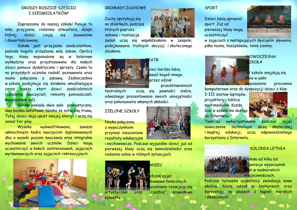 DRODZY RODZICE SZEŚCIO I SIEDMIOLATKÓW! Zapraszamy do naszej szkoły! Panuje tu miła, przyjazna, rodzinna atmosfera, dzięki której dzieci czują się zauważone i dowartościowane. Szkoła jest przyjazna sześciolatkom, posiada bogato urządzoną salę zabaw. Oprócz tego, klasy wyposażone są w kolorowe wykładziny oraz przystosowane dla małych dzieci pomoce dydaktyczne i sprzęty. Czeka tu na przyszłych uczniów radość poznawania oraz nauka połączona z zabawą. Jednocześnie w szkole podejmuje się działania umożliwiające coraz lepszy start dzieci sześcioletnich (szkolenia nauczycieli, remonty pomieszczeń, wyposażenie sal). Szkoła posiada dwie sale gimnastyczne, dwa boiska asfaltowe, boisko ze sztuczną trawą. Tutaj dzieci dają upust swojej energii i uczą się zasad fair play. Wysoko wykwalifikowana, zawsze uśmiechnięta kadra nauczycieli dyplomowanych dba o wysoki poziom nauczania oraz integralne wychowanie swoich uczniów. Dzieci mogą uczestniczyć w kołach zainteresowań, zajęciach wyrównawczych oraz zajęciach rekreacyjnych. GROMADY ZUCHOWE SPORT Zuchy spotykają się na zbiórkach, podczas których poprzez zabawę i realizację zadań uczą się współdziałania w zespole, podejmowania trafnych decyzji i skutecznego działania. Dzieci lubią uprawiać sport. Już od pierwszej klasy mogą uczestniczyć w zajęciach z następujących dyscyplin: pływanie, piłka nożna, koszykówka, tenis ziemny. TEATR Dzieci bardzo lubią udawać kogoś innego. Poprzez udział w przedstawieniach teatralnych uczą się pewności siebie, odważnego prezentowania swoich umiejętności oraz pokonywania własnych słabości. ZIELONE SZKOŁY Nauka połączona z wypoczynkiem przynosi nieocenione rezultaty edukacyjne i wychowawcze. Podczas wyjazdów dzieci już od pierwszej klasy uczą się samodzielności oraz radzenia sobie w różnych sytuacjach. TANIEC artystycznie sylwetkę. oraz Podczas zajęć zabawowo-tanecznych uczniowie rozwijają się „rzeźbią” prawidłową NOWOCZESNA SZKOŁA W szkole znajdują się dwie w pełni wyposażone pracownie komputerowe oraz do dyspozycji dzieci z klas I–III zestaw laptopów, projektory i tablica multimedialna. Każda sala w szkole ma dostęp do Internetu. Twórczo wykorzystywane podczas zajęć nowoczesne technologie służą skutecznej i mądrej edukacji, uczą odpowiedzialnego korzystania z Internetu. KOLONIA LETNIA Szkoła od kilku lat organizuje wypoczynek letni w nadmorskich miejscowościach. Podczas turnusów uczestnicy zwiedzają nowe okolice, biorą udział w konkursach oraz korzystają na plażach z kąpieli morskich i słonecznych. NASZYM UCZNIOM ZAPEWNIAMY: ☺ miłą, rodzinną atmosferę oraz życzliwe podejście nauczycieli do uczniów, ☺ wysoki poziom kształcenia oraz integralne wychowanie w kolorowych bogato wyposażonych salach dostosowanych do dzieci sześcioletnich, ☺ indywidualizację w nauczaniu, ☺ możliwość uczestniczenia w konkursach na szczeblu szkolnym, rejonowym, wojewódzkim i ogólnopolskim, ☺ bezpieczeństwo, monitoring (realizacja licznych programów profilaktycznych), ☺ dostęp do nowoczesnych technologii informatycznych, ☺ opiekę pedagoga, psychologa i pielęgniarki, ☺ wyjazdy i imprezy integrujące dzieci, rodziców i nauczycieli, np.: wycieczki, rajdy, zielone szkoły, zabawy, kuligi, ogniska, cykliczne uroczystości (piknik szkolny), ☺ interesujące zajęcia (piłka nożna, mini koszykówka, mini tenis, basen, koła zainteresowań, zajęcia taneczne, teatralne, indywidualna gra na instrumentach), ☺ możliwość pracy w gromadach zuchowych, ☺ bogatą ofertę kulturalną (wyjścia do muzeów, kina i teatru, spotkania z ciekawymi ludźmi, ☺ udział w projektach edukacyjnych i wychowawczych. ☺ ciepłą herbatkę podczas przerw śniadaniowych, ☺ opiekę świetlicy szkolnej w godzinach od 6.30 do 17.00, ☺ możliwość korzystania ze stołówki szkolnej. NASZE TRADYCJE: Szkolny Piknik Rodzinny, Ogólnopolski i Międzynarodowy Konkurs Recytatorski im. Wł. Broniewskiego, Ślubowanie Klas Pierwszych, Przegląd Kolęd i Pastorałek, Pożegnanie lata na sportowo, Wigilijne spotkania, Dni Otwarte Szkoły, Akcje charytatywne, Integracja ze środowiskiem lokalnym, Zawody pływackie „Już pływam”, Współpraca zagraniczna młodzieży „Lubię chodzić do szkoły, bo tutaj mam przyjaciół i uczę się wielu ciekawych rzeczy” Julka lat 6, klasa I PIERWSZAKU! U nas Ci będzie najlepiej! do naszej szkoły! Zespół Szkół Sportowych ul. Zbylitowska 7 33 – 101 Tarnów Tel. 14 633 15 17 www.zss.tarnow.pl e-mail: [email protected]