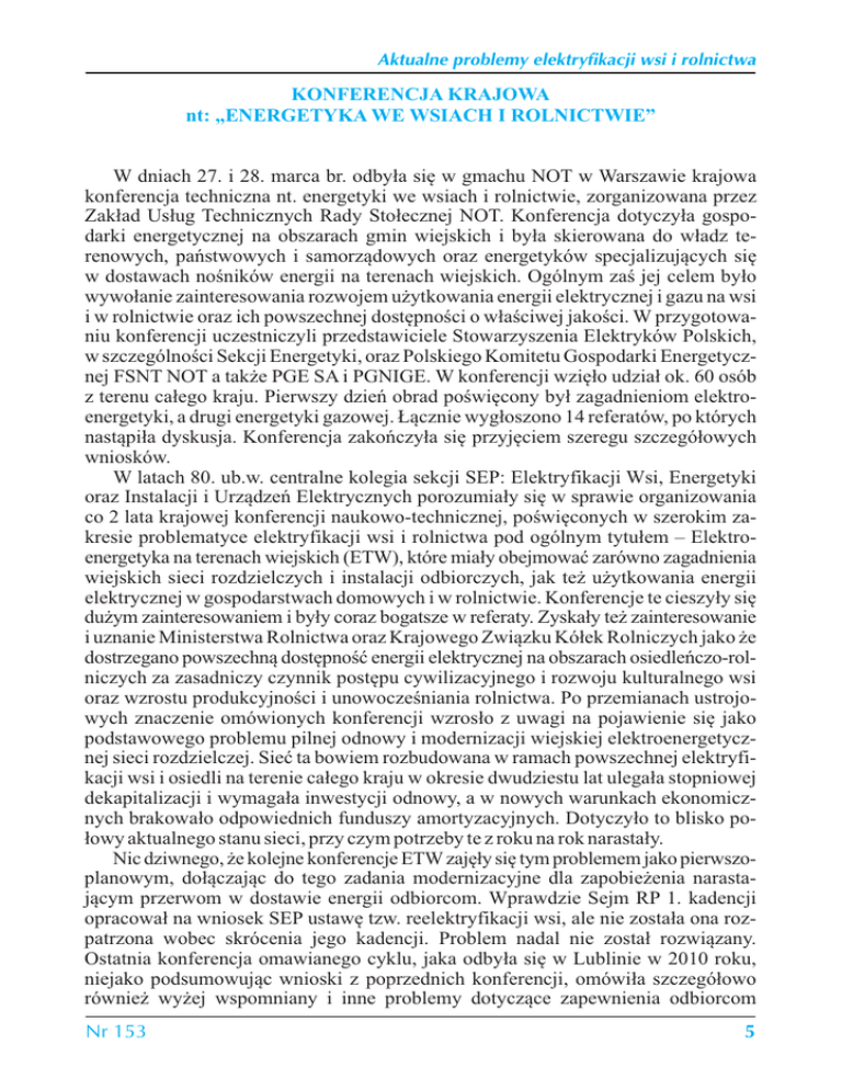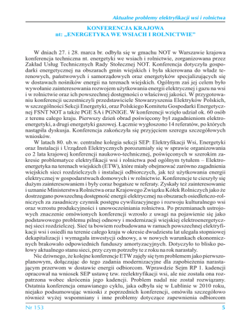 Aktualne problemy elektryfikacji wsi i rolnictwa KONFERENCJA KRAJOWA nt: „ENERGETYKA WE WSIACH I ROLNICTWIE” W dniach 27. i 28. marca br. odbyła się w gmachu NOT w Warszawie krajowa konferencja techniczna nt. energetyki we wsiach i rolnictwie, zorganizowana przez Zakład Usług Technicznych Rady Stołecznej NOT. Konferencja dotyczyła gospodarki energetycznej na obszarach gmin wiejskich i była skierowana do władz terenowych, państwowych i samorządowych oraz energetyków specjalizujących się w dostawach nośników energii na terenach wiejskich. Ogólnym zaś jej celem było wywołanie zainteresowania rozwojem użytkowania energii elektrycznej i gazu na wsi i w rolnictwie oraz ich powszechnej dostępności o właściwej jakości. W przygotowaniu konferencji uczestniczyli przedstawiciele Stowarzyszenia Elektryków Polskich, w szczególności Sekcji Energetyki, oraz Polskiego Komitetu Gospodarki Energetycznej FSNT NOT a także PGE SA i PGNIGE. W konferencji wzięło udział ok. 60 osób z terenu całego kraju. Pierwszy dzień obrad poświęcony był zagadnieniom elektroenergetyki, a drugi energetyki gazowej. Łącznie wygłoszono 14 referatów, po których nastąpiła dyskusja. Konferencja zakończyła się przyjęciem szeregu szczegółowych wniosków. W latach 80. ub.w. centralne kolegia sekcji SEP: Elektryfikacji Wsi, Energetyki oraz Instalacji i Urządzeń Elektrycznych porozumiały się w sprawie organizowania co 2 lata krajowej konferencji naukowo-technicznej, poświęconych w szerokim zakresie problematyce elektryfikacji wsi i rolnictwa pod ogólnym tytułem – Elektroenergetyka na terenach wiejskich (ETW), które miały obejmować zarówno zagadnienia wiejskich sieci rozdzielczych i instalacji odbiorczych, jak też użytkowania energii elektrycznej w gospodarstwach domowych i w rolnictwie. Konferencje te cieszyły się dużym zainteresowaniem i były coraz bogatsze w referaty. Zyskały też zainteresowanie i uznanie Ministerstwa Rolnictwa oraz Krajowego Związku Kółek Rolniczych jako że dostrzegano powszechną dostępność energii elektrycznej na obszarach osiedleńczo-rolniczych za zasadniczy czynnik postępu cywilizacyjnego i rozwoju kulturalnego wsi oraz wzrostu produkcyjności i unowocześniania rolnictwa. Po przemianach ustrojowych znaczenie omówionych konferencji wzrosło z uwagi na pojawienie się jako podstawowego problemu pilnej odnowy i modernizacji wiejskiej elektroenergetycznej sieci rozdzielczej. Sieć ta bowiem rozbudowana w ramach powszechnej elektryfikacji wsi i osiedli na terenie całego kraju w okresie dwudziestu lat ulegała stopniowej dekapitalizacji i wymagała inwestycji odnowy, a w nowych warunkach ekonomicznych brakowało odpowiednich funduszy amortyzacyjnych. Dotyczyło to blisko połowy aktualnego stanu sieci, przy czym potrzeby te z roku na rok narastały. Nic dziwnego, że kolejne konferencje ETW zajęły się tym problemem jako pierwszoplanowym, dołączając do tego zadania modernizacyjne dla zapobieżenia narastającym przerwom w dostawie energii odbiorcom. Wprawdzie Sejm RP 1. kadencji opracował na wniosek SEP ustawę tzw. reelektryfikacji wsi, ale nie została ona rozpatrzona wobec skrócenia jego kadencji. Problem nadal nie został rozwiązany. Ostatnia konferencja omawianego cyklu, jaka odbyła się w Lublinie w 2010 roku, niejako podsumowując wnioski z poprzednich konferencji, omówiła szczegółowo również wyżej wspomniany i inne problemy dotyczące zapewnienia odbiorcom Nr 153 5 Aktualne problemy elektryfikacji wsi i rolnictwa wiejskim dostawy energii elektrycznej w potrzebnej ilości i o właściwej jakości. Niestety wnioski w sprawie ich rozwiązania, jak też inne na przykład w sprawie złego stanu instalacji odbiorczych w obiektach wiejskich, grożącego porażeniem elektrycznym ludzi i zwierząt oraz pożarami budynków, nie zostały rozesłane do decydentów. Omawiana, tegoroczna konferencja NOT nt. energetyki we wsiach i rolnictwie (EWR’12) była w części dotyczącej elektroenergetyki kontynuacją konferencji ETW. Na konferencji w pierwszym dniu obrad wygłoszono następujące referaty: · Potrzeby energetyczne polskich wsi i rolnictwa – Stanisław Krakowiak, SEP · Wiejskie sieci elektroenergetyczne odnowa i modernizacja – Lech Bożentowicz, SEP · Potrzeby rozwojowe i modernizacyjne sieci elektroenergetycznych oraz możliwości ich współfinansowania z funduszy pomocowych – Magdalena Krauwicka oraz Elżbieta i Ryszard Niewiedziałowie – SEP, PTP i REE · Automatyzacja sieci wiejskich średniego napięcia – ABB Sp.z o.o. · Poprawa jakości dostaw energii elektrycznej poprzez stosowanie nowoczesnych technik eksploatacji sieci na terenach wiejskich – Bogumił Dudek · Stan instalacji elektrycznych w obiektach wiejskich – Andrzej Boczkowski, SEP · Zagrożenie porażeniem prądem elektrycznym i ochrona przeciwporażeniowa na wsi – Witold Jabłoński, Politechnika Wrocławska · Usługi elektrotechniczne na wsi – Stanisław Krakowiak, SEP · System LIXOS sterowanie i zarządzanie oświetleniem zewnętrznym oraz ulicznym w miastach i gminach – Lukasz Niemczycki, Vossloch-Schwabe GmbH Polska · Polskie dokumenty normatywne dotyczące wiejskich instalacji elektrycznych na tle normatywów międzynarodowych i europejskich – Witold Jabłoński, Politechnika Wrocławska Po prezentacji referatów odbyła się ogólna debata. Na podstawie referatów i debaty opracowano wnioski szczegółowe. Stanisław Krakowiak [email protected] 6