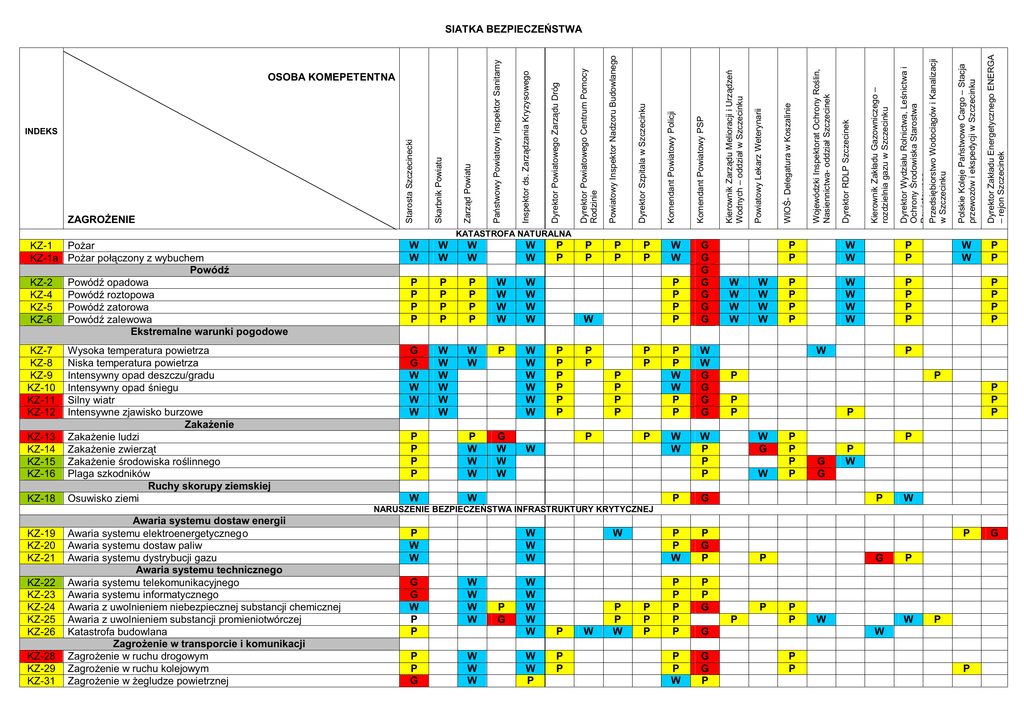 Polskie Koleje Państwowe Cargo – Stacja przewozów i ekspedycji w Szczecinku Dyrektor Zakładu Energetycznego ENERGA – rejon Szczecinek Dyrektor Wydziału Rolnictwa, Leśnictwa i Ochrony Środowiska Starostwa Powiatowego Przedsiębiorstwo Wodociągów i Kanalizacji w Szczecinku Kierownik Zakładu Gazowniczego – rozdzielnia gazu w Szczecinku Dyrektor RDLP Szczecinek Wojewódzki Inspektorat Ochrony Roślin, Nasiennictwa- oddział Szczecinek WIOŚ- Delegatura w Koszalinie Powiatowy Lekarz Weterynarii Kierownik Zarządu Melioracji i Urządzeń Wodnych – oddział w Szczecinku Komendant Powiatowy PSP Komendant Powiatowy Policji Dyrektor Szpitala w Szczecinku Powiatowy Inspektor Nadzoru Budowlanego Dyrektor Powiatowego Centrum Pomocy Rodzinie Dyrektor Powiatowego Zarządu Dróg Zarząd Powiatu Skarbnik Powiatu ZAGROŻENIE Starosta Szczecinecki INDEKS Inspektor ds. Zarządzania Kryzysowego OSOBA KOMEPETENTNA Państwowy Powiatowy Inspektor Sanitarny SIATKA BEZPIECZEŃSTWA W W P P KATASTROFA NATURALNA KZ-1 Pożar KZ-1a Pożar połączony z wybuchem Powódź KZ-2 Powódź opadowa KZ-4 Powódź roztopowa KZ-5 Powódź zatorowa KZ-6 Powódź zalewowa Ekstremalne warunki pogodowe W W W W W W P P P P P P P P P P P P W W W W W W W W KZ-7 KZ-8 KZ-9 KZ-10 KZ-11 KZ-12 G G W W W W W W W W W W W W P W W W W W W KZ-13 KZ-14 KZ-15 KZ-16 KZ-18 Wysoka temperatura powietrza Niska temperatura powietrza Intensywny opad deszczu/gradu Intensywny opad śniegu Silny wiatr Intensywne zjawisko burzowe Zakażenie Zakażenie ludzi Zakażenie zwierząt Zakażenie środowiska roślinnego Plaga szkodników Ruchy skorupy ziemskiej Osuwisko ziemi P P P P P W W W W W W W G W W W P P P P P P P P W P P P P P P P P P P P P P P P P W W W P P P P G G G G G G G P P W W P P W W G G G G W W W P P P P G P P W P G P P P P P P P P G P P W G G P W W W W W W W W P P W W P P P P P P W W W W P P P P W P P P P P P P P P P P P P W G W P P P P P G G P W P W NARUSZENIE BEZPIECZEŃSTWA INFRASTRUKTURY KRYTYCZNEJ KZ-19 KZ-20 KZ-21 KZ-22 KZ-23 KZ-24 KZ-25 KZ-26 KZ-28 KZ-29 KZ-31 Awaria systemu dostaw energii Awaria systemu elektroenergetycznego Awaria systemu dostaw paliw Awaria systemu dystrybucji gazu Awaria systemu technicznego Awaria systemu telekomunikacyjnego Awaria systemu informatycznego Awaria z uwolnieniem niebezpiecznej substancji chemicznej Awaria z uwolnieniem substancji promieniotwórczej Katastrofa budowlana Zagrożenie w transporcie i komunikacji Zagrożenie w ruchu drogowym Zagrożenie w ruchu kolejowym Zagrożenie w żegludze powietrznej P W W W W W G G W P P W W W W P P G W W W P G W W W W W W W P W P P P W P P W P P P P P P P G P P G W P W P W P P P G KZ-33 KZ-34 KZ-35 KZ-36 KZ-37 KZ-38 Zachwianie systemu usług społecznych Zachwianie systemu finansowego Zachwianie systemu zaopatrzenia w żywność Zachwianie systemu zaopatrzenia w wodę Zachwianie systemu ochrony zdrowia Zachwianie sprawności działania administracji publicznej Zachwianie zdolności działania służb ratowniczych W G G P G G G P P W P P P P W W P P P W W W W W P P W W W P P P P P P W P W P G G P G G P G W P P W P P W P P G P W P W W W NARUSZENIE BEZPIECZEŃSTWA PORZĄDKU PUBLICZNEGO KZ-39 KZ-40 KZ-41 KZ-42 KZ-43 KZ-44 KZ-45 KZ-46 P P G P P G P G Zagrożenie terrorystyczne Zamieszki Migracja ludności Zagrożenie bezpieczeństwa imprezy masowej Zgromadzenie z dużą ilością uczestników Niepokoje społeczne Znalezisko przedmiotów niebezpiecznych Zagrożenia strukturalne G GŁOWNY WYKONAWCA DZIAŁAŃ REAGOWANIA KRYZYSOWEGO KZ-..............Ryzyko minimalne W KZ-…………Ryzyko małe P W P P P W P P W P W P W W W W W W W W W W P W W W P P P P P P W P P W W W LEGENDA WSPIERAJĄCY GŁÓWNEGO WYKONAWCĘ DZIAŁAŃ REAGOWANIA KRYZYSOWEGO KZ-……..Ryzyko średnie P P P P W P W W POMAGAJĄCY GŁÓWNEMU WYKONAWCY DZIAŁAŃ REAGOWANIA KRYZYSOWEGO KZ-……..Ryzyko duże KZ-…….Ryzyko ekstremalne