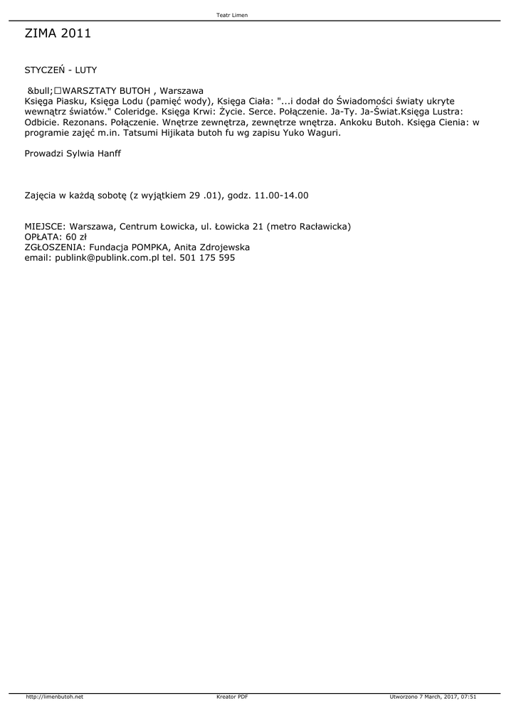 Teatr Limen ZIMA 2011 STYCZEŃ - LUTY •WARSZTATY BUTOH , Warszawa Księga Piasku, Księga Lodu (pamięć wody), Księga Ciała: "...i dodał do Świadomości światy ukryte wewnątrz światów." Coleridge. Księga Krwi: Życie. Serce. Połączenie. Ja-Ty. Ja-Świat.Księga Lustra: Odbicie. Rezonans. Połączenie. Wnętrze zewnętrza, zewnętrze wnętrza. Ankoku Butoh. Księga Cienia: w programie zajęć m.in. Tatsumi Hijikata butoh fu wg zapisu Yuko Waguri. Prowadzi Sylwia Hanff Zajęcia w każdą sobotę (z wyjątkiem 29 .01), godz. 11.00-14.00 MIEJSCE: Warszawa, Centrum Łowicka, ul. Łowicka 21 (metro Racławicka) OPŁATA: 60 zł ZGŁOSZENIA: Fundacja POMPKA, Anita Zdrojewska email: [email protected] tel. 501 175 595 http://limenbutoh.net Kreator PDF Utworzono 7 March, 2017, 07:51