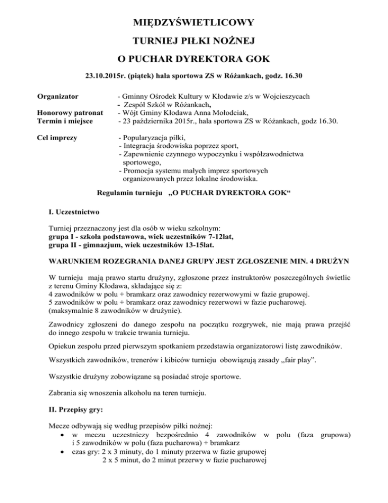 MIĘDZYŚWIETLICOWY TURNIEJ PIŁKI NOŻNEJ O PUCHAR DYREKTORA GOK 23.10.2015r. (piątek) hala sportowa ZS w Różankach, godz. 16.30 Organizator Honorowy patronat Termin i miejsce - Gminny Ośrodek Kultury w Kłodawie z/s w Wojcieszycach - Zespół Szkół w Różankach, - Wójt Gminy Kłodawa Anna Mołodciak, - 23 października 2015r., hala sportowa ZS w Różankach, godz 16.30. - Popularyzacja piłki, - Integracja środowiska poprzez sport, - Zapewnienie czynnego wypoczynku i współzawodnictwa sportowego, - Promocja systemu małych imprez sportowych organizowanych przez lokalne środowiska. Cel imprezy Regulamin turnieju „O PUCHAR DYREKTORA GOK“ I. Uczestnictwo Turniej przeznaczony jest dla osób w wieku szkolnym: grupa I - szkoła podstawowa, wiek uczestników 7-12lat, grupa II - gimnazjum, wiek uczestników 13-15lat. WARUNKIEM ROZEGRANIA DANEJ GRUPY JEST ZGŁOSZENIE MIN. 4 DRUŻYN W turnieju mają prawo startu drużyny, zgłoszone przez instruktorów poszczególnych świetlic z terenu Gminy Kłodawa, składające się z: 4 zawodników w polu + bramkarz oraz zawodnicy rezerwowymi w fazie grupowej. 5 zawodników w polu + bramkarz oraz zawodnicy rezerwowi w fazie pucharowej. (maksymalnie 8 zawodników w drużynie). Zawodnicy zgłoszeni do danego zespołu na początku rozgrywek, nie mają prawa przejść do innego zespołu w trakcie trwania turnieju. Opiekun zespołu przed pierwszym spotkaniem przedstawia organizatorowi listę zawodników. Wszystkich zawodników, trenerów i kibiców turnieju obowiązują zasady „fair play”. Wszystkie drużyny zobowiązane są posiadać stroje sportowe. Zabrania się wnoszenia alkoholu na teren turnieju. II. Przepisy gry: Mecze odbywają się według przepisów piłki nożnej: w meczu uczestniczy bezpośrednio 4 zawodników w polu (faza grupowa) i 5 zawodników w polu (faza pucharowa) + bramkarz czas gry: 2 x 3 minuty, do 1 minuty przerwa w fazie grupowej 2 x 5 minut, do 2 minut przerwy w fazie pucharowej w fazie pucharowej rozgrywany będzie jeden mecz decydujący o zwycięstwie danej drużyny w przypadku remisu dogrywka 2 x 2 minuty.. Jeśli dogrywka nie wyłoni zwycięzcy następuje seria rzutów karnych (3 strzały, a następnie do pierwszej wygranej serii) w fazie grupowej obowiązują przepisy zawarte w pkt. IV pt.: Punktacja rzuty z autu wykonywane są dowolnie ręką lub nogą zmiany zawodników lotne (bez konieczności zgłaszania ich sędziemu). Za złą zmianę zawodnika rzut wolny dla drużyny przeciwnej, za złą zmianę bramkarza rzut karny bramkarz po aucie bramkowym wybija piłkę dowolnie ręką lub nogą nie dalej niż poza obręb swojej połowy boiska nie obowiązuje przepis o spalonym podczas wykonywania stałych fragmentów gry zawodnicy drużyny przeciwnej muszą znajdować się co najmniej w odległości 5 m od piłki. rzut karny wykonywany jest z odległości 9m od bramki pozostałe przepisy zgodnie z przepisami PZPN-u III. Kary: Zawodnikom za niesportowe zachowanie grożą następujące kary, które są wymierzane przez sędziego prowadzącego spotkanie kara wykluczenia ze spotkania na 1 minutę kara wykluczenia ze spotkania na 2 minuty kara wykluczenia ze spotkania – drużyna gra w osłabieniu do końca meczu IV. Punktacja : za zwycięstwo drużyna otrzymuje 3 punkty, remis 1 punkt, za przegraną 0 punktów. za przegraną wskutek niestawiennictwa 0 pkt i wynik 0:3 w rozgrywkach w fazie grupowej kolejność zespołów ustalona zostanie na podstawie ilości dużych punktów. W przypadku gdy dwie drużyny uzyskają taką samą liczbę punktów o miejscu tych drużyn decyduje lepszy bilans bramek w przypadku uzyskania tej samej liczby punktów, przez więcej niż dwie drużyny o kolejności decyduje „mała tabela” uwzględniająca tylko mecze pomiędzy zainteresowanymi zespołami o zajętych miejscach decydują kolejno : - większa ilość zdobytych punktów - stosunek bramek, strzelone do straconych - większa liczba zdobytych bramek V. Zasady finansowania koszty organizacyjne turnieju pokrywają organizatorzy. VI. Nagrody drużyny, które zajmą I, II, III miejsca otrzymują pamiątkowe dyplomy, medale i puchary. Wójt Gminy Kłodawa ufundował puchar dla zawodnika, który zdobędzie największą ilość bramek w całym turnieju dyrektor ZS W Różankach ufundował puchar dla najlepszego bramkarza ZGŁOSZENIA DRUŻYN PRZYJMOWANE SĄ DO 21.10.2015 (środa) do godz. 14.00 drogą mailową: [email protected] lub tel.: 95 7 311 745