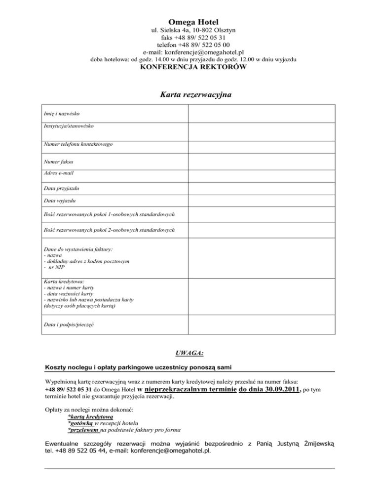 Omega Hotel ul. Sielska 4a, 10-802 Olsztyn faks +48 89/ 522 05 31 telefon +48 89/ 522 05 00 e-mail: [email protected] doba hotelowa: od godz. 14.00 w dniu przyjazdu do godz. 12.00 w dniu wyjazdu KONFERENCJA REKTORÓW Karta rezerwacyjna Imię i nazwisko Instytucja/stanowisko Numer telefonu kontaktowego Numer faksu Adres e-mail Data przyjazdu Data wyjazdu Ilość rezerwowanych pokoi 1-osobowych standardowych Ilość rezerwowanych pokoi 2-osobowych standardowych Dane do wystawienia faktury: - nazwa - dokładny adres z kodem pocztowym - nr NIP Karta kredytowa: - nazwa i numer karty - data ważności karty - nazwisko lub nazwa posiadacza karty (dotyczy osób płacących kartą) Data i podpis/pieczęć UWAGA: Koszty noclegu i opłaty parkingowe uczestnicy ponoszą sami Wypełnioną kartę rezerwacyjną wraz z numerem karty kredytowej należy przesłać na numer faksu: +48 89/ 522 05 31 do Omega Hotel w nieprzekraczalnym terminie do dnia 30.09.2011, po tym terminie hotel nie gwarantuje przyjęcia rezerwacji. Opłaty za noclegi można dokonać: *kartą kredytową *gotówką w recepcji hotelu *przelewem na podstawie faktury pro forma Ewentualne szczegóły rezerwacji można wyjaśnić bezpośrednio z Panią Justyną Żmijewską tel. +48 89 522 05 44, e-mail: [email protected].