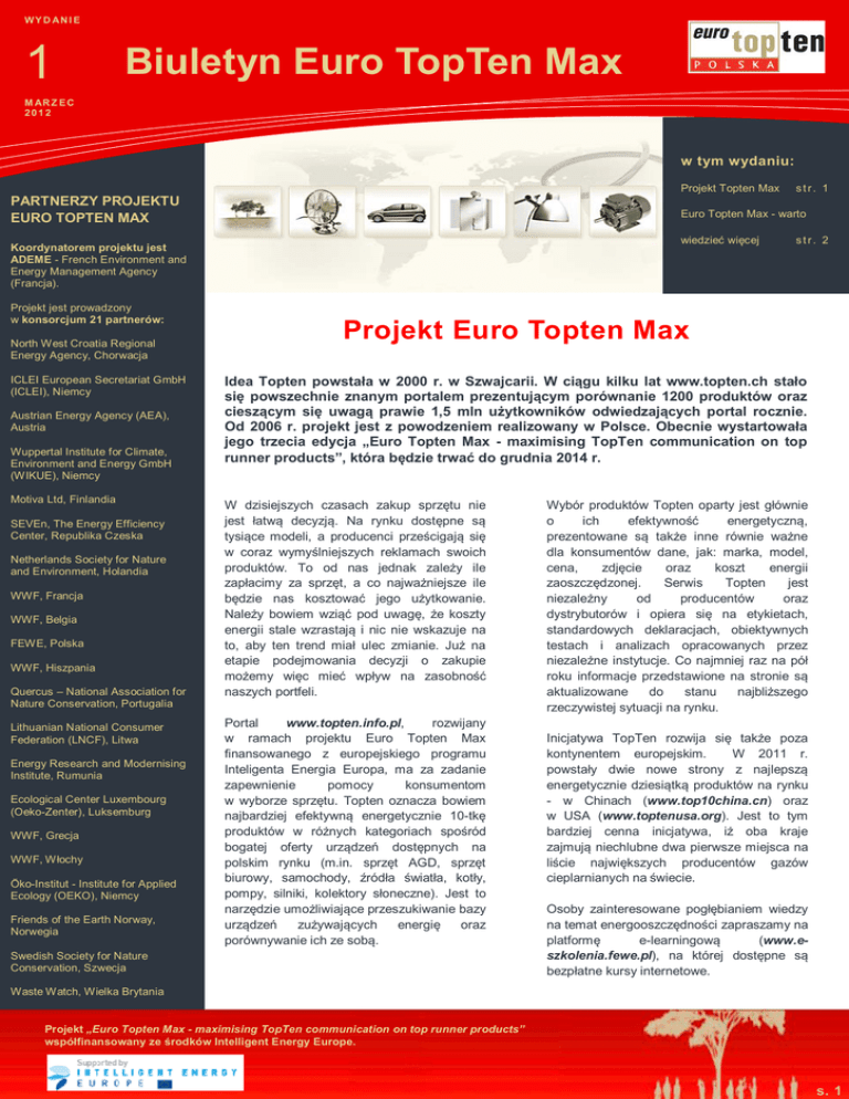 WY D AN I E 1 Biuletyn Euro TopTen Max M AR Z E C 2012 w tym wydaniu: Projekt Topten Max PARTNERZY PROJEKTU EURO TOPTEN MAX Euro Topten Max - warto wiedzieć więcej Koordynatorem projektu jest ADEME - French Environment and Energy Management Agency (Francja). Projekt jest prowadzony w konsorcjum 21 partnerów: North West Croatia Regional Energy Agency, Chorwacja ICLEI European Secretariat GmbH (ICLEI), Niemcy Austrian Energy Agency (AEA), Austria Wuppertal Institute for Climate, Environment and Energy GmbH (WIKUE), Niemcy Motiva Ltd, Finlandia SEVEn, The Energy Efficiency Center, Republika Czeska Netherlands Society for Nature and Environment, Holandia WWF, Francja WWF, Belgia FEWE, Polska WWF, Hiszpania Quercus – National Association for Nature Conservation, Portugalia Lithuanian National Consumer Federation (LNCF), Litwa Energy Research and Modernising Institute, Rumunia Ecological Center Luxembourg (Oeko-Zenter), Luksemburg WWF, Grecja WWF, Włochy Öko-Institut - Institute for Applied Ecology (OEKO), Niemcy Friends of the Earth Norway, Norwegia str. 1 str. 2 Projekt Euro Topten Max Idea Topten powstała w 2000 r. w Szwajcarii. W ciągu kilku lat www.topten.ch stało się powszechnie znanym portalem prezentującym porównanie 1200 produktów oraz cieszącym się uwagą prawie 1,5 mln użytkowników odwiedzających portal rocznie. Od 2006 r. projekt jest z powodzeniem realizowany w Polsce. Obecnie wystartowała jego trzecia edycja „Euro Topten Max - maximising TopTen communication on top runner products”, która będzie trwać do grudnia 2014 r. W dzisiejszych czasach zakup sprzętu nie jest łatwą decyzją. Na rynku dostępne są tysiące modeli, a producenci prześcigają się w coraz wymyślniejszych reklamach swoich produktów. To od nas jednak zależy ile zapłacimy za sprzęt, a co najważniejsze ile będzie nas kosztować jego użytkowanie. Należy bowiem wziąć pod uwagę, że koszty energii stale wzrastają i nic nie wskazuje na to, aby ten trend miał ulec zmianie. Już na etapie podejmowania decyzji o zakupie możemy więc mieć wpływ na zasobność naszych portfeli. Portal www.topten.info.pl, rozwijany w ramach projektu Euro Topten Max finansowanego z europejskiego programu Inteligenta Energia Europa, ma za zadanie zapewnienie pomocy konsumentom w wyborze sprzętu. Topten oznacza bowiem najbardziej efektywną energetycznie 10-tkę produktów w różnych kategoriach spośród bogatej oferty urządzeń dostępnych na polskim rynku (m.in. sprzęt AGD, sprzęt biurowy, samochody, źródła światła, kotły, pompy, silniki, kolektory słoneczne). Jest to narzędzie umożliwiające przeszukiwanie bazy urządzeń zużywających energię oraz porównywanie ich ze sobą. Swedish Society for Nature Conservation, Szwecja Wybór produktów Topten oparty jest głównie o ich efektywność energetyczną, prezentowane są także inne równie ważne dla konsumentów dane, jak: marka, model, cena, zdjęcie oraz koszt energii zaoszczędzonej. Serwis Topten jest niezależny od producentów oraz dystrybutorów i opiera się na etykietach, standardowych deklaracjach, obiektywnych testach i analizach opracowanych przez niezależne instytucje. Co najmniej raz na pół roku informacje przedstawione na stronie są aktualizowane do stanu najbliższego rzeczywistej sytuacji na rynku. Inicjatywa TopTen rozwija się także poza kontynentem europejskim. W 2011 r. powstały dwie nowe strony z najlepszą energetycznie dziesiątką produktów na rynku - w Chinach (www.top10china.cn) oraz w USA (www.toptenusa.org). Jest to tym bardziej cenna inicjatywa, iż oba kraje zajmują niechlubne dwa pierwsze miejsca na liście największych producentów gazów cieplarnianych na świecie. Osoby zainteresowane pogłębianiem wiedzy na temat energooszczędności zapraszamy na platformę e-learningową (www.eszkolenia.fewe.pl), na której dostępne są bezpłatne kursy internetowe. Waste Watch, Wielka Brytania Projekt „Euro Topten Max - maximising TopTen communication on top runner products” współfinansowany ze środków Intelligent Energy Europe. s. 1 ZMIEŃMY NAWYKI! Jakkolwiek producenci by się nie starali, ważnym ogniwem we wprowadzaniu rozwiązań energooszczędnych są konsumenci. Nawet najbardziej efektywny energetycznie sprzęt nie spowoduje zmniejszenia zużycia energii, jeżeli nie zmienimy naszych przyzwyczajeń. Spośród urządzeń zasilanych energią elektryczną najwięcej energii zużywa sprzęt AGD (około 70%), a następnie źródła światła (około 20%). Użytkownik ma więc ogromny wpływ na to, ile zużyje energii poprzez zarówno wybór i zakup energooszczędnych urządzeń, jak i ich właściwą eksploatację. Dodatkowo duża ilość sprzętu w gospodarstwach domowych i okresowe jego wykorzystanie decydują, że znaczące zużycie energii elektrycznej wynika ze stanu tego sprzętu w fazie czuwania (stand-by). Niejednokrotnie urządzenia audio-video zużywają więcej prądu w stanie czuwania niż podczas nominalnej pracy. Nie możemy też zapominać, że w gospodarstwach domowych mamy duży, bo około 30-procentowy, udział sprzętu i urządzeń, których wiek przekracza 10 lat. Racjonalna i zgodna ze standardami recyklingu i utylizacji wymiana starych urządzeń na nowe, przynosi duże efekty energetyczne, ekonomiczne i ekologiczne. Przykładowo przy wymianie 20-letniej chłodziarkozamrażarki na nową, o mniejszym zużyciu energii , można zaoszczędzić około 450 kWh/rok, 200 zł/rok, a także zredukować emisję zanieczyszczeń o 1,1 kg SO2/rok i 450 kg CO2/rok. Euro Topten Max - warto wiedzieć więcej W ostatnich latach bardzo modnym hasłem jest oszczędzanie energii. Jedni przechodzą obok niego obojętnie, drudzy próbują wprowadzać je w życie. Tak powstało konsorcjum 22 partnerów z różnych państw europejskich, którzy wspólnymi siłami realizują projekt Euro Topten Max, finansowany ze środków Intelligent EnergyEurope. W dzisiejszych czasach, w dobie gwa