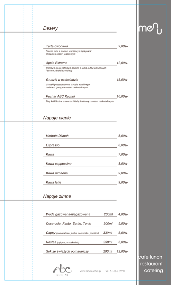 Desery Tarta owocowa 9,00zł- Krucha tarta z musem waniliowym i jeżynami skropiona sosem jagodowym Apple Extreme 12,00zł- Domowe ciasto jabłkowe podane z kulką lodów waniliowych i sosem z białej czekolady Gruszki w czekoladzie 15,00zł- Gruszki poszetowane w syropie waniliowym podane z gorącym sosem czekoladowym Puchar ABC Kuchni 16,00zł- Trzy kulki lodów z owocami i bitą śmietaną z sosem czekoladowym Napoje ciepłe Herbata Dilmah 5,00zł- Espresso 6,00zł- Kawa 7,00zł- Kawa cappuccino 8,00zł- Kawa mrożona 9,00zł- Kawa latte 9,00zł- Napoje zimne Woda gazowana/niegazowana 200ml 4,00zł- Coca-cola, Fanta, Sprite, Tonic 200ml 5,00zł- Cappy (pomarańcza, jabłko, porzeczka, pomidor) 330ml 5,00zł- Nestea (cytryna, brzoskwinia) 250ml 5,00zł- Sok ze świeżych pomarańczy 200ml 12,00zł- www.abckuchni.pl tel. 61 665 89 94 cafe lunch restaurant catering