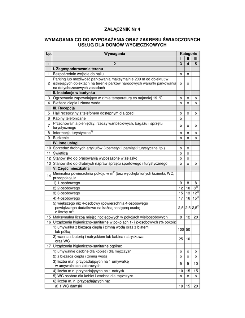 ZAŁĄCZNIK Nr 4 WYMAGANIA CO DO WYPOSAŻENIA ORAZ ZAKRESU ŚWIADCZONYCH USŁUG DLA DOMÓW WYCIECZKOWYCH Lp. Wymagania 1 2 I. Zagospodarowanie terenu Bezpośrednie wejście do hallu Parking lub możliwość parkowania maksymalnie 200 m od obiektu; w istniejących obiektach na terenie parków narodowych warunki parkowania na dotychczasowych zasadach II. Instalacje w budynku Ogrzewanie zapewniające w zimie temperaturę co najmniej 19 °C Bieżąca ciepła i zimna woda III. Recepcja Hall recepcyjny z telefonem dostępnym dla gości Kabiny telefoniczne Przechowalnia pieniędzy, rzeczy wartościowych, bagażu i sprzętu turystycznego Informacja turystyczna1) Budzenie IV. Inne usługi Sprzedaż drobnych artykułów (kosmetyki, pamiątki turystyczne itp.) Świetlica Stanowisko do prasowania wyposażone w żelazko Stanowisko do drobnych napraw sprzętu sportowego i turystycznego V. Część mieszkalna Minimalna powierzchnia pokoju w m2 (bez wyodrębnionych łazienki, WC, przedpokoju): 1) 1-osobowego 2) 2-osobowego 3) 3-osobowego 4) 4-osobowego 5) większego niż 4-osobowy (powierzchnia 4-osobowego powiększona dodatkowo na każdą następną osobę o liczbę m2) Maksymalna liczba miejsc noclegowych w pokojach wieloosobowych Urządzenia higieniczno-sanitarne w pokojach 1- i 2-osobowych (% pokoi): 1) umywalka z bieżącą ciepłą i zimną wodą oraz z blatem lub półką 2) wanna z baterią i natryskiem lub kabina natryskowa oraz WC Urządzenia higieniczno-sanitarne ogólne: 1) umywalnie osobne dla kobiet i dla mężczyzn 2) z bieżącą ciepłą i zimną wodą 3) liczba m.n. przypadających na 1 umywalkę w umywalniach zbiorowych 4) liczba m.n. przypadających na 1 natrysk 5) WC osobne dla kobiet i osobne dla mężczyzn 6) liczba m. n. przypadających na: a) 1 WC damski 1 2 3 4 5 6 7 8 9 10 11 12 13 14 15 16 17 Kategorie I II III 3 4 5 o o o o o o o o o o o o o o o o o o o o o o o o o o o o o o o o 9 8 8 12 10 82) 15 13 122) 17 16 152) 2,5 2,5 2,52) 8 12 20 100 50 25 10 o o o o o o 5 5 10 10 15 15 o o o 10 15 20 18 19 20 21 22 23 24 25 b) 1 WC męski 10 15 20 c) 1 pisuar w WC męskim 25 30 35 Wyposażenie dodatkowe urządzeń higieniczno-sanitarnych: 1) wieszaki na ręczniki i bieliznę osobistą o o o 2) lustro nad umywalką i półka o o o 3) oświetlenie nad lustrem o o 4) gniazdo elektryczne uniwersalne z osłoną o o o 5) kosz niepalny lub trudno zapalny o o o Meble w pokoju3): 1) łóżko o wymiarach min. 80 x 190 cm o o o 2) stół (minimum jeden dla 8 osób) o o o 3) krzesła (1 na osobę, nie mniej niż 2 na pokój)4) o o o 4) szafka, stolik lub półka przy każdym łóżku o o o 5) 5) szafa ubraniowa lub wnęka o o 6) lustro o o 7) kosz na śmieci niepalny lub trudno zapalny o o i popielniczka 8) lampka nocna (przy każdym łóżku w pokojach 1-4o o osobowych) 9) wieszak ścienny na okrycia wierzchnie o o o Wyposażenie dodatkowe pokoju: 1) radio (w pokojach 1- i 2- osobowych) o o 2) dywan lub chodnik o o 3) firanki, żaluzje lub rolety przepuszczające światło o o 4) zasłony dzienne, żaluzje lub rolety zaciemniające o o o 5) elementy dekoracyjne o o VI. Usługi gastronomiczne: Sprzedaż gorących napojów, także z automatów lub prowadzona przez o o o recepcję Wydzielona sala do przygotowywania posiłków we własnym zakresie i ich o o o spożywania Podawanie śniadań o o Jadłodajnia lub bar szybkiej obsługi o Restauracja o Objaśnienia znaków i odnośników: o wymaganie obowiązuje I dom wycieczkowy kategorii pierwszej II dom wycieczkowy kategorii drugiej III dom wycieczkowy kategorii trzeciej m.n. miejsce noclegowe 1) Udzielanie informacji o imprezach turystycznych i kulturalnych, wyposażenie recepcji w rozkłady jazdy, plany miast i mapy regionów, książkę telefoniczną itp. 2) Dopuszcza się łóżka piętrowe przy wysokości pokoju co najmniej 2,5 m; powierzchnia pokoju może być wówczas zmniejszona o 20 %. 3) W kategorii I jednolity komplet o wysokiej jakości. 4) W pokojach więcej niż 4-osobowych dopuszcza się ławy. 5) W pokojach 1-4-osobowych - szafa ubraniowa, w pokojach więcej niż 4-osobowych po jednym zamykanym segmencie na ubranie i bieliznę o powierzchni co najmniej 0,25 m2 na osobę.
