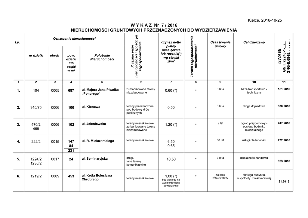 Kielce, 2016-10-25 pow. działki lub część w m2 Położenie Nieruchomości 1 2 3 4 5 1. 104 0005 687 2. 945/75 0006 3. 470/2 469 4. 6 7 ul. Majora Jana Piwnika „Ponurego” zurbanizowane tereny niezabudowane 0,60 (*) 100 ul. Klonowa tereny przeznaczone pod budowę dróg publicznych 0,50 0006 102 ul. Jeleniowska tereny mieszkaniowe zurbanizowane tereny niezabudowane 1,20 (*) 222/2 0015 147 84 231 ul. R. Mielczarskiego tereny mieszkaniowe 6,50 0,65 5. 1224/2 1236/2 0017 24 ul. Seminaryjska drogi, Inne tereny komunikacyjne 6. 1219/2 0009 453 ul. Króla Bolesława Chrobrego tereny mieszkaniowe 10,50 1,00 (*) bez względu na wydzierżawioną powierzchnię Czas trwania umowy Cel dzierżawy 8 9 10 11 „ 3 lata baza transportowo techniczna 181.2016 „ 3 lata droga dojazdowa 330.2016 „ 9 lat ogród przydomowy obsługa budynku mieszkalnego 247.2016 „ 30 lat usługi dla ludności 272.2016 „ 3 lata działalność handlowa UWAGI obręb GN.II.72243-1-.../... GNG-II.6845. … . …. nr działki czynsz netto płatny miesięcznie lub rocznie(*) wg stawki zł/m2 Termin zagospodarowania nieruchomości Oznaczenie nieruchomości Lp. Przeznaczenie nieruchomości i sposób jej zagospodarowania W Y K A Z Nr 7 / 2016 NIERUCHOMOŚCI GRUNTOWYCH PRZEZNACZONYCH DO WYDZIERŻAWIENIA 323.2016 „ na czas nieoznaczony obsługa budynku, wspólnoty mieszkaniowej 21.2015 19 ul. Rajtarska tereny mieszkaniowe zurbanizowane tereny niezabudowane 1,30 (*) 0006 87 ul. Jeleniowska tereny mieszkaniowe 1,30 (*) 778/3 778/5 0017 77 ul. Pomorska ul. Sandomierska drogi tereny mieszkaniowe 10/42 0012 ul. Wschodnia inne tereny zabudowane 30,00 inne tereny zabudowane 20,00 7. 1703/2 820/3 8. 456/4 456/5 456/3 457/3 9. 10. 11. 424/3 0023 0010 27 360 ul. Nowy Świat 1,30 (*) „ „ 10,50 308 al. IX Wieków Kielc ul. Targowa inne tereny zabudowane 1,60 0016 40 ul. Żytnia inne tereny zabudowane 469 0006 594 ul. Jeleniowska 16. 1532/33 0009 24 17. 378/3 0010 18. 107/19 0015 3 lata ogród przydomowy 255.2016 6 lat ogród przydomowy 147.2016 garaż 269.2016 „ do 31.05.2044 r. „ za miejsce inne tereny zabudowane 320.2016 „ za boks ul. Żytnia obsługa budynku mieszkalnego - ogród przydomowy 3 lata na czas nieoznaczony „ 3 lata „ 20 lat 10,50 „ zurbanizowane tereny niezabudowane 1,10 (*) ul. Jagiellońska tereny mieszkaniowe 1,30 (*) 100 ul. Stefana Okrzei tereny rekreacyjno wypoczynkowe 1,30 (*) 80 ul. Piekoszowska ul. Grunwaldzka tereny mieszkaniowe, drogi 12. 630/5 0016 80 13. 958 957/1 0010 14. 630/5 15. 6,50 18 miejsc postojowych 275.2016 działalność handlowa 299.2016 parking 232.2016 3 lata działalność handlowa 291.2016 „ 9 lat ogród przydomowy 265.2016 „ 3 lata obsługa budynku mieszkalnego - ogród przydomowy 177.2016 „ 9 lat teren zielony 308.2016 „ 3 lata działalność handlowa 258.2016 19. 1736/162 0024 518 20. 208/39 0010 70 21. 852 0021 646 22. 1827 0009 70 23. 84/1 0017 1 ul. Tujowa drogi, lasy, pastwiska trwałe, grunty pod rowami 1,10 (*) ul. Stefana Okrzei tereny mieszkaniowe 1,30 (*) ul. Biesak tereny mieszkaniowe 0,08 (*) ul. Grochowa inne tereny zabudowane al. IX Wieków Kielc drogi 30,00 „ 9 lat ogród przydomowy 295.2016 „ 3 lata obsługa budynku 300.2016 „ 3 lata działalność statutowa 113.2016 „ 3 lata 5 boksów garażowych 189.2016 230.2016 277.2016 281.2016 282.2016 „ 5 lat obiekt reklamowy o pow. 6 m² 175.2016 „ 6 lat droga dojazdowa i dojście oraz działalność przemysłowo - składowa 290.2016 „ 9 lat ogród przydomowy 151.2016 „ 9 lat ogród przydomowy 274.2016 „ 9 lat ogród przydomowy 317.2016 „ 3 lata obsługa budynków mieszkalnych 344.2016 za boks 35,00 za m² pow. reklamowej 24. 525 0023 540 204 744 ul. Husarska zurbanizowane tereny niezabudowane 0,60 0,50 25. 1739/146 4045 4046 1739/176 1739/177 0024 563 ul. Świerkowa tereny mieszkaniowe, zurbanizowane tereny niezabudowane 1,10 (*) 26. 1739/144 4044 4043 1739/184 1739/185 0024 242 ul. Świerkowa tereny mieszkaniowe, zurbanizowane tereny niezabudowane 1,10 (*) 27. 117/2 0023 25 ul. Osobna tereny mieszkaniowe 1,30 (*) 28. 72/4 73/4 276/378 0011 2209 ul. Szydłówek Górny ul. Warszawska grunty orne, tereny mieszkaniowe 1,10 (*) 29. 30. 1141/4 1141/2 0009 1461/22 0009 992 ul. Lecha tereny mieszkaniowe 1,00(*) „ bez względu na wydzierżawioną powierzchnię 347 ul. Hoża tereny mieszkaniowe 1,10 (*) „ na czas nieoznaczony obsługa budynku wspólnoty mieszkaniowej 6 lat ogród przydomowy 84.2016 327.2016 Oferty na wydzierżawienie przedmiotowego gruntu należy składać w Wydziale Gospodarki Nieruchomościami i Geodezji Urzędu Miasta Kielce, Rynek 1 pokój 221 od dnia 26 października 2016 roku do dnia 15 listopada 2016 roku w Wydziale Gospodarki Nieruchomościami i Geodezji - pokój nr 221. Przed złożeniem oferty należy w pok. 228 zasięgnąć informacji odnośnie szczegółowej lokalizacji gruntu przeznaczonego do wydzierżawienia oraz trybu zawarcia umowy dzierżawy. Grunty wymienione w pozycji 3, 4, 6, 9 - 10, 11, 13, 15, 17, 19, 23 – 27, 29 – 30 są przeznaczone do wydzierżawienia w trybie bezprzetargowym. Stawki czynszów dzierżawy mogą ulec zmianie nie częściej niż jeden raz w roku na podstawie Zarządzenia Prezydenta Miasta Kielce. Do czynszu ustalonego w oparciu o stawki, o których mowa w kolumnie 7, doliczony zostanie podatek VAT, w wysokości określonej obowiązującymi przepisami (aktualnie 23%). Termin wpłaty miesięcznego czynszu dzierżawnego określa się na dzień 25 każdego miesiąca, natomiast przy wpłacie rocznego czynszu dzierżawnego ustala się dzień 31 marca każdego roku.