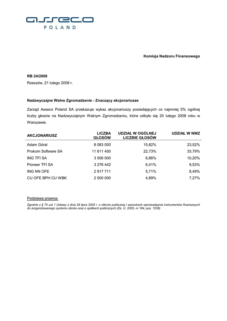 Komisja Nadzoru Finansowego RB 24/2008 Rzeszów, 21 lutego 2008 r. Nadzwyczajne Walne Zgromadzenie - Znaczący akcjonariusze Zarząd Asseco Poland SA przekazuje wykaz akcjonariuszy posiadających co najmniej 5% ogólnej liczby głosów na Nadzwyczajnym Walnym Zgromadzeniu, które odbyło się 20 lutego 2008 roku w Warszawie. AKCJONARIUSZ LICZBA GŁOSÓW UDZIAŁ W OGÓLNEJ LICZBIE GŁOSÓW UDZIAŁ W NWZ Adam Góral 8 083 000 15,82% 23,52% 11 611 450 22,73% 33,79% ING TFI SA 3 506 000 6,86% 10,20% Pioneer TFI SA 3 276 442 6,41% 9,53% ING NN OFE 2 917 711 5,71% 8,49% CU OFE BPH CU WBK 2 500 000 4,89% 7,27% Prokom Software SA Podstawa prawna: Zgodnie z § 70 ust 1 Ustawy z dnia 29 lipca 2005 r. o ofercie publicznej i warunkach wprowadzania instrumentów finansowych do zorganizowanego systemu obrotu oraz o spółkach publicznych (Dz. U. 2005, nr 184, poz. 1539)