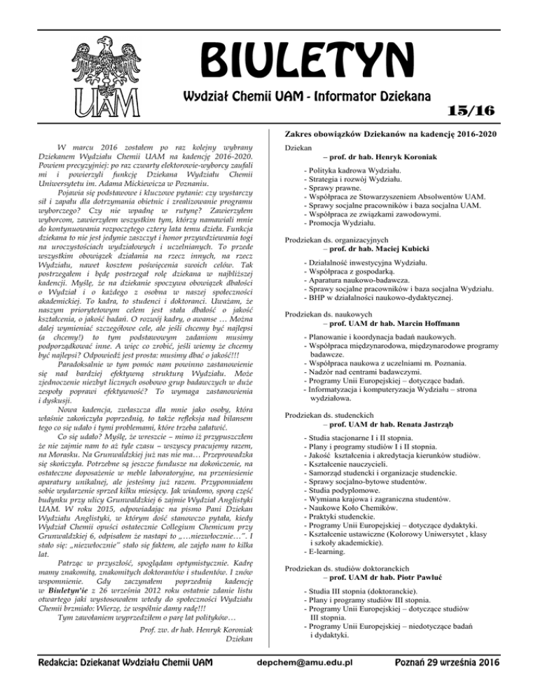 Zakres obowiązków Dziekanów na kadencję 2016-2020 W marcu 2016 zostałem po raz kolejny wybrany Dziekanem Wydziału Chemii UAM na kadencję 2016-2020. Powiem precyzyjniej: po raz czwarty elektorowie-wyborcy zaufali mi i powierzyli funkcję Dziekana Wydziału Chemii Uniwersytetu im. Adama Mickiewicza w Poznaniu. Pojawia się podstawowe i kluczowe pytanie: czy wystarczy sił i zapału dla dotrzymania obietnic i zrealizowanie programu wyborczego? Czy nie wpadnę w rutynę? Zawierzyłem wyborcom, zawierzyłem wszystkim tym, którzy namawiali mnie do kontynuowania rozpoczętego cztery lata temu dzieła. Funkcja dziekana to nie jest jedynie zaszczyt i honor przywdziewania togi na uroczystościach wydziałowych i uczelnianych. To przede wszystkim obowiązek działania na rzecz innych, na rzecz Wydziału, nawet kosztem poświęcenia swoich celów. Tak postrzegałem i będę postrzegał rolę dziekana w najbliższej kadencji. Myślę, że na dziekanie spoczywa obowiązek dbałości o Wydział i o każdego z osobna w naszej społeczności akademickiej. To kadra, to studenci i doktoranci. Uważam, że naszym priorytetowym celem jest stała dbałość o jakość kształcenia, o jakość badań. O rozwój kadry, o awanse … Można dalej wymieniać szczegółowe cele, ale jeśli chcemy być najlepsi (a chcemy!) to tym podstawowym zadaniom musimy podporządkować inne. A więc co zrobić, jeśli wiemy że chcemy być najlepsi? Odpowiedź jest prosta: musimy dbać o jakość!!! Paradoksalnie w tym pomóc nam powinno zastanowienie się nad bardziej efektywną strukturą Wydziału. Może zjednoczenie niezbyt licznych osobowo grup badawczych w duże zespoły poprawi efektywność? To wymaga zastanowienia i dyskusji. Nowa kadencja, zwłaszcza dla mnie jako osoby, która właśnie zakończyła poprzednią, to także refleksja nad bilansem tego co się udało i tymi problemami, które trzeba załatwić. Co się udało? Myślę, że wreszcie – mimo iż przypuszczłem że nie zajmie nam to aż tyle czasu – wszyscy pracujemy razem, na Morasku. Na Grunwaldzkiej już nas nie ma… Przeprowadzka się skończyła. Potrzebne są jeszcze fundusze na dokończenie, na ostateczne doposażenie w meble laboratoryjne, na przeniesienie aparatury unikalnej, ale jesteśmy już razem. Przypomniałem sobie wydarzenie sprzed kilku miesięcy. Jak wiadomo, sporą część budynku przy ulicy Grunwaldzkiej 6 zajmie Wydział Anglistyki UAM. W roku 2015, odpowiadając na pismo Pani Dziekan Wydziału Anglistyki, w którym dość stanowczo pytała, kiedy Wydział Chemii opuści ostatecznie Collegium Chemicum przy Grunwaldzkiej 6, odpisałem że nastapi to „…niezwłocznie…”. I stało się: „niezwłocznie” stało się faktem, ale zajęło nam to kilka lat. Patrząc w przyszłość, spoglądam optymistycznie. Kadrę mamy znakomitą, znakomitych doktorantów i studentów. I znów wspomnienie. Gdy zaczynałem poprzednią kadencję w Biuletyn'ie z 26 września 2012 roku ostatnie zdanie listu otwartego jaki wystosowałem wtedy do społeczności Wydziału Chemii brzmiało: Wierzę, że wspólnie damy radę!!! Tym zawołaniem wyprzedziłem o parę lat polityków… Prof. zw. dr hab. Henryk Koroniak Dziekan Dziekan – prof. dr hab. Henryk Koroniak - Polityka kadrowa Wydziału. - Strategia i rozwój Wydziału. - Sprawy prawne. - Współpraca ze Stowarzyszeniem Absolwentów UAM. - Sprawy socjalne pracowników i baza socjalna UAM. - Współpraca ze związkami zawodowymi. - Promocja Wydziału. Prodziekan ds. organizacyjnych – prof. dr hab. Maciej Kubicki - Działalność inwestycyjna Wydziału. - Współpraca z gospodarką. - Aparatura naukowo-badawcza. - Sprawy socjalne pracowników i baza socjalna Wydziału. - BHP w działalności naukowo-dydaktycznej. Prodziekan ds. naukowych – prof. UAM dr hab. Marcin Hoffmann - Planowanie i koordynacja badań naukowych. - Współpraca międzynarodowa, międzynarodowe programy badawcze. - Współpraca naukowa z uczelniami m. Poznania. - Nadzór nad centrami badawczymi. - Programy Unii Europejskiej – dotyczące badań. - Informatyzacja i komputeryzacja Wydziału – strona wydziałowa. Prodziekan ds. studenckich – prof. UAM dr hab. Renata Jastrząb - Studia stacjonarne I i II stopnia. - Plany i programy studiów I i II stopnia. - Jakość kształcenia i akredytacja kierunków studiów. - Kształcenie nauczycieli. - Samorząd studencki i organizacje studenckie. - Sprawy socjalno-bytowe studentów. - Studia podyplomowe. - Wymiana krajowa i zagraniczna studentów. - Naukowe Koło Chemików. - Praktyki studenckie. - Programy Unii Europejskiej – dotyczące dydaktyki. - Kształcenie ustawiczne (Kolorowy Uniwersytet , klasy i szkoły akademickie). - E-learning. Prodziekan ds. studiów doktoranckich – prof. UAM dr hab. Piotr Pawluć - Studia III stopnia (doktoranckie). - Plany i programy studiów III stopnia. - Programy Unii Europejskiej – dotyczące studiów III stopnia. - Programy Unii Europejskiej – niedotyczące badań i dydaktyki. [email protected]