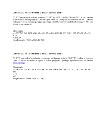 Uchwała ZG PTT nr 84/2015 z dnia 27 czerwca 2015 r ZG PTT postanawia zmienić uchwałę ZG PTT nr 59/2015 z dnia 29 maja 2015 w taki sposób, że zatwierdza zmianę terminu „Polish Open 2015” na nowy 26-27 września 2015 r. Uchwała wchodzi w życie z dniem podjęcia i podlega opublikowaniu w siedzibach Okręgów PTT i na stronie www.taniec.pl. Głosowanie: za -17(PDP, DD, PKB, GKi, AB, MT, GR, MKH, DW, BS, GP, GKł, , WZ, AN, JO, JB, AŁ) p- 0 w-1 (KK) Nie głosowali: ( DED, DGJ, AS, ISŁ) Uchwała ZG PTT nr 85/2015 z dnia 27 czerwca 2015 r ZG PTT zatwierdza "regulamin głosowania mailowego uchwał ZG PTT" zgodnie z załącznikiem. Uchwała wchodzi w życie z dniem podjęcia i podlega opublikowaniu na stronie www.taniec.pl. Głosowanie: za -18(PDP, DD, KK, PKB, GKi, AB, MT, GR, MKH, DW, BS, GP, GKł, , WZ, AN, JO, JB, AŁ) p- 0 w-0 Nie głosowali: (DED, DGJ, AS, ISŁ)
