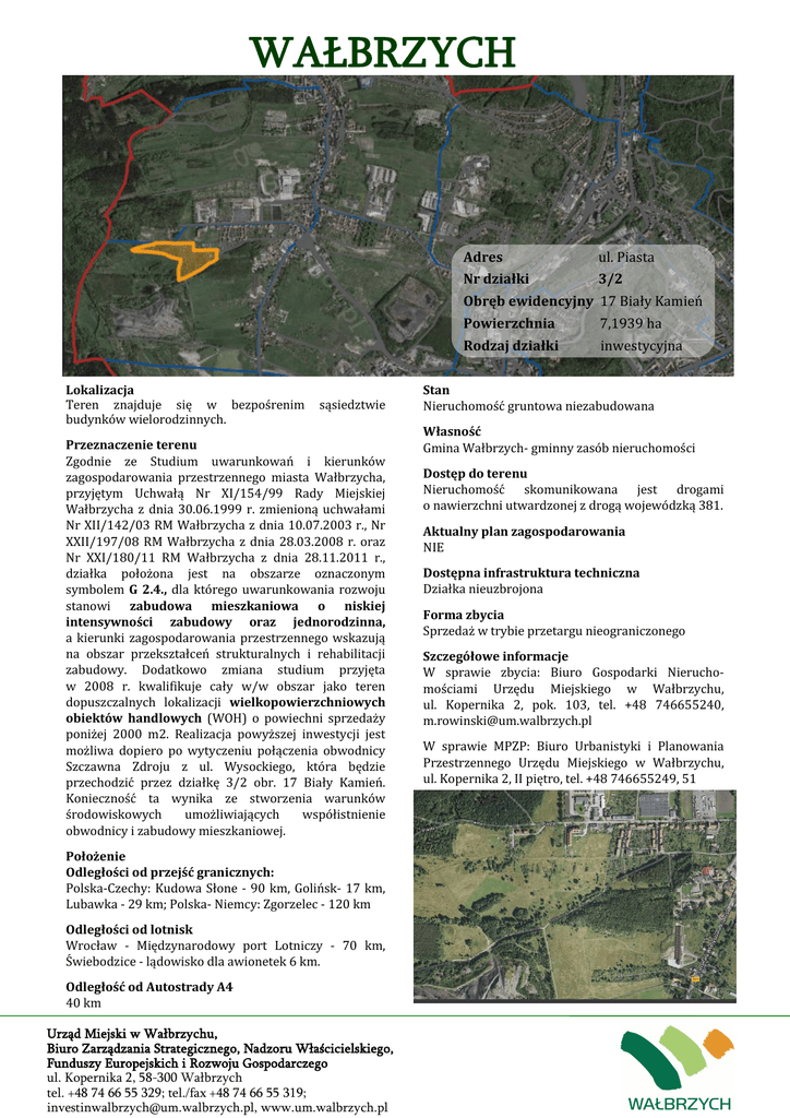 WAŁBRZYCH Adres ul. Piasta Nr działki 3/2 Obręb ewidencyjny 17 Biały Kamień Lokalizacja Teren znajduje się w bezpośrenim budynków wielorodzinnych. sąsiedztwie Przeznaczenie terenu Zgodnie ze Studium uwarunkowań i kierunków zagospodarowania przestrzennego miasta Wałbrzycha, przyjętym Uchwałą Nr XI/154/99 Rady Miejskiej Wałbrzycha z dnia 30.06.1999 r. zmienioną uchwałami Nr XII/142/03 RM Wałbrzycha z dnia 10.07.2003 r., Nr XXII/197/08 RM Wałbrzycha z dnia 28.03.2008 r. oraz Nr XXI/180/11 RM Wałbrzycha z dnia 28.11.2011 r., działka położona jest na obszarze oznaczonym symbolem G 2.4., dla którego uwarunkowania rozwoju stanowi zabudowa mieszkaniowa o niskiej intensywności zabudowy oraz jednorodzinna, a kierunki zagospodarowania przestrzennego wskazują na obszar przekształceń strukturalnych i rehabilitacji zabudowy. Dodatkowo zmiana studium przyjęta w 2008 r. kwalifikuje cały w/w obszar jako teren dopuszczalnych lokalizacji wielkopowierzchniowych obiektów handlowych (WOH) o powiechni sprzedaży poniżej 2000 m2. Realizacja powyższej inwestycji jest możliwa dopiero po wytyczeniu połączenia obwodnicy Szczawna Zdroju z ul. Wysockiego, która będzie przechodzić przez działkę 3/2 obr. 17 Biały Kamień. Konieczność ta wynika ze stworzenia warunków środowiskowych umożliwiających współistnienie obwodnicy i zabudowy mieszkaniowej. Położenie Odległości od przejść granicznych: Polska-Czechy: Kudowa Słone - 90 km, Golińsk- 17 km, Lubawka - 29 km; Polska- Niemcy: Zgorzelec - 120 km Odległości od lotnisk Wrocław - Międzynarodowy port Lotniczy - 70 km, Świebodzice - lądowisko dla awionetek 6 km. Odległość od Autostrady A4 40 km Urząd Miejski w Wałbrzychu, Biuro Zarządzania Strategicznego, Nadzoru Właścicielskiego, Funduszy Europejskich i Rozwoju Gospodarczego ul. Kopernika 2, 58-300 Wałbrzych tel. +48 74 66 55 329; tel./fax +48 74 66 55 319; [email protected], www.um.walbrzych.pl Powierzchnia 7,1939 ha Rodzaj działki inwestycyjna Stan Nieruchomość gruntowa niezabudowana Własność Gmina Wałbrzych- gminny zasób nieruchomości Dostęp do terenu Nieruchomość skomunikowana jest drogami o nawierzchni utwardzonej z drogą wojewódzką 381. Aktualny plan zagospodarowania NIE Dostępna infrastruktura techniczna Działka nieuzbrojona Forma zbycia Sprzedaż w trybie przetargu nieograniczonego Szczegółowe informacje W sprawie zbycia: Biuro Gospodarki Nieruchomościami Urzędu Miejskiego w Wałbrzychu, ul. Kopernika 2, pok. 103, tel. +48 746655240, [email protected] W sprawie MPZP: Biuro Urbanistyki i Planowania Przestrzennego Urzędu Miejskiego w Wałbrzychu, ul. Kopernika 2, II piętro, tel. +48 746655249, 51