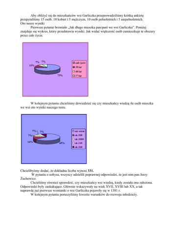 Aby zbliżyć się do mieszkańców wsi Garliczka przeprowadziliśmy krótką ankietę przepytaliśmy 15 osób. 10 kobiet i 5 mężczyzn, 10 osób pełnoletnich i 5 niepełnoletnich. Oto nasze wyniki Pierwsze pytanie brzmiało „Jak długo mieszka pan/pani we wsi Garliczka”. Poniżej znajduje się wykres, który przedstawia wyniki. Jak widać większość osób zamieszkuje te obszary przez całe życie. 7% 7% całe życie 13% 20 lat 40 lat 73% 17 lat W kolejnym pytaniu chcieliśmy dowiedzieć się czy mieszkańcy wiedzą ile osób mieszka we wsi oto wyniki naszego testu. 7% nie wiem 7% ok.500 7% ok.3000 14% 65% ok.240 ok.360 Chcielibyśmy dodać, że dokładna liczba wynosi 331. W pytaniu o sołtysa, wszyscy udzielili poprawnej odpowiedzi, że jest nim pan Jerzy Żuchowicz. Chcieliśmy również sprawdzić, czy mieszkańcy wsi wiedzą, kiedy została ona założona. Odpowiedzi były zaskakujące. Głównie wskazywały na wiek XVII, XVIII lub XX, a tak naprawdę już pierwsze wzmianki o wsi Garliczka pojawiły się w 1381 r. W kolejnym pytaniu poruszyliśmy kwestie warunków do rozwoju młodzieży. Warunki rozwoju młodzieży 10 8 6 4 2 0 warunki są warunki są warunki są dobre średnie złe Jak widać na wykresie pod tym względem nasza wieś wypada bardzo słabo. Chyba trzeba coś zmienić. Nawiązując do poprzedniego pytania spytaliśmy, co trzeba zmienić, żeby warunki do rozwoju młodzieży się poprawiły. Uzyskaliśmy wiele odpowiedzi. Oto propozycje mieszkańców: 1. Trzeba stworzyć miejsce gdzie młodzież mogłaby się spotykać. 2. Potrzebny jest dom wielofunkcyjny. 3. Trzeba wybudować hale sportową. 4. Potrzebne są boiska do gry w piłkę. 5. Trzeba zwiększyć zainteresowania młodzieży sportem, rekreacją i wypoczynkiem czynnym. 6. Trzeba stworzyć przedszkole. 7. Trzeba zrobić plac zabaw. 8. Trzeba stworzyć świetlicę. W kolejnym pytaniu skupiliśmy się na miejscach, które warto pokazać turystom. Dziewięć osób stwierdziło, ze we wsi nie ma takich miejsc, jednak reszta stawiała tutaj ogólnie na krajobraz lub kapliczki. Odpowiedzi mieszkańców w pytaniu, które brzmiało „Czy we wsi są organizowane zabawy, festyny, itp.” były podzielone. Część osób stwierdziła, że nie, jednak druga połowa mówiła, że są organizowane dożynki. Jedna osoba wspomniała jeszcze o zabawie mikołajkowej. W ankiecie poprosiliśmy także, aby mieszkańcy powiedzieli ile nowych obywateli wprowadziło się do wsi w przeciągu 10 lat. Padały różne odpowiedzi. Po ich uśrednieniu wyszło, że wg mieszkańców do Garliczki przybyło 81 osób. W kolejnym pytaniu skupiliśmy się na plusach i minusach wynikających z powyższego faktu. Ilość odpowiedzi 4 2 4 1 1 1 Plusy Odpowiedź Rozwój wsi Powstają nowe budynki poprawiające estetykę wsi Nowe znajomości Wpływy do budżetu Jest więcej znajomych Więcej osób chce być sołtysem lub radnym Minusy Ilość odpowiedzi Odpowiedź Zbyt duży ruch na 6 1 drogach Za duże zagęszczanie 1 1 Śmieci Kłopoty z kanalizacją Wg mieszkańców osobami aktywnie działającymi w naszej wsi są na pierwszym miejscu pan M. Zabiegaj, ponieważ broni on praw mieszkańców, a na drugim sołtys pan J. Żuchowicz, który stara się, aby wieś pracowała sprawnie. Osobami o szczególnych uzdolnieniach lub prowadzący dobrą działalność usługowa okazały się: Pan M. Jurkiewicz -kompozytor Pani D. Kaczmarczyk- Kwiaciarstwo Pan Z. Kisiel- mechanik samochodowy Pan J. Kukuczka- kwiaciarstwo Pan S. Derdaś- stolarstwo Pan J. Żuchowicz- wozi rano pieczywo W pytaniu o udział ankietowanych w życiu wsi tylko jedna osoba stwierdziła, że jest aktywna. Także jedna osoba udzieliła odpowiedzi, że nie interesuje się sprawami wsi, a 13 ankietowanych stwierdziło, ze wiedza, co się dzieje we wsi, ale nie działają z własnej inicjatywy. Kolejne pytanie brzmiało, „ Jakie pozytywne cechy przypisałby pan/pani swojej wsi” Na poniższym wykresie przedstawione są odpowiedzi. 7% 4% 36% Korzystne położenie Czyste zdrowe środowisko Bezpieczna 32% 21% Wygodnie się w niej żyje Komunikacja Jeśli zapytaliśmy o korzyści, zmuszeni byliśmy zadać pytanie o negatywne cechy wsi, które obrazuje diagram zamieszczony niżej. Nic się w niej nie dzieje Mało rozwojowa 5% 5% 52% 38% Bezrobocie Kwaśne opady, skażenie środowiska Ankietowani zapytani o poziom świadomości ekologicznej w naszej wsi mieli różne zdanie. Trzy osoby stwierdziły, że jest on dobry, także 3 osoby powiedziały, że jest zły, a 9, że jest średni. Poniżej przedstawione są główne problemy, jakie wg mieszkańców dotyczą wsi Garliczka. Główne problemy wsi Garliczka brak komunikacji brak sklepu wypuszczanie ścieków do rowów 6% 6% 6% 32% 6% brak hali sportowych brak chodników 17% 27% brak budynku wielofunkcyjnego wieś zatraca cechy wsi Większość ankietowanych, bo aż 10 nie słyszało o próbach rozwiązywania problemów we wsi. Dwie osoby twierdzą, że takie próby w ogóle nie miały miejsca. Tylko 3 osoby powiedziały, że takie próby występowały w Garliczce i że było to sortowanie odpadów i robienie kanalizacji. Na pytanie, „Dlaczego powinna istnieć świetlica wiejska” ankietowani odpowiadali nieco zgodniej. Dlaczego powinna istnieć świetlica wiejska? 7% Żeby członkowie wsi się spotykali. Żeby młodzież mogła się spotykać, rozwijać i bezpiecznie spędzać czas. nie wiem 27% 66% Ankietowani bardzo źle oceniają poziom gospodarstw rolnych we swojej wsi. Poziom gospodarstw rolnych 7% 20% zły 7% 27% dobry średni słaby 39% bardzo słaby Zapytani o inwestycje, które należy przeprowadzić w naszej wsi podali wiele propozycji. 1.Trzeba zrobić kanalizacje. 2.Trzeba poprawić stan dróg i komunikacji. 3.Trzeba zbudować budynek wielofunkcyjny. 4.Trzeba stworzyć świetlicę. 5.Trzeba stworzyć boiska do gry w piłkę. 6.Trzeba zrobić hale sportową. 7.Trzeba zrobić chodniki. 8.Trzeba zrobić plac zabaw. 9.Trzeba zrobi