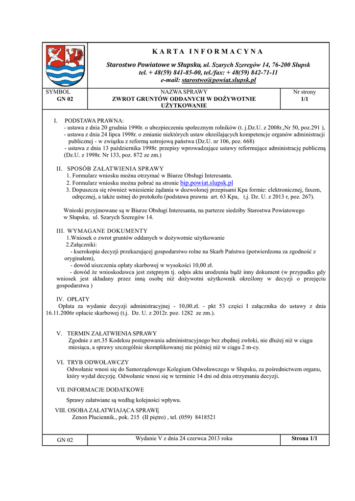 K A RTA I N F O R M A C Y N A Starostwo Powiatowe w Słupsku, ul. Szarych Szeregów 14, 76-200 Słupsk tel. + 48(59) 841-85-00, tel./fax: + 48(59) 842-71-11 e-mail: [email protected] SYMBOL GN 02 I. NAZWA SPRAWY ZWROT GRUNTÓW ODDANYCH W DOŻYWOTNIE UŻYTKOWANIE Nr strony 1/1 PODSTAWA PRAWNA: - ustawa z dnia 20 grudnia 1990r. o ubezpieczeniu społecznym rolników (t. j.Dz.U. z 2008r.,Nr 50, poz.291 ), - ustawa z dnia 24 lipca 1998r. o zmianie niektórych ustaw określających kompetencje organów administracji publicznej - w związku z reformą ustrojową państwa (Dz.U. nr 106, poz. 668) - ustawa z dnia 13 października 1998r. przepisy wprowadzające ustawy reformujące administrację publiczną (Dz.U. z 1998r. Nr 133, poz. 872 ze zm.) II. SPOSÓB ZAŁATWIENIA SPRAWY 1. Formularz wniosku można otrzymać w Biurze Obsługi Interesanta. 2. Formularz wniosku można pobrać na stronie bip.powiat.slupsk.pl 3. Dopuszcza się również wniesienie żądania w dozwolonej przepisami Kpa formie: elektronicznej, faxem, odręcznej, a także ustnej do protokołu (podstawa prawna art. 63 Kpa, t.j. Dz. U. z 2013 r, poz. 267). Wnioski przyjmowane są w Biurze Obsługi Interesanta, na parterze siedziby Starostwa Powiatowego w Słupsku, ul. Szarych Szeregów 14. III. WYMAGANE DOKUMENTY 1.Wniosek o zwrot gruntów oddanych w dożywotnie użytkowanie 2.Załączniki: - kserokopia decyzji przekazującej gospodarstwo rolne na Skarb Państwa (potwierdzona za zgodność z oryginałem), - dowód uiszczenia opłaty skarbowej w wysokości 10,00 zł. - dowód że wnioskodawca jest zstępnym tj. odpis aktu urodzenia bądź inny dokument (w przypadku gdy wniosek jest składany przez inną osobę niż dożywotni użytkownik określony w decyzji o przejęciu gospodarstwa ) IV. OPŁATY Opłata za wydanie decyzji administracyjnej - 10,00.zł. - pkt 53 części I załącznika do ustawy z dnia 16.11.2006r opłacie skarbowej (t.j. Dz. U. z 2012r. poz. 1282 ze zm.). V. TERMIN ZAŁATWIENIA SPRAWY Zgodnie z art.35 Kodeksu postępowania administracyjnego bez zbędnej zwłoki, nie dłużej niż w ciągu miesiąca, a sprawy szczególnie skomplikowanej nie później niż w ciągu 2 m-cy. VI. TRYB ODWOŁAWCZY Odwołanie wnosi się do Samorządowego Kolegium Odwoławczego w Słupsku, za pośrednictwem organu, który wydał decyzję. Odwołanie wnosi się w terminie 14 dni od dnia otrzymania decyzji. VII. INFORMACJE DODATKOWE Sprawy załatwiane są według kolejności wpływu. VIII. OSOBA ZAŁATWIAJĄCA SPRAWĘ Zenon Płuciennik., pok. 215 (II piętro) , tel. (059) 8418521 GN 02 Wydanie V z dnia 24 czerwca 2013 roku Strona 1/1