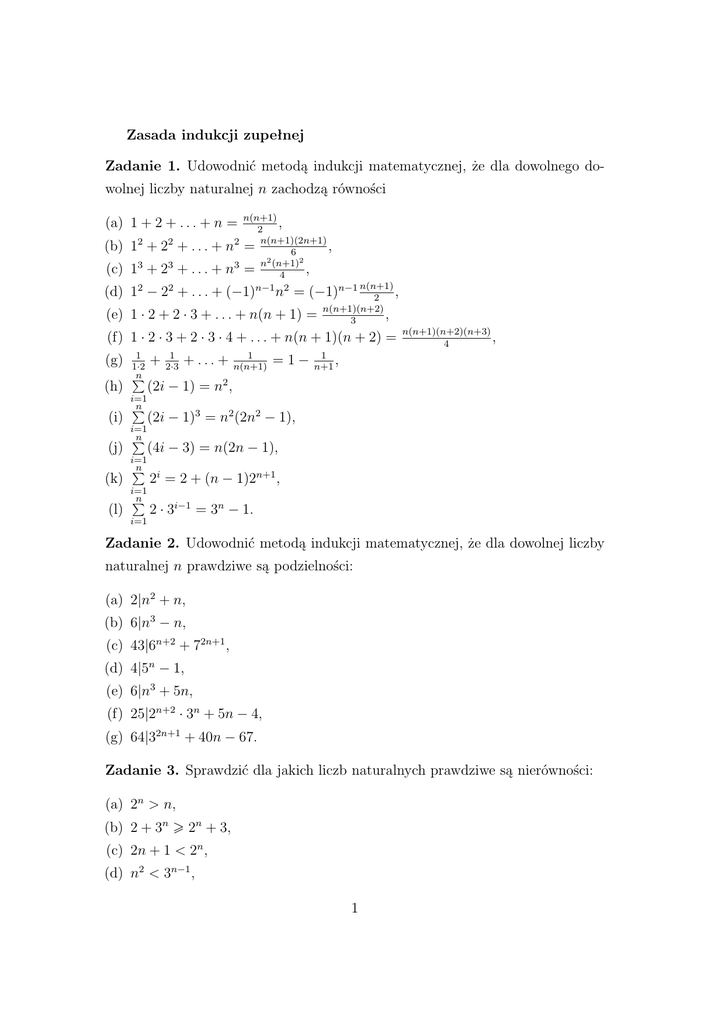 Zasada indukcji zupełnej Zadanie 1. Udowodnić metodą indukcji matematycznej, że dla dowolnego dowolnej liczby naturalnej n zachodzą równości n(n+1) , 2 12 + 22 + . . . + n2 = n(n+1)(2n+1) , 6 2 (n+1)2 n 13 + 23 + . . . + n3 = , 4 2 2 n−1 2 , 1 − 2 + . . . + (−1) n = (−1)n−1 n(n+1) 2 1 · 2 + 2 · 3 + . . . + n(n + 1) = n(n+1)(n+2) , 3 (a) 1 + 2 + . . . + n = (b) (c) (d) (e) (f) 1 · 2 · 3 + 2 · 3 · 4 + . . . + n(n + 1)(n + 2) = (g) (h) (i) (j) (k) (l) 1 1·2 n ∑ + 1 2·3 + ... + 1 n(n+1) =1− n(n+1)(n+2)(n+3) , 4 1 , n+1 (2i − 1) = n2 , i=1 n ∑ (2i − 1)3 = n2 (2n2 − 1), i=1 n ∑ (4i − 3) = n(2n − 1), i=1 n ∑ i=1 n ∑ i=1 2i = 2 + (n − 1)2n+1 , 2 · 3i−1 = 3n − 1. Zadanie 2. Udowodnić metodą indukcji matematycznej, że dla dowolnej liczby naturalnej n prawdziwe są podzielności: (a) 2|n2 + n, (b) 6|n3 − n, (c) 43|6n+2 + 72n+1 , (d) 4|5n − 1, (e) 6|n3 + 5n, (f) 25|2n+2 · 3n + 5n − 4, (g) 64|32n+1 + 40n − 67. Zadanie 3. Sprawdzić dla jakich liczb naturalnych prawdziwe są nierówności: (a) 2n > n, (b) 2 + 3n 2n + 3, (c) 2n + 1 < 2n , (d) n2 < 3n−1 , 1 (e) n3 < 2n , (f) n3 < n!, (g) 3n < n2 + 2n − 4. Zadanie 4. Udowodnić metodą indukcji matematycznej, że: (a) (x + y)n = n ( ) ∑ n i i=0 xn−i y i dla x, y ∈ R oraz n ∈ N, wskazówka: dla dowolnych k, l ∈ N, l < k prawdziwa jest równość ( ) (b) k l n ∑ i=0 + ( ( ) n i ) k l+1 = ( ) k+1 l+1 , = 2n dla n ∈ N, Zadanie 5. Niech k, n będą liczbami naturalnymi takimi, że k ¬ n. Podać i uzasadnić (korzystając z indukcji matematycznej) liczbę wszystkich (a) permutacji zbioru n-elementowego, (b) k-elementowych podzbiorów dowolnego zbioru n-elementowego. Zadanie 6. Wyprowadź znane ze szkoły wzory na sumę n pierwszych wyrazów ciągu arytmetycznego i geometrycznego. Zadanie 7. Wykazać, ze n prostych na płaszczyźnie takich, ze żadne trzy nie przecinają sie w jednym punkcie, dzieli te płaszczyznę na 1 (n2 2 + n + 2) czę- ści. Wskazać miarę złożoności, względem której przebiega indukowanie (innymi słowy: dokładnie określić, względem czego sie indukuje). Zadanie 8. Udowodnić, że każdy n-kąt można podzielić na n−2 trójkąty nieprzecinającymi się prostymi. Wskazać miarę złożoności, względem której przebiega indukowanie. Zadanie 9. Wykazać, ze n kwadratów można zawsze pociąć prostymi w ten sposób, aby z uzyskanych kawałków można było złozyć jeden nowy kwadrat.Wskazać miarę złożoności, względem której przebiega indukowanie. 2