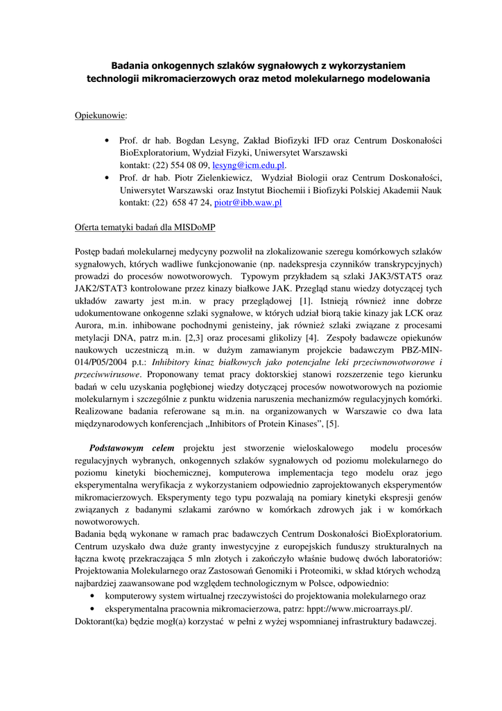 Opiekunowie: • • Prof. dr hab. Bogdan Lesyng, Zakład Biofizyki IFD oraz Centrum Doskonało ci BioExploratorium, Wydział Fizyki, Uniwersytet Warszawski kontakt: (22) 554 08 09, [email protected]. Prof. dr hab. Piotr Zielenkiewicz, Wydział Biologii oraz Centrum Doskonało ci, Uniwersytet Warszawski oraz Instytut Biochemii i Biofizyki Polskiej Akademii Nauk kontakt: (22) 658 47 24, [email protected] Oferta tematyki bada dla MISDoMP Post p bada molekularnej medycyny pozwolił na zlokalizowanie szeregu komórkowych szlaków sygnałowych, których wadliwe funkcjonowanie (np. nadekspresja czynników transkrypcyjnych) prowadzi do procesów nowotworowych. Typowym przykładem s szlaki JAK3/STAT5 oraz JAK2/STAT3 kontrolowane przez kinazy białkowe JAK. Przegl d stanu wiedzy dotycz cej tych układów zawarty jest m.in. w pracy przegl dowej [1]. Istniej równie inne dobrze udokumentowane onkogenne szlaki sygnałowe, w których udział bior takie kinazy jak LCK oraz Aurora, m.in. inhibowane pochodnymi genisteiny, jak równie szlaki zwi zane z procesami metylacji DNA, patrz m.in. [2,3] oraz procesami glikolizy [4]. Zespoły badawcze opiekunów naukowych uczestnicz m.in. w du ym zamawianym projekcie badawczym PBZ-MIN014/P05/2004 p.t.: Inhibitory kinaz białkowych jako potencjalne leki przeciwnowotworowe i przeciwwirusowe. Proponowany temat pracy doktorskiej stanowi rozszerzenie tego kierunku bada w celu uzyskania pogł bionej wiedzy dotycz cej procesów nowotworowych na poziomie molekularnym i szczególnie z punktu widzenia naruszenia mechanizmów regulacyjnych komórki. Realizowane badania referowane s m.in. na organizowanych w Warszawie co dwa lata mi dzynarodowych konferencjach „Inhibitors of Protein Kinases”, [5]. Podstawowym celem projektu jest stworzenie wieloskalowego modelu procesów regulacyjnych wybranych, onkogennych szlaków sygnałowych od poziomu molekularnego do poziomu kinetyki biochemicznej, komputerowa implementacja tego modelu oraz jego eksperymentalna weryfikacja z wykorzystaniem odpowiednio zaprojektowanych eksperymentów mikromacierzowych. Eksperymenty tego typu pozwalaj na pomiary kinetyki ekspresji genów zwi zanych z badanymi szlakami zarówno w komórkach zdrowych jak i w komórkach nowotworowych. Badania b d wykonane w ramach prac badawczych Centrum Doskonało ci BioExploratorium. Centrum uzyskało dwa du e granty inwestycyjne z europejskich funduszy strukturalnych na ł czna kwot przekraczaj ca 5 mln złotych i zako czyło wła nie budow dwóch laboratoriów: Projektowania Molekularnego oraz Zastosowa Genomiki i Proteomiki, w skład których wchodz najbardziej zaawansowane pod wzgl dem technologicznym w Polsce, odpowiednio: • komputerowy system wirtualnej rzeczywisto ci do projektowania molekularnego oraz • eksperymentalna pracownia mikromacierzowa, patrz: hppt://www.microarrays.pl/. Doktorant(ka) b dzie mogł(a) korzysta w pełni z wy ej wspomnianej infrastruktury badawczej. W drugim etapie realizacji projektu stworzony model matematyczny i wyniki symulacji zostan zweryfikowane danymi z eksperymentów mikromacierzowych. Zweryfikowany i zoptymalizowany model zostanie wykorzystany do zaprojektowania specyficznych inhibitorów wadliwie funkcjonuj cych kinaz i/lub czynników transkrypcyjnych i/lub innych molekularnych targetów odpowiedzialnych w najwi kszym stopniu za molekularne procesy nowotworzenia. Przegl d metodologii bada zwi zanych dotycz cych wielkoskalowych metod molekularnego modelowania zawarty jest w [6], a z projektowaniem leków w [7]. Wybór nowotworowych linii komórkowych dla których zostan wykonane badania, uzale niony b dzie m.in. od rozwoju istniej cych i przyszłych grantów badawczych opiekunów naukowych, bowiem eksperymenty mikromacierzowe s stosunkowo drogie. Rozwa a si badania na liniach glejaka i/lub białaczki. Projekt realizowany b dzie we współpracy z Centrum Onkologii w Warszawie oraz w Gliwicach, jak równie z najwi kszym europejskim Superkomputerowym Centrum J. v Neumanna w Juelich (patrz np. http://www.fz-juelich.de/nic-series/volume36/volume36.html). Literatura 1. Yu H& Jove R, The STATS of Cancer — New Molecular Targets Come of Age, Nature Reviews, Cancer, 4, 97-105(2004) 2. P. Siedlecki, R.G. Boy, T. Musch, B. Brueckner, S. Suhai, F. Lyko, P. Zielenkiewicz, Discovery of two Novel, Small-molecule Inhibitors of DNA Methylation, J Med Chem., 49, 678-83 (2006) 3. B. Brueckner, R.G. Boy, P. Siedlecki, T. Musch, H.C. Kliem, P. Zielenkiewicz, S. Suhai, M. Wiessler, F. Lyko, Epigenetic Reactivation of Tumor Suppressor Genes by a Novel Small-molecule Inhibitor of Human DNA Methyltransferases., Cancer Res., 65, 6305-11 (2005). 4. T. J. Lampidis, C. M. Kurtoglu, J. C. Maher, H. Liu, A. Krishan, V. Sheft, S. Szymanski, I. Fokt, W. R. Rudnicki, K. Ginalski, B. Lesyng, W. Priebe, Efficacy of 2-halogen Substituted D-glucose Analogs in Blocking Glycolysis and Killing "hypoxic tumor cells", Cancer Chemother. Pharmacol., 58, 725-734 (2006) 5. K. Swiatek-Machado, A.Adach, A. Ellert-Miklaszewska, W.Szeja, W.Priebe, B.Lesyng, B. Kaminska, Synthesis and Evaluation of Novel Inhibitors of JAK2/STAT3 Pathaway in Glioma Cells, (5th International Conference: Inhibitors of Protein Kinases, Warsaw, Poland, June 23-27, 2007), Acta Biochim. Polon., 54, 38-38 (2007) 6. M.Gruziel, P.Kmiec, J.Trylska, B.Lesyng, Selected Microscopic and Mezoscopic Modeling Tools and Models, "Molecular Materials with Specific Interactions - Modeling and Design", ed. W.A.Sokalski (vol. 4, "Challenges and Advances in Computational Chemistry and Physics", series editor J.Leszczynski) Springer, Dordrecht, pp. 203-224, 2007 7. B. Lesyng & W. Rudnicki, Molecular Modelling in Drug Design, in “Optimization of Aerosol Drug Delivery“, Kluwer, Dordrecht, pp.23-48, 2003