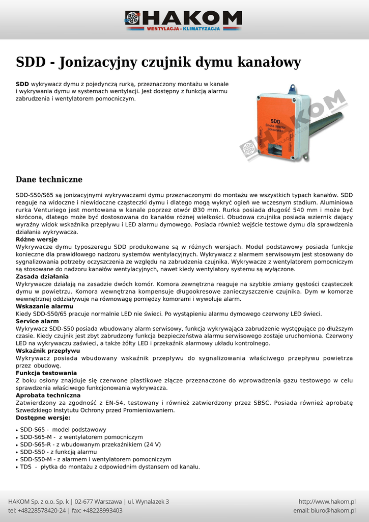 SDD - Jonizacyjny czujnik dymu kanałowy SDD wykrywacz dymu z pojedynczą rurką, przeznaczony montażu w kanale i wykrywania dymu w systemach wentylacji. Jest dostępny z funkcją alarmu zabrudzenia i wentylatorem pomocniczym. Dane techniczne SDD-S50/S65 są jonizacyjnymi wykrywaczami dymu przeznaczonymi do montażu we wszystkich typach kanałów. SDD reaguje na widoczne i niewidoczne cząsteczki dymu i dlatego mogą wykryć ogień we wczesnym stadium. Aluminiowa rurka Venturiego jest montowana w kanale poprzez otwór Ø30 mm. Rurka posiada długość 540 mm i może być skrócona, dlatego może być dostosowana do kanałów różnej wielkości. Obudowa czujnika posiada wziernik dający wyraźny widok wskaźnika przepływu i LED alarmu dymowego. Posiada również wejście testowe dymu dla sprawdzenia działania wykrywacza. Różne wersje Wykrywacze dymu typoszeregu SDD produkowane są w różnych wersjach. Model podstawowy posiada funkcje konieczne dla prawidłowego nadzoru systemów wentylacyjnych. Wykrywacz z alarmem serwisowym jest stosowany do sygnalizowania potrzeby oczyszczenia ze względu na zabrudzenia czujnika. Wykrywacze z wentylatorem pomocniczym są stosowane do nadzoru kanałów wentylacyjnych, nawet kiedy wentylatory systemu są wyłączone. Zasada działania Wykrywacze działają na zasadzie dwóch komór. Komora zewnętrzna reaguje na szybkie zmiany gęstości cząsteczek dymu w powietrzu. Komora wewnętrzna kompensuje długookresowe zanieczyszczenie czujnika. Dym w komorze wewnętrznej oddziaływuje na równowagę pomiędzy komorami i wywołuje alarm. Wskazanie alarmu Kiedy SDD-S50/65 pracuje normalnie LED nie świeci. Po wystąpieniu alarmu dymowego czerwony LED świeci. Service alarm Wykrywacz SDD-S50 posiada wbudowany alarm serwisowy, funkcja wykrywająca zabrudzenie występujące po dłuższym czasie. Kiedy czujnik jest zbyt zabrudzony funkcja bezpieczeństwa alarmu serwisowego zostaje uruchomiona. Czerwony LED na wykrywaczu zaświeci, a także żółty LED i przekaźnik alarmowy układu kontrolnego. Wskaźnik przepływu Wykrywacz posiada wbudowany wskaźnik przepływu do sygnalizowania właściwego przepływu powietrza przez obudowę. Funkcja testowania Z boku osłony znajduje się czerwone plastikowe złącze przeznaczone do wprowadzenia gazu testowego w celu sprawdzenia właściwego funkcjonowania wykrywacza. Aprobata techniczna Zatwierdzony za zgodność z EN-54, testowany i również zatwierdzony przez SBSC. Posiada również aprobatę Szwedzkiego Instytutu Ochrony przed Promieniowaniem. Dostępne wersje: ● ● ● ● ● ● SDD-S65 - model podstawowy SDD-S65-M - z wentylatorem pomocniczym SDD-S65-R - z wbudowanym przekaźnikiem (24 V) SDD-S50 - z funkcją alarmu SDD-S50-M - z alarmem i wentylatorem pomocniczym TDS - płytka do montażu z odpowiednim dystansem od kanału. Montaż: Wywiercić wymagany otwór w kanale. Rurka Venturiego może być skrócona stosownie do wielkości kanału. Rurka posiada zaczepy, które służą do jej zamocowania w uchwycie obudowy wykrywacza. Podczas montażu SDD... należy upewnić się, że przepływ powietrza w kanale jest reprezentacyjny dla całego strumienia. Wykrywacz powinien być montowany trzy szerokości kanału od wlotów gięć i innych potencjalnych zakłóceń. Uchwyt montażowy jest skonstruowany tak, aby można było mocować go do kanałów okrągłych. Płytki dystansowe: Kiedy czujnik jest montowany w pewnej odległości od kanału (n.p. kiedy jest zastosowany materiał izolacyjny ) należy zastosować płytkę TDS. Tuleja dystansowa do montażu na rurce Venturiego jest dostarczana wraz z płytką montażową. Obsługa: Operacja sprawdzenia i czyszczenia wykrywacza powinna być przeprowadzona raz w roku celem zapewnienia maksymalnej niezawodności. Pokrywa może być czyszczona za pomocą podciśnieniowego urządzenia czyszczącego. Czyszczenie wewnątrz głowicy wykrywacza powinno być wykonywane tylko i wyłącznie przez producenta. W tym celu istnieje system wymiany, w którym czujnik zabrudzony może być wymieniony na czysty. Wadliwe czujniki powinny być zwrócone do producenta. Dane techniczne Zasilanie 17...28 V DC poprzez ukł.ster. Zapotrzebowanie mocy (z rezystorem końcowym) - przy pracy nominalnej 11mA przy 24V DC - w czasie alarmu 50mA przy 24V DC - w czasie alarmu 20mA przy 24 V DC Temperatura pracy Wilgotność -20 ... +60oC (bez kondensacji) max 95% RH Stopień ochrony IP54 Radioaktywność 0,9mci Americum 241; 33 kBq, testowany w ISO2919 Urządzenie jest zgodne z wymaganiami europejsckich standardów EMC CENELEC EN50081-1; EN50082-1 i posiada znak CE Sygnalizacja: alarm dymowy alarm serwisowy Rurka Venturiego: Długość Przekaźnik SDD-S60R Schemat - czerwony LED - czerwony LED + żółty LED na układzie kontrolnym Aluminium, fi.30mm 540mm dla kanałów do 1,3m Przełączny; 24V AC/DC, 2A Zasada działania jonizacja, dwie komory