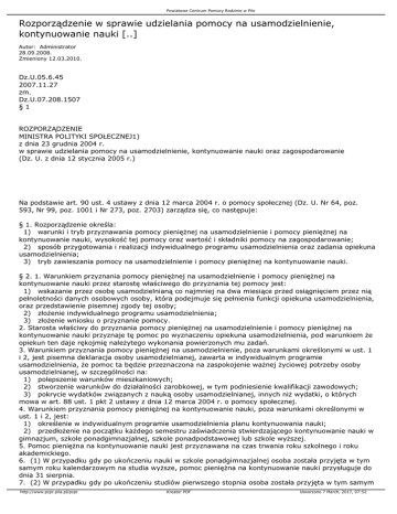 Powiatowe Centrum Pomocy Rodzinie w Pile Rozporządzenie w sprawie udzielania pomocy na usamodzielnienie, kontynuowanie nauki [..] Autor: Administrator 28.09.2008. Zmieniony 12.03.2010. Dz.U.05.6.45 2007.11.27 zm. Dz.U.07.208.1507 §1 ROZPORZĄDZENIE MINISTRA POLITYKI SPOŁECZNEJ1) z dnia 23 grudnia 2004 r. w sprawie udzielania pomocy na usamodzielnienie, kontynuowanie nauki oraz zagospodarowanie (Dz. U. z dnia 12 stycznia 2005 r.) Na podstawie art. 90 ust. 4 ustawy z dnia 12 marca 2004 r. o pomocy społecznej (Dz. U. Nr 64, poz. 593, Nr 99, poz. 1001 i Nr 273, poz. 2703) zarządza się, co następuje: § 1. Rozporządzenie określa: 1) warunki i tryb przyznawania pomocy pieniężnej na usamodzielnienie i pomocy pieniężnej na kontynuowanie nauki, wysokość tej pomocy oraz wartość i składniki pomocy na zagospodarowanie; 2) sposób przygotowania i realizacji indywidualnego programu usamodzielnienia oraz zadania opiekuna usamodzielnienia; 3) tryb zawieszania pomocy na usamodzielnienie i pomocy pieniężnej na kontynuowanie nauki. § 2. 1. Warunkiem przyznania pomocy pieniężnej na usamodzielnienie i pomocy pieniężnej na kontynuowanie nauki przez starostę właściwego do przyznania tej pomocy jest: 1) wskazanie przez osobę usamodzielnianą co najmniej na dwa miesiące przed osiągnięciem przez nią pełnoletności danych osobowych osoby, która podejmuje się pełnienia funkcji opiekuna usamodzielnienia, oraz przedstawienie pisemnej zgody tej osoby; 2) złożenie indywidualnego programu usamodzielnienia; 3) złożenie wniosku o przyznanie pomocy. 2. Starosta właściwy do przyznania pomocy pieniężnej na usamodzielnienie i pomocy pieniężnej na kontynuowanie nauki przyznaje tę pomoc po wyznaczeniu opiekuna usamodzielnienia, pod warunkiem że opiekun ten daje rękojmię należytego wykonania powierzonych mu zadań. 3. Warunkiem przyznania pomocy pieniężnej na usamodzielnienie, poza warunkami określonymi w ust. 1 i 2, jest pisemna deklaracja osoby usamodzielnianej, zawarta w indywidualnym programie usamodzielnienia, że pomoc ta będzie przeznaczona na zaspokojenie ważnej życiowej potrzeby osoby usamodzielnianej, w szczególności na: 1) polepszenie warunków mieszkaniowych; 2) stworzenie warunków do działalności zarobkowej, w tym podniesienie kwalifikacji zawodowych; 3) pokrycie wydatków związanych z nauką osoby usamodzielnianej, innych niż wydatki, o których mowa w art. 88 ust. 1 pkt 2 ustawy z dnia 12 marca 2004 r. o pomocy społecznej. 4. Warunkiem przyznania pomocy pieniężnej na kontynuowanie nauki, poza warunkami określonymi w ust. 1 i 2, jest: 1) określenie w indywidualnym programie usamodzielnienia planu kontynuowania nauki; 2) przedłożenie na początku każdego semestru zaświadczenia stwierdzającego kontynuowanie nauki w gimnazjum, szkole ponadgimnazjalnej, szkole ponadpodstawowej lub szkole wyższej. 5. Pomoc pieniężna na kontynuowanie nauki jest przyznawana na czas trwania roku szkolnego i roku akademickiego. 6. (1) W przypadku gdy po ukończeniu nauki w szkole ponadgimnazjalnej osoba została przyjęta w tym samym roku kalendarzowym na studia wyższe, pomoc pieniężna na kontynuowanie nauki przysługuje do dnia 31 sierpnia. 7. (2) W przypadku gdy po ukończeniu studiów pierwszego stopnia osoba została przyjęta w tym samym http://www.pcpr.pila.pl/pcpr Kreator PDF Utworzono 7 March, 2017, 07:52 Powiatowe Centrum Pomocy Rodzinie w Pile roku kalendarzowym na studia drugiego stopnia, pomoc pieniężna na kontynuowanie nauki przysługuje do dnia 30 września. § 3. 1. (3) Dyrektor lub kierownik placówki opiekuńczo-wychowawczej typu rodzinnego i socjalizacyjnego, domu pomocy społecznej dla dzieci i młodzieży niepełnosprawnych intelektualnie, domu dla matek z małoletnimi dziećmi i kobiet w ciąży, zakładu poprawczego, schroniska dla nieletnich, specjalnego ośrodka szkolno-wychowawczego, specjalnego ośrodka wychowawczego, młodzieżowego ośrodka socjoterapii zapewniającego całodobową opiekę i młodzieżowego ośrodka wychowawczego, zwany dalej "dyrektorem lub kierownikiem", albo rodzina zastępcza informuje właściwe powiatowe centrum pomocy rodzinie, nie później jednak niż do dnia 10 grudnia roku poprzedzającego, o wychowankach, którzy w danym roku kalendarzowym osiągną pełnoletność. 2. Dyrektor lub kierownik albo rodzina zastępcza informuje właściwe powiatowe centrum pomocy rodzinie o zamiarze usamodzielnienia się wychowanka, co najmniej na trzy miesiące przed terminem opuszczenia przez niego placówki lub rodziny zastępczej. 3. Dyrektor lub kierownik albo rodzina zastępcza przekazuje dokumentację dotyczącą osoby usamodzielnianej powiatowemu centrum pomocy rodzinie, nie później niż na miesiąc przed terminem opuszczenia przez tę osobę placówki lub rodziny zastępczej. § 4. 1. (4) Wniosek o przyznanie pomocy pieniężnej na usamodzielnienie i pomocy pieniężnej na kontynuowanie nauki osoba usamodzielniana składa do starosty właściwego do przyznania tej pomocy za pośrednictwem kierownika powiatowego centrum pomocy rodzinie właściwego ze względu na miejsce pobytu osoby usamodzielnianej. 2. Wniosek osoby usamodzielnianej rozpatruje kierownik powiatowego centrum pomocy rodzinie właściwego do przyznania pomocy w porozumieniu z opiekunem usamodzielnienia. § 5. 1. Wysokość pomocy pieniężnej na usamodzielnienie dla osoby usamodzielnianej opuszczającej placówkę opiekuńczo-wychowawczą typu socjalizacyjnego, rodzinnego lub dom pomocy społecznej dla dzieci i młodzieży niepełnosprawnych intelektualnie, dom dla matek z małoletnimi dziećmi i kobiet w ciąży ustala się w kwocie odpowiadającej: 1) 400 % podstawy, o której mowa w art. 78 ust. 2 ustawy z dnia 12 marca 2004 r. o pomocy społecznej, zwanej dalej "podstawą" - w przypadku gdy osoba usamodzielniana przebywała w placówce opiekuńczo-wychowawczej typu socjalizacyjnego, rodzinnego lub w domu pomocy społecznej dla dzieci i młodzie