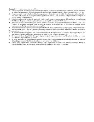 Zadania 7 1. zakres materiału: ruch falowy Dźwięk wystrzału armatniego usłyszano 20 s później niż zaobserwowano błysk tego wystrzału. Znaleźć odległość tej armaty od obserwatora. Prędkość dźwięku w powietrzu jest równa V=340 m/s, a prędkość światła c=3×108 m/s. 2. Na powierzchni wody wzbudzono falę, która po czasie t=2 min dobiega do łodzi. Czas kolejnych uderzeń grzbietów fali o łódź wynosi 2s, a odległość między grzbietami wynosi 1,2 m. Wyznacz odległość od łodzi miejsca, w którym została wzbudzona fala. 3. Jaka jest maksymalna prędkość cząsteczek wody, kiedy przez wodę przechodzi fala podłużna o amplitudzie A=0,2 mm i długości λ=10 m? Szybkość rozchodzenia się fali w wodzie V=1500 m/s. 4. Równanie płaskiej fali dźwiękowej ma postać: ψ(x,t)=Acos(ωt-kx), przy czym A=0.06 mm, ω=1800 s-1 i k=5,3 m-1. Znaleźć: a) stosunek amplitudy drgań cząsteczek ośrodka do długości fali, b) maksymalną prędkość drgań cząsteczek ośrodka i prędkość rozchodzenia się fali. 5. Podstawowa częstość sygnału parowozu wynosi f=600 Hz. Jaką częstość usłyszy stojący przy przejeździe kolejowym człowiek, jeżeli a) pociąg zbliża się do niego z prędkością 90 km/h, b) pociąg oddala się z tą samą prędkością. Praca domowa 1. W ośrodku rozchodzi się płaska fala o częstotliwości f=100 Hz z prędkością V=340 m/s. Wyznaczyć długość fali oraz różnicę faz między punktami oddalonymi od siebie o 1m w kierunku propagacji fali. 2. Ile razy zmieni się długość fali dźwiękowej przy przejściu z powietrza do wody? Prędkość dźwięku w wodzie V2=1500 m/s, w powietrzu V1=340 m/s. 3. W jakiej odległości od okrętu znajduje się góra lodowa, jeżeli sygnał dźwiękowy echosondy odebrano po upływie 2,6 s od jego wysłania? Szybkość dźwięku w wodzie jest równa 1500 m/s. 4. Oblicz, jaką częstotliwość usłyszymy zbliżając się z szybkością V o=10 m/s do źródła wydającego dźwięk o częstotliwości fo=1000 Hz. Szybkość rozchodzenia się dźwięku w powietrzu V=340 m/s.
