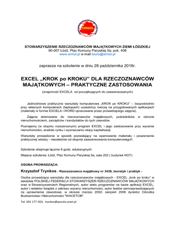 STOWARZYSZENIE RZECZOZNAWCÓW MAJĄTKOWYCH MAJ TKOWYCH ZIEMI ŁÓDZKIEJ 90-007 007 Łódź, Łódź Plac Komuny Paryskiej 5a; pok. 408 www.srmzl.pl e-mail [email protected] zaprasza na szkolenie w dniu dni 28 października 2016r. EXCEL „KROK po KROKU” DLA RZECZOZNAWCÓW MAJĄTKOWYCH TKOWYCH – PRAKTYCZNE ZASTOSOWANIA (znajomość ść EXCELA od pocz początkujących cych do zaawansowanych) Jednodniowe praktyczne warsztaty komputerowe „KROK po KROKU” – bezpośrednio przy własnych komputerach (laptopach) uczestnicy ćwiczą na przygotowanych aplikacjach (materiały w formie EXCELA i WORD opracowane przez prowadzącego prowadzącego zaję zajęcia). Zajęcia cia skierowane do rzeczoznawców majątkowych, maj nieruchomościami, zarządców ądców i kandydatów do tych zawodów. pośredników średników w obrocie Poznajemy (w stopniu rozszerzonym) program EXCEL i jego zastosowanie zastosowan przy wycenie nieruchomości, ci, analizie rynku i wyznaczaniu stopy kapitalizacji. Warsztaty prowadzone w sposób pozwalający pozwalaj cy na opanowanie materiału i poszerzenie praktycznej wiedzy - niezależnie żnie nie od stopnia zaawansowania komputerowego!!. Szkolenie obejmuje łącznie 8 godz. edukacyjnych Miejsce szkolenia: Łódź, ź,, Plac Komuny Paryskiej 5a, sala 202 ( budynek NOT) OSOBA PROWADZĄCA: Krzysztof Trynkos - Rzeczoznawca majątkowy maj tkowy nr 3438, teoretyk i praktyk Osoba prowadząca ca warsztaty dla rzeczoznawców maj majątkowych - EXCEL „krok po kroku” w siedzibie POLSKIEJ FEDERACJI STOWARZYSZEŃ STOWARZYSZE RZECZOZNAWCÓW MAJ MAJĄTKOWYCH oraz w Stowarzyszeniach Regionalnych, autor wielu programów na bazie aplikacji EXCEL, autor i redaktor książek ek z zakresu wyceny nieruchomości, nieruchomo ci, autor testów samospra samosprawdzających na uprawnienia zawodowe, w okresie marzec 20022002 sierpień ń 2006 dyrektor Ośrodka O Budownictwa i Nieruchomości ści "WACETOB". Tel. 501 177 263; [email protected] Program szkolenia: Podział godzinowy – płynny uzależniony od stopnia zaawansowania kursantów. 28-10-2016 r. – piątek (8 godz. zajęć) Godz. 9.00 – 9.45 (1 godzina) 1. PODSTAWOWE INFORMACJE I ZAKŁADKI APLIKACJI (filtr, sortowanie, funkcje, wykresy – w praktycznych przykładach) EXCELA Godz. 9.45 – 10.30 (1 godzina) 2. ANALIZA RYNKU – ceny transakcyjne i ofertowe (tekst jako kolumna, sumy częściowe, tabele przestawne) Godz. 10.30 – 10.45 przerwa kawowa Godz. 10.45 – 11.30 (1 godzina) 3. TRENDY RYNKOWE - ceny ofertowe i czynsze jako niezbędny element badania rynku (trendy czasowe roczne i miesięczne, aktualizacje cen transakcyjnych na dzień wyceny, trendy powierzchniowe) Godz. 11.30 – 12.15 (1 godzina) 4. ANALIZA RYNKU DO WYZNACZANIA STOPY KAPITALIZACJI Rozbudowana analiza w formie wykresów (wykorzystanie stawek czynszowych, cen ofertowych i analiz trendu czasowego, funkcja REGLINX) Godz. 12.15 – 13.15 przerwa na obiad Godz. 13.15 – 14.45 (2 godziny) 5. ZAKŁADKI APLIKACJI EXCELA PRZYŚPIESZAJĄCE PRACE - (formanty, makra, nowe zastosowanie funkcji "ZŁĄCZ.TEKSTY"). Godz. 14.45 – 15.00 przerwa kawowa Godz. 15.00 – 15.45 (1 godzina) 6. WAGI CECH - ROZBUDOWANE APLIKACJE EXCELA (porównywanie parami i korygowanie ceny średniej) aplikacje do weryfikacji wag. Godz. 15.45 – 16.30 (1 godzina) 7. APLIKACJA EXCELA DO WYLICZANIA WARTOŚCI W PODEJŚCIU DOCHODOWYM (automatyzacja wyliczeń) Uczestnicy szkolenia otrzymają zaświadczenia potwierdzające doskonalenie kwalifikacji zawodowych. Koszt uczestnictwa: - 250 zł Koszt uczestnictwa obejmuje: udział w szkoleniu, materiały szkoleniowe, serwis kawowy, obiad. Zgłoszenie udziału w szkoleniu prosimy przesłać na załączonym druku na adres e-mail wskazany w nagłówku lub podany poniżej: [email protected] Wpłata na konto BGŻ S.A. O/ Pabianice nr 68 2030 0045 1110 0000 0386 5980 Termin zgłoszenia i wpłaty do dnia 15 października 2016 r. Serdecznie zapraszamy w imieniu Zarządu SRMZŁ Ewa Baś 607 216 936