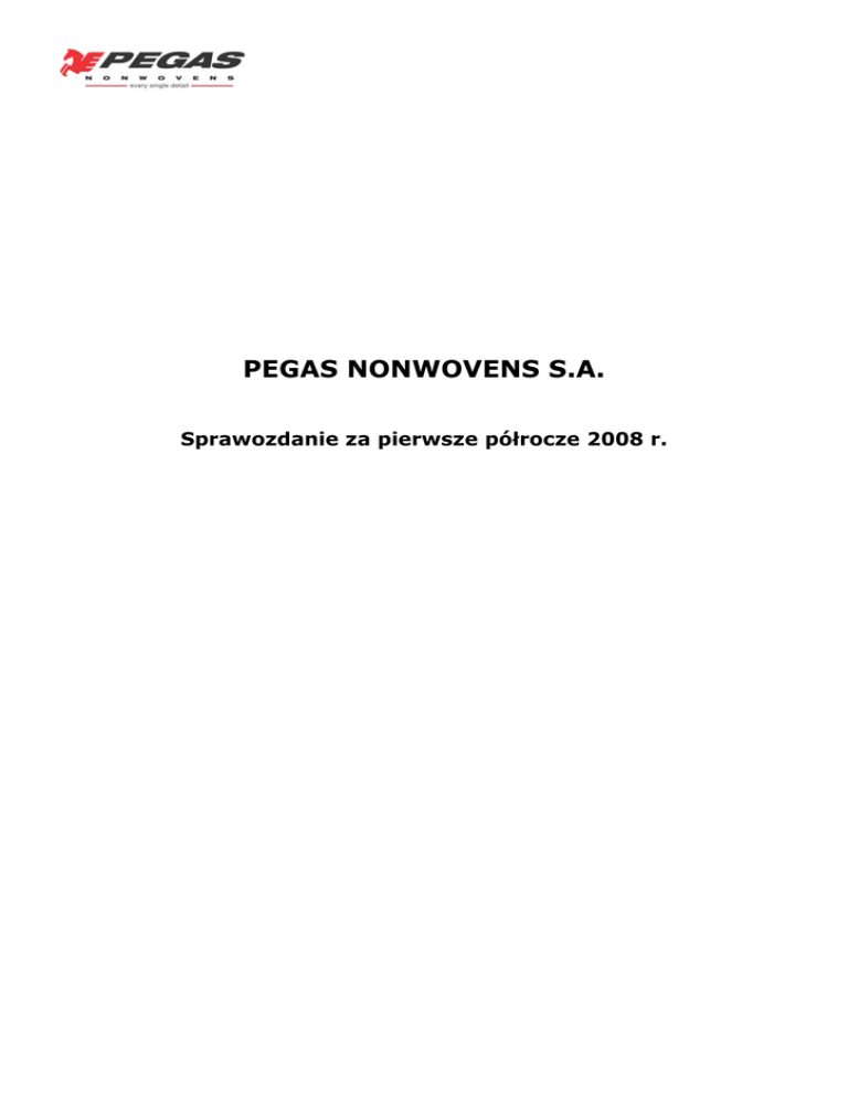 PEGAS NONWOVENS S.A. Sprawozdanie za pierwsze półrocze 2008 r. PEGAS NONWOVENS S.A. | Sprawozdanie za pierwsze półrocze 2008 r. | 27 sierpnia 2008 r. 2 Spis treści 1 Wprowadzenie ....................................................................................................................................................................4 2 Wybrane dane finansowe – pierwsze półrocze 2008 r. ......................................................................................................5 3 Wyniki finansowe za I poł. 2008 r. .....................................................................................................................................8 4 Wyniki działalności za pierwsze półrocze 2008 r.............................................................................................................10 5 Prace badawcze i rozwojowe ............................................................................................................................................11 6 Strategia na 2008 r. ...........................................................................................................................................................12 7 Czynniki ryzyka ................................................................................................................................................................13 8 Akcje i struktura akcjonariatu ...........................................................................................................................................15 9 Polityka wypłaty dywidendy i ogłoszenie dywidendy......................................................................................................17 10 Transakcje z podmiotami powiązanymi............................................................................................................................18 11 Ład korporacyjny ..............................................................................................................................................................19 12 Skonsolidowane sprawozdania finansowe za sześć miesięcy zakończonych 30 czerwca 2008 r. oraz 30 czerwca 2007 r. ....................................................................................................................................................22 12.1 Metoda konsolidacji................................................................................................................................................22 12.2 Skonsolidowane rachunki zysków i strat za sześć miesięcy zakończonych 30 czerwca 2008 r. oraz 30 czerwca 2007 r. ....................................................................................................................................................23 12.3 Skonsolidowane rachunki zysków i strat za trzy miesiące zakończone 30 czerwca 2008 r. oraz 30 czerwca 2007 r. ....................................................................................................................................................24 12.4 Skonsolidowane bilanse za sześć miesięcy zakończonych 30 czerwca 2008 r., 30 czerwca 2007 r. oraz 31 grudnia 2007 r. .....................................................................................................................................................25 12.5 Skonsolidowane rachunki przepływów pieniężnych za sześć miesięcy zakończonych 30 czerwca 2008 r. oraz 30 czerwca 2007 r......................................................................................................................................................26 13 Oświadczenie osób odpowiedzialnych .............................................................................................................................27 14 Kontakt ............................................................................................................................................................................28 15 Słowniczek terminów........................................................................................................................................................29 Dodatkowe informacje............................................................................................................................................................30 3 1 Wprowadzenie PEGAS NONWOVENS S.A. („PEGAS”, „Spółka” lub „Grupa”) jest czołowym europejskim producentem włóknin (tj. produktów włókienniczych powstających na bazie włókien polimerowych łączonych poprzez oddziaływanie ciśnieniem i wysoką temperaturą) wykorzystywanych głównie do produkcji artykułów higieny osobistej. Spółka dostarcza odbiorcom włókniny polipropylenowe (PP) i polipropylenowo-polietylenowe (PP/PE) wytwarzane w technologiach spunbond oraz meltblown (zwanych łącznie technologią spunmelt), które wykorzystuje się przede wszystkim do produkcji artykułów higienicznych jednorazowego użytku, jak również w budownictwie, rolnictwie i medycynie. W skład Grupy wchodzi jednostka dominująca z siedzibą w Luksemburgu oraz pięć czeskich spółek operacyjnych: PEGAS NONWOVENS s.r.o., PEGAS - DS a.s., PEGAS-NT a.s., PEGAS - NW a.s i PEGAS - NS a.s. Zawiązana w 1990 r. Spółka w ciągu 18 lat stała się drugim co do wielkości producentem włóknin wytwarzanych w technologii spunmelt w Europie (oceniając na podstawie rocznych zdolności produkcyjnych z 2007 r.). Obecnie PEGAS posiada dwa zakłady i osiem linii produkcyjnych. Łączne zdolności produkcyjne Spółki wynoszą w przybliżeniu 70 tys. ton włóknin rocznie. Na koniec pierwszej połowy 2008 r. spółki Grupy PEGAS zatrudniały 389 osób. Od pierwszej oferty publicznej Spółki, przeprowadzonej w grudniu 2006 r., akcje PEGAS notowane są na giełdach papierów wartościowych w Pradze i Warszawie. 100% akcji Spółki znajduje się w obrocie giełdowym i jest w posiadaniu inwestorów instytucjonalnych oraz indywidualnych. Według stanu na