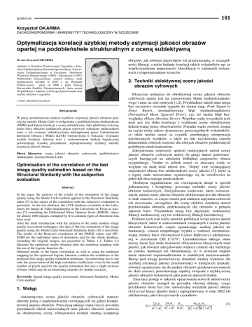 KNWS’09 181 Krzysztof OKARMA ZACHODNIOPOMORSKI UNIWERSYTET TECHNOLOGICZNY W SZCZECINIE Optymalizacja korelacji szybkiej metody estymacji jakości obrazów opartej na podobieństwie strukturalnym z oceną subiektywną Dr inŜ. Krzysztof OKARMA Adiunkt w Katedrze Przetwarzania Sygnałów i InŜynierii Multimedialnej Zachodniopomorskiego Uniwersytetu Technologicznego w Szczecinie. Absolwent Wydziału Elektrycznego (1999) i Informatyki (2001) Politechniki Szczecińskiej, stopień doktora nauk technicznych uzyskał w 2003 r. na Wydziale Elektrycznym, gdzie od 2008 r. pełni funkcję Kierownika Studiów Niestacjonarnych. Autor ponad 60 publikacji z zakresu cyfrowego przetwarzania oraz analizy obrazów i sygnałów. e-mail: [email protected] Streszczenie W pracy przedstawiono analizę wyników estymacji jakości obrazów przy uŜyciu metody Monte Carlo w połączeniu z podobieństwem strukturalnym (SSIM) pod kątem korelacji z oceną subiektywną. Jako platformy testowej uŜyto bazy obrazów poddanych pięciu typowym rodzajom zniekształceń wraz z ich ocenami subiektywnymi udostępnianej przez Laboratorium InŜynierii Obrazu i Wideo (LIVE) Uniwersytetu w Teksasie. Uzyskane wyniki korelacji liniowej oraz z zastosowaniem funkcji logistycznej potwierdzają wysoką przydatność zaproponowanej szybkiej metody estymacji jakości obrazu. Słowa kluczowe: ocena jakości obrazów cyfrowych, podobieństwo strukturalne, metoda Monte Carlo Optimisation of the correlation of the fast image quality estimation based on the Structural Similarity with the subjective evaluation Abstract In the paper the analysis of the results of the estimation of the image quality using the Monte Carlo method applied to the Structural Similarity index [5] in the aspect of the correlation with the subjective evaluation is presented. As the test platform, the LIVE database (available at the Laboratory for Image & Video Engineering of the University of Texas at Austin) [7] containing the Differential Mean Opinion Score (DMOS) values for almost 1000 images corrupted by five common types of distortions has been used. After the short introduction with the analysis of the some modern image quality assessment techniques, the idea of the fast estimation of the image quality using the Monte Carlo Structural Similarity Index [6] is described. The results of the Pearson's correlation of the DMOS values and MCSSIM for the individual types of distortions and for the whole database, excluding the original images, are presented in Tables 1-2. Tables 3-4 illustrate the optimised results obtained after the nonlinear mapping with the use of the logistic function (6). Obtained results of the linear correlation, as well as using the nonlinear mapping by the optimised logistic function, confirm the usefulness of the proposed fast image quality estimation technique. An interesting fact is not only the preservation of the high correlation coefficients even for the small number of pixels used for the quality estimation but also a slight increase of them which may be an interesting stimulus for further research.. Keywords: digital image quality assessment, Structural Similarity, Monte Carlo method 1. Wstęp Automatyczna ocena jakości obrazów cyfrowych stanowi obecnie jedną z najdynamiczniej rozwijających się gałęzi komputerowej analizy obrazów. Przyczyną takiego stanu rzeczy jest duŜa przydatność takich uniwersalnych miar jakości obrazów zarówno do obiektywnej oceny efektywności technik stratnej kompresji obrazów, jak równieŜ algorytmów ich przetwarzania, w szczególności filtracji, a takŜe badanie korelacji takich wskaźników np. ze współczynnikami poprawności klasyfikacji w zadaniach związanych z rozpoznawaniem wzorców. 2. Techniki obiektywnej oceny jakości obrazów cyfrowych Klasyczne podejście do obiektywnej oceny jakości obrazów cyfrowych oparte jest na zastosowaniu błędu średniokwadratowego i miar na nim opartych [1,2]. Przykładami takich miar mogą być szczytowy stosunek sygnału do szumu (ang. Peak Signal to Noise Ratio), znormalizowany błąd średniokwadratowy (Normalised Mean Squared Error), czy teŜ średni błąd bezwzględny (Mean Absolute Error). Wspólną wadą wszystkich tych miar jest ich słaba korelacja z wynikami oceny subiektywnej dokonywanej przez obserwatorów. Ponadto warto zwrócić uwagę na często róŜny zakres dynamiczny poszczególnych wskaźników, co takŜe moŜna uznać za czynnik utrudniający interpretację uzyskiwanych wyników, a takŜe na fakt uzyskiwania czasem diametralnie róŜnych wartości dla róŜnych obrazów poddawanych podobnym zniekształceniom. Zdecydowana większość spośród tradycyjnych metod oceny jakości obrazów cyfrowych naleŜy do grupy metod porównawczych bazujących na załoŜeniu dokładnej znajomości obrazu oryginalnego. Trudno to jednak uznać za znaczącą wadę ze względu na małą ilość metod tzw. "ślepej" (nie wymagającej znajomości obrazu bez zniekształceń) oceny jakości [3], które są z reguły mało uniwersalne, ograniczając się do wraŜliwości na jeden lub dwa rodzaje zniekształceń. Osobnym zagadnieniem, nie rozwiązanym dotąd w sposób jednoznaczny i kompletny, pozostaje technika oceny jakości obrazów kolorowych. Zdecydowana większość, takŜe nowoczesnych, metod oceny jakości obrazów definiowana jest dla obrazów w skali szarości, co często stawia pod znakiem zapytania celowość ich stosowania, szczególnie dla oceny efektów działania metod przetwarzania obrazów dedykowanych dla obrazów o pełnym zakresie barw. Przykładem mogą być algorytmy wektorowej filtracji medianowej, czy teŜ wektorowej filtracji kierunkowej. Pomimo tych wad wielu autorów publikacji wciąŜ uŜywa metod klasycznych, takŜe w zastosowaniach związanych z oceną jakości obrazów kolorowych, często ograniczając analizę jakości do luminancji, czasem uzupełniając wyniki o wartości znormalizowanej róŜnicy barw (Normalised Col