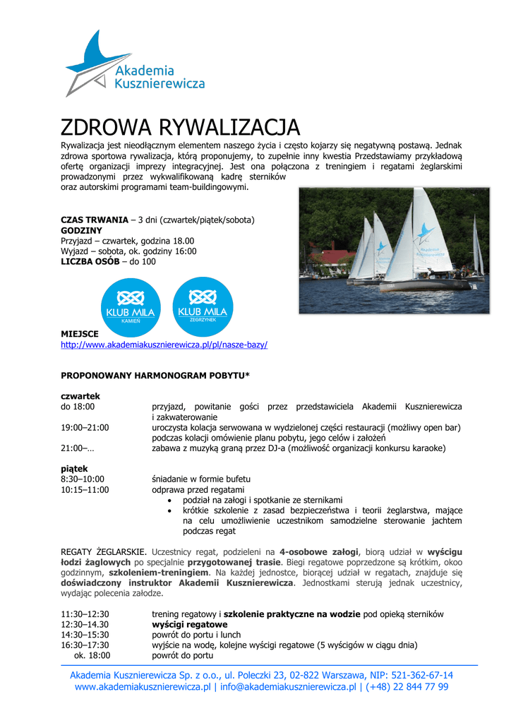 ZDROWA RYWALIZACJA Rywalizacja jest nieodłącznym elementem naszego życia i często kojarzy się negatywną postawą. Jednak zdrowa sportowa rywalizacja, którą proponujemy, to zupełnie inny kwestia Przedstawiamy przykładową ofertę organizacji imprezy integracyjnej. Jest ona połączona z treningiem i regatami żeglarskimi prowadzonymi przez wykwalifikowaną kadrę sterników oraz autorskimi programami team-buildingowymi. CZAS TRWANIA – 3 dni (czwartek/piątek/sobota) GODZINY Przyjazd – czwartek, godzina 18.00 Wyjazd – sobota, ok. godziny 16:00 LICZBA OSÓB – do 100 MIEJSCE http://www.akademiakusznierewicza.pl/pl/nasze-bazy/ PROPONOWANY HARMONOGRAM POBYTU* czwartek do 18:00 19:00–21:00 21:00‒… piątek 8:30–10:00 10:15‒11:00 przyjazd, powitanie gości przez przedstawiciela Akademii Kusznierewicza i zakwaterowanie uroczysta kolacja serwowana w wydzielonej części restauracji (możliwy open bar) podczas kolacji omówienie planu pobytu, jego celów i założeń zabawa z muzyką graną przez DJ-a (możliwość organizacji konkursu karaoke) śniadanie w formie bufetu odprawa przed regatami podział na załogi i spotkanie ze sternikami krótkie szkolenie z zasad bezpieczeństwa i teorii żeglarstwa, mające na celu umożliwienie uczestnikom samodzielne sterowanie jachtem podczas regat REGATY ŻEGLARSKIE. Uczestnicy regat, podzieleni na 4-osobowe załogi, biorą udział w wyścigu łodzi żaglowych po specjalnie przygotowanej trasie. Biegi regatowe poprzedzone są krótkim, okoo godzinnym, szkoleniem-treningiem. Na każdej jednostce, biorącej udział w regatach, znajduje się doświadczony instruktor Akademii Kusznierewicza. Jednostkami sterują jednak uczestnicy, wydając polecenia załodze. 11:30‒12:30 12:30–14.30 14:30–15:30 16:30‒17:30 ok. 18:00 trening regatowy i szkolenie praktyczne na wodzie pod opieką sterników wyścigi regatowe powrót do portu i lunch wyjście na wodę, kolejne wyścigi regatowe (5 wyścigów w ciągu dnia) powrót do portu Akademia Kusznierewicza Sp. z o.o., ul. Poleczki 23, 02-822 Warszawa, NIP: 521-362-67-14 www.akademiakusznierewicza.pl | [email protected] | (+48) 22 844 77 99 19:00–21:00 21:00‒22:00 sobota 08:00–10:00 10:00‒10:30 11:30‒14:00 15:00‒16:00 ok. 16:00 kolacja grillowa połączona z wręczeniem nagród dla najlepszych załóg oraz upominków dla wszystkich uczestników wydarzenia koncert szantowy śniadanie odprawa sterników, przedstawienie programu, podział na załogi żeglarski wyścig długodystansowy lub integracyjna gra terenowa z zadaniami logicznymi, sprawnościowymi i nawigacyjnymi na trasie prowadzącej do celu (wybór aktywności do decyzji klienta) lunch i uroczyste wręczenie nagród za wyścig długodystansowy podsumowanie pobytu i zakończenie imprezy *Harmonogram pobytu ma charakter przykładowy i pozostaje do edycji zgodnie z preferencjami klienta. PROGRAM W TEJ WERSJI SCENARIUSZA ZAWIERA: zakwaterowanie w pokojach 1-, 2- lub 3 osobowych pełne wyżywienie (śniadania, obiady, kolacje) w formie bufetu lub serwowane szkolenie żeglarskie teoretyczne szkolenie żeglarskie praktyczne opiekę wykwalifikowanej kadry czarter jachtów organizację regat łódź techniczną z sędzią technicznym statek komisji sędziowskiej z komisją boje regatowe zabezpieczenie WOPR niezbędne zezwolenia niezbędny sprzęt asekuracyjny oprawę muzyczną wydarzenia ubezpieczenie uczestników DODATKOWO PROPONUJEMY: upominki z kolekcji Akademii Kusznierewicza: kurtki, czapki, koszulki, akcesoria – możliwy branding odzieży logotypem firmy klienta relację fotograficzną z wydarzenia Zapraszam! Mateusz Kusznierewicz KONTAKT Aneta Żebrowska +48 605 533 363 [email protected] Akademia Kusznierewicza Sp. z o.o., ul. Poleczki 23, 02-822 Warszawa, NIP: 521-362-67-14 www.akademiakusznierewicza.pl | [email protected] | (+48) 22 844 77 99