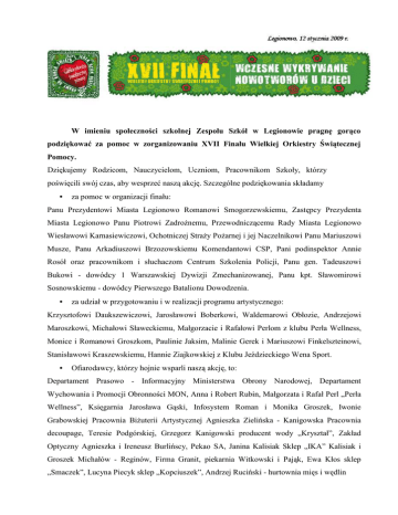 W imieniu społeczności szkolnej Zespołu Szkół w Legionowie pragnę gorąco podziękować za pomoc w zorganizowaniu XVII Finału Wielkiej Orkiestry Świątecznej Pomocy. Dziękujemy Rodzicom, Nauczycielom, Uczniom, Pracownikom Szkoły, którzy poświęcili swój czas, aby wesprzeć naszą akcję. Szczególne podziękowania składamy • za pomoc w organizacji finału: Panu Prezydentowi Miasta Legionowo Romanowi Smogorzewskiemu, Zastępcy Prezydenta Miasta Legionowo Panu Piotrowi ZadroŜnemu, Przewodniczącemu Rady Miasta Legionowo Wiesławowi Karnasiewiczowi, Ochotniczej StraŜy PoŜarnej i jej Naczelnikowi Panu Mariuszowi Musze, Panu Arkadiuszowi Brzozowskiemu Komendantowi CSP, Pani podinspektor Annie Rosół oraz pracownikom i słuchaczom Centrum Szkolenia Policji, Panu gen. Tadeuszowi Bukowi - dowódcy 1 Warszawskiej Dywizji Zmechanizowanej, Panu kpt. Sławomirowi Sosnowskiemu - dowódcy Pierwszego Batalionu Dowodzenia. • za udział w przygotowaniu i w realizacji programu artystycznego: Krzysztofowi Daukszewiczowi, Jarosławowi Boberkowi, Waldemarowi Obłozie, Andrzejowi Maroszkowi, Michałowi Sławeckiemu, Małgorzacie i Rafałowi Perlom z klubu Perła Wellness, Monice i Romanowi Groszkom, Paulinie Jaksim, Malinie Gerek i Mariuszowi Finkelszteinowi, Stanisławowi Kraszewskiemu, Hannie Ziajkowskiej z Klubu Jeździeckiego Wena Sport. • Ofiarodawcy, którzy hojnie wsparli naszą akcję, to: Departament Prasowo - Informacyjny Ministerstwa Obrony Narodowej, Departament Wychowania i Promocji Obronności MON, Anna i Robert Rubin, Małgorzata i Rafał Perl „Perła Wellness”, Księgarnia Jarosława Gąski, Infosystem Roman i Monika Groszek, Iwonie Grabowskiej Pracownia BiŜuterii Artystycznej Agnieszka Zielińska - Kanigowska Pracownia decoupage, Teresie Podgórskiej, Grzegorz Kanigowski producent wody „Kryształ”, Zakład Optyczny Agnieszka i Ireneusz Burlińscy, Pekao SA, Janina Kalisiak Sklep „IKA” Kalisiak i Groszek Michałów - Reginów, Firma Granit, piekarnia Witkowski i Pająk, Ewa Kłos sklep „Smaczek”, Lucyna Piecyk sklep „Kopciuszek”, Andrzej Ruciński - hurtownia mięs i wędlin „Somianka”, Sklep „Scorpio” Danuta i Artur Kaszniccy, Agnieszka i Mariusz Bańkowscy, Kwiaciarnia „Azalia”, Zofia Stawska - Sklep „Patech”, Mirosława i Mariusz Kondraccy Księgarnia „Bestseller”, Agencja Handlowa „Tukan”, Lucyna Piecyk sklep „Kopciuszek”, Katarzyna Rutkowska „Świat upominków”, Teresa Suska - Minczenko i Robert Oderkiewicz - firma „Oder”, Irena i Waldemar Polewacz „Mix”, Izabela i Włodzimierz Stańczak, Małgorzata i Tomasz Grzybowscy „Siódemka”, Maria i Longin Ziemińscy „SprzedaŜ ksiąŜek”, Anna Dąbrowska „Accu Chek”, FJK Małgorzata Kubicka, Dorota Wasik, Iwona Kosińska, Małgorzata Cytryńska, Marian Kłaczko, Mariusz Reszke, Marta Skawska, Michał Umiński, Marianna Zawłocka, BoŜena Jasek, Monika Krupińska, Artur Nowak, Zofia Orlof, Adriana Ptaszyńska, Krystyna Rendzyniak, Krzysztof Sejdak, Anna Wrońska. • za przygotowanie relacji z imprezy: Tomaszowi Talarskiemu z telewizji lokalnej, prasie legionowskiej: „Gazecie Miejscowej”, „To i Owo”, „Gazecie Powiatowej”, • opiekunom wolontariuszy: Jarosławowi Golatowi, Krzysztofowi Sękowskiemu, Markowi Sysie, Cezaremu Usikowi, Tadeuszowi Gołosiowi, Grzegorzowi Gwiazdowskiemu, Piotrowi Wasikowi, Januszowi Kołodziejowi, Krzysztofowi Błaszczakowi, Robertowi Przybyłowskiemu, Henrykowi Leśniakowi Stanisławowi Tarce, Marii Rusowicz, Krzysztofowi Barszczowi, Beacie Samińskiej, Beacie Rosłon, Sławomirowi Krywko, Sławomirowi Kruzińskiemu, Katarzynie Kozłowskiej, Morańskiemu, Tomaszowi Lewandowskiemu, Stanisławowi Dąbrowskiemu, Stanisławowi Jończykowi, Henrykowi Waldemarowi Kowalikowi, Robertowi Czarneckiemu, Annie Kurek. • Rodzicom prowadzącym kawiarenkę: Ewie Świtoń, Stanisławowi Tarce, Robertowi Wyrozębskiemu, Katarzynie Fonder, Marzenie Michrowskiej, p.Grzechowiak, Krystynie Ruckiej, Kindze Kasce, Dorocie Bebłacz, Agnieszce Wójcik, Agnieszce Bednarczyk, Agnieszce Kozerskiej, Katarzynie Zaporze, Jolancie Dziekońskiej, Luizie Piszczek, Barbarze Krąpiec, Wioletcie Lewańskiej, Iwonie Wodzyńskiej, Renacie Grunwald, Ewie Jakubowskiej, Annie Czarkowskiej, Dorocie Kowalik, Joannie Śliwce, M. Biernackiej, Dorocie Miller- Kalicie, Agnieszce Grochowskiej, Dorocie Przekazińskiej, Beacie Cichockiej, Joannie Dawidczyk, Dorocie Skarpetowskiej, Beacie Gołoś, Iwonie Smulik, Marcie Przybysławskiej, Beacie Klimkiewicz, BoŜenie Kostrzewie, Danucie Romańskiej, Barbarze Krąpiec. • Za przygotowanie ciast do kawiarenki podziękowania otrzymują: Edyta Szymańska, Urszula Kardynał, Monika Waldeker, Wasik Dorota, Sylwia Ziółek, Marzena Łyszkowska, Marianna Zawłocka, Katarzyna Fonder, Monika Krupińska, Anna Wrońska, Jolanta Szymańska, Zofia Orlof, Joanna Dawidczyk, Monika Chatys, Renata Łabęda, Monika Matczak, Katarzyna Musińska, Monika Bednarek, Marzena Manowiecka, Anna Hejak, Tomasz Reweda, Anna Bawor, Dorota Golańska, Krakowiak Dorota, Kowalik Joanna, Staniszewska Dorota, Barbara, Zolich, J. Szymańska, Małgorzata Walewska, Beata Nawrocka, Barbara Burzyńska, Iza Otorowska, Beata Zdybał, Małgorzata Chmiel, Anna Wnukowska, Beata Tobiś, Wioletta Lewańska, Małgorzata Minkowska, Agnieszka Grochowska, Katarzyna Wroceńska, Dorota Bargłowska, Małgorzata Grzybowska, Magdalena Dąbrowska, p. Kuska, Barbara Berdowska, Andzelika Burdzy, Marlena Luty, Krzysztof Łabędzki, Elwira Jędrzejak, Justyna Łobejko, Joanna Chodkowska, Iwona Burska, p. Niziołek, Ewa Cichocka, p. Tarka, p. Wojtaszek, p. Półgęsek, Rafał Kalinowski, Katarzyna Piątek, Lilianna Stasiak, Joanna Jeleniewicz, Anna Bartecka, Adam Błaszczak, p. Świtoń, Justyna Karkowska, Joanna Jeleniewicz, Paweł Sztark, Jolanta Wlazło, Marzena Ciesielska, Beata Guławska, Anna Helman, Katarzyna Olczak, Czaplicka Anna, Jadwiga Turkot, Beata Wlazło, Anna W
