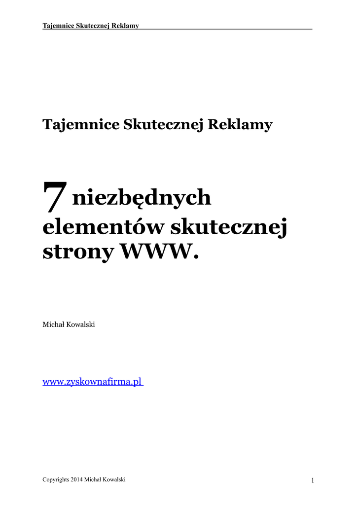 Tajemnice Skutecznej Reklamy Tajemnice Skutecznej Reklamy 7 niezbędnych elementów skutecznej strony WWW. Michał Kowalski www.zyskownafirma.pl Copyrights 2014 Michał Kowalski 1 Tajemnice Skutecznej Reklamy Co powinno znaleźć się na Twojej stronie WWW? Strona internetowa to bardzo popularna forma promocji. Jednak jej możliwości nie zawsze są w pełni wykorzystane. Nieodpowiedni dobór treści czy brak istotnych elementów wpływa na jej niską efektywność. Spytałem kilkaset osób, czego szukają na stronie salonu kosmetycznego i na jakie elementy zwracają największa uwagę. W odpowiedziach najczęściej pojawiały się te same elementy, których z kolei bardzo często brakuje na wielu witrynach. Skorzystanie z tej wiedzy pozwoli na przygotowanie strony internetowej, która dzięki odpowiedniej zawartości poprowadzi klienta jak za rączkę do chwili podjęcia pozytywnej decyzji o skorzystaniu z usług. Budując stronę zwykle skupiamy się na efektownej grafice zapominając a tym, że strona powinna motywować do z góry określonego działania. Zapełnianie grafiki przypadkowym tekstem na zasadzie zapychacza nie daje klientowi żadnej wartości i nie przekonuje go do skorzystania z Twoich usług. Czego więc tam szuka? 1. Prezentacja oferty – krótki i szczegółowy opis z wizualizacją. Jeśli ktoś czyta twoją stronę to na 99% po to, aby znaleźć na niej rozwiązanie swojego problemu. Jeśli tego nie znajdzie przejdzie na stronę konkurencji. Aby tego nie zrobił twoja oferta musi znaleźć się na pierwszym, bardzo widocznym miejscu. Nikt nie będzie się domyślał, jakie usługi oferujesz. Nikt nie będzie poszukiwał informacji w gąszczu podstron. Najczęściej na stronie głównej znajdujemy tekst powitalny, aktualności lub co gorsze – flashową animację. To tak naprawdę jest mało interesujące. Nie tego oczekujemy. Na efekty specjalne chodzimy do kina. Copyrights 2014 Michał Kowalski 2 Tajemnice Skutecznej Reklamy Na pierwszym ekranie użytkownik powinien znaleźć interesująca go usługę, choćby w formie jednego wyrazu, które najlepiej opisuje daną potrzebę. W zasadzie to użytkownik szuka konkretnych słów opisujących jego pragnienia i rozwiązania problemów. Poznaj te słowa i wkomponuj do swojej oferty. Ofertę najlepiej streścić najkrócej jak to możliwe. Jeśli nie umieścisz czytelnego przeglądu swojej oferty na pierwszej stronie wiele osób po prostu opuści twoją stronę i będzie szukać dalej. Ludzie są niecierpliwi, zwłaszcza w Internecie. Jeśli ktoś już znajdzie usługę, której szuka z pewnością będzie chciał się dowiedzieć więcej. Ludzie zainteresowani oczekują szczegółów i wyczerpującej informacji. Dlatego po krótkim przedstawieniu usługi każdy powinien z łatwością znaleźć szczegółowy opis. Niepełne i zdawkowe informacje zniechęcają do oferty. Napisz jak najwięcej o usłudze na osobnej podstronie zachowując przejrzystość i czytelność. Im więcej konkretnych informacji przedstawisz tym lepiej. Ważne żeby to były przydatne kwestie, a nie lanie wody. Nie zapomnij dodać zdjęć. Zdjęcia są bardzo ważne. Nawet, jeśli Twoje usługi trudno sfotografować warto postarać się o zdjęcie lub obrazek, które przynajmniej symbolizować będzie Twoją ofertę. Wizualizacja pomaga w wyborze i zapamiętaniu, co przybliża klienta do transakcji. 2. Zdjęcia – jak wygląda w środku, czy jest czysto i przyjemnie. Ponad 90% ludzi wchodzi na stronę www, aby zobaczyć jeszcze przed wizytą jak wygląda w środku. Nie ważne czy jest to restauracja, solarium, bar czy ekskluzywne day spa, każdy chce sprawdzić czy jest czysto i przyjemnie. W zależności od charakteru firmy analizie poddawany jest wystrój, wyposażenie a nawet wygląd pracowników. Brak zdjęć od razu dyskwalifikuje cię w tej konkurencji. Jednak nieodpowiednie zdjęcia będą jeszcze gorszą rekomendacją, bo staną się dowodem na to, że nie warto tam przychodzić. Copyrights 2014 Michał Kowalski 3 Tajemnice Skutecznej Reklamy Zadbaj o dużą ilość zdjęć dobrej jakości, które prezentują twoje wnętrza w jak najlepszym świetle. Prezentuj na zdjęciach wszystko to, co wydaje ci się atrakcyjne i warte uwagi. Umieść zdjęcia na każdej podstronie a także w specjalnej „galerii”. Warto w tym celu zatrudnić profesjonalnego fotografa. Nie ma nic gorszego niż „płaskie” niedoświetlone zdjęcia robione amatorskim aparatem. Zatrudnienie fotografa to jednorazowy wydatek, który procentować będzie przez wiele lat. Robiąc zdjęcia pamiętaj, aby zatroszczyć się o ludzi. Zdjęcia z ludźmi będą tysiąc razy skuteczniejsze niż zdjęcia pustych pomieszczeń. Zdjęcia nawet najładniejszych pomieszczeń są smutne, jeśli nie ma tam ludzi. Wyobraź sobie, że Twój mózg w ciągu jednej sekundy potrafi rozpoznać w tłumie twarz osoby, którą widziałeś kilka lat temu i określić, w jakim jest ona nastroju. Można powiedzieć, że mamy od setek tysięcy lat zaprogramowaną funkcję „rozpoznawania twarzy”. Człowiek to przecież istota społeczna. Widząc twarz automatycznie i podświadomie włączają się w naszych głowach mechanizmy odpowiedzialne za wiele pozytywnych emocji takich jak przyjaźń, miłość itp. Dlaczego tego nie wykorzystać? No właśnie, dlaczego tak wiele zdjęć przedstawia puste pomieszczenia? Nawet najlepsze zdjęcie pustego pomieszczenia będzie działać negatywnie i odpychająco. Nie chcemy być sami, pragniemy być w grupie o podświadomie wybieramy miejsca gdzie są ludzie. Pokaż na zdjęciach, że w Twojej firmie są ludzie. To doskonała rekomendacja. 3. Opinie – dowód społeczny i budowanie zaufania. Popularność Internetu bierze się między innym stąd że możemy tam znaleźć niezależne opinie na prawie każdy temat. Opinie mają potężną siłę przekonywania. Co skłania cię do skorzystania z oferty danej firmy: - Przede wszystkim opinie osób, które skor