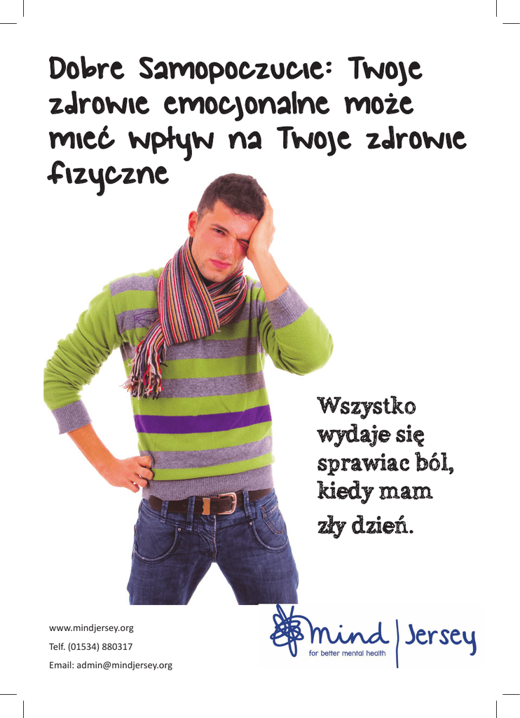 Dobre Samopoczucie: Twoje Keeping well: Your emotional health zdrowie emocjonalne może yournaphysical can miećimpact wpływ Twoje health zdrowie fizyczne Wszystko Everything wydaje seems tosię hurt sprawiac when I’m ból, kiedy mam having a bad zły dzień. day. www.mindjersey.org Telf. (01534) 880317 Email: [email protected] Czas na odpoczynek... • Podczas przerwy, po prostu sie zatrzymaj , weź gle boki oddech, delikatnie wypusc powietrze przez usta i zatrzymaj sie na chwilę. • Gdziekolwiek jestes, po prostu naucz się zwolnić chociaż na krótką chwilę. Ciągly pospiech, gorączkowosc, nie pomoże osiągnąć wiele na dluższa mete z wyjątkiem wyczerpania. Przemyśl swoje działania, nie pozwól aby staly się po prostu przypadkowym zbiorem zdarzeń. • Postaraj sie spostrzegac przyjemne rzeczy wokół siebie, nawet te najdrobniejsze. • Pozwol sobie na chwile nieuwagi. Spojrz przez okno, i ciesz się widokiem. • Znajdz równowagę między aktywnością, odpoczynkiem i zabawą - to ma zasadnicze znaczenie dla zdrowego relaksu. • Uśmiechaj się, śmiech wzmaga produkcie endorfin “hormony szczescia”, ktore pomogą Ci poczuć się bardziej zrelaksowanym. • Pamietaj , życie nigdy nie powinno byc na tyle ciężkie, aby zapomninac o przyjemnych chwilach. • Zrob coś zabawnego.