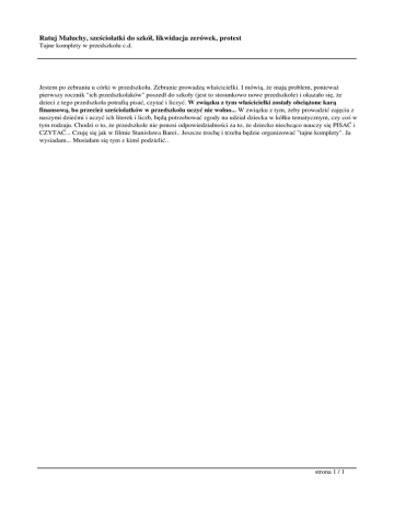 Ratuj Maluchy, sześciolatki do szkół, likwidacja zerówek, protest Tajne komplety w przedszkolu c.d. Jestem po zebraniu u córki w przedszkolu. Zebranie prowadzą właścicielki. I mówią, że mają problem, ponieważ pierwszy rocznik "ich przedszkolaków" poszedł do szkoły (jest to stosunkowo nowe przedszkole) i okazało się, że dzieci z tego przedszkola potrafią pisać, czytać i liczyć. W związku z tym właścicielki zostały obciążone karą finansową, bo przecież sześciolatków w przedszkolu uczyć nie wolno... W związku z tym, żeby prowadzić zajęcia z naszymi dziećmi i uczyć ich literek i liczb, będą potrzebować zgody na udział dziecka w kółku tematycznym, czy coś w tym rodzaju. Chodzi o to, że przedszkole nie ponosi odpowiedzialności za to, że dziecko niechcąco nauczy się PISAĆ i CZYTAĆ... Czuję się jak w filmie Stanisława Barei.. Jeszcze trochę i trzeba będzie organizować "tajne komplety". Ja wysiadam... Musiałam się tym z kimś podzielić.. strona 1 / 1