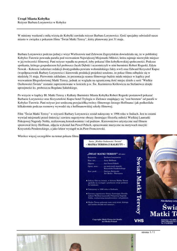 Urząd Miasta Kobyłka Reżyser Barbara Lorynowicz w Kobyłce W miniony weekend z miłą wizytą do Kobyłki zawitała reżyser Barbara Lorynowicz. Gość specjalny odwiedził nasze miasto w związku z pokazem filmu "Świat Matki Teresy", który planowany jest 31 maja. Barbara Lorynowicz podczas jednej z wizyt Wieliszewie nad Zelewem Zegrzyńskim dowiedziała się, że w pobliskiej Kobyłce-Turowie powstała parafia pod wezwaniem Największej Misjonarki Miłości, która zajmuje niezwykłe miejsce w jej twórczości filmowej. Pani reżyser wpadła na pomysł, żeby pokazać film kobyłkowskiej społeczności. Podczas spotkania, którego gospodarzem był proboszcz Jacek Dębski i uczestniczyli w nim burmistrz Robert Roguski, Edyta Nowak - Kokosza (sekretarz redakcji dwutygodnika powiatu wołomińskiego fakty.wwl) oraz Edward Krzysztof Kupsz (współpracownik Barbary Lorynowicz i kierownik produkcji projektu) ustalono, że pokaz filmu odbędzie się w niedzielę 31 maja. Pierwotnie zakładano, że prezentacja seansu filmowego będzie miała miejsce w kaplicy pod wezwaniem Błogosławionej Matki Teresy, jednak ze względu na ograniczoną ilość miejsc dzieło z serii "Wielkie Osobowości Świata" zostanie zaprezentowane w kościele p.w. Św. Kazimierza Królewicza na Stefanówce dzięki uprzejmości ks. proboszcza Bogdana Sałańskiego. Po wizycie w kaplicy Bł. Matki Teresy z Kalkuty Burmistrz Miasta Kobyłka Robert Roguski postanowił pokazać Barbarze Lorynowicz oraz Krzysztofowi Kupsz hotel Trylogia w Zielonce znajdujący się "rzut beretem" od parafii w Kobyłce-Turowie. Pani reżyser jest serdeczną przyjaciółką twórcy filmowego Jerzego Hoffmana i jak podkreślała kilkakrotnie podczas rozmowy wywodzi się z hoffmanowskiej szkoły filmowej. Film "Świat Matki Teresy" w reżyserii Barbary Lorynowicz został nakręcony w 1996 roku w Indiach. Jest to ostatni wywiad misjonarki przed śmiercią i zawiera sugestywne obrazy ilustrujące filozofię miłości Wielkiej Laureatki Pokojowej Nagrody Nobla, realizowaną konsekwentnie i od podstaw. Kierownictwo artystyczne nad filmem sprawował Jerzy Hoffman, zdjęcia wykonał Jan Paweł Pełech, opracowanie muzyczne na motywach muzyki Krzysztofa Pendereckiego, a jako lektor wystąpił m.in.Piotr Fronczewski. Wkrótce więcej szczegółów na temat pokazu filmu. strona 1 / 1