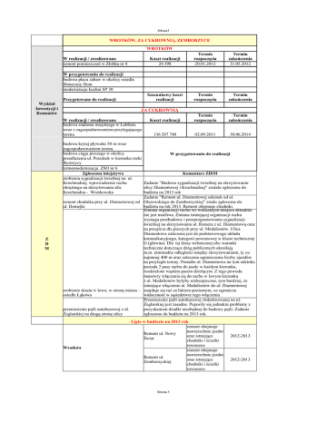 Arkusz1 WROTKÓW, ZA CUKROWNIĄ, ZEMBORZYCE WROTKÓW W realizacji / zrealizowano remont pomieszczeń w Żłobku nr 8 Koszt realizacji 24 398 Termin rozpoczęcia 20.01.2012 Termin zakończenia 31.05.2012 Szacunkowy koszt realizacji Termin rozpoczęcia Termin zakończenia Koszt realizacji Termin rozpoczęcia Termin zakończenia 136 207 740 02.09.2011 30.06.2014 W przygotowaniu do realizacji budowa placu zabaw w okolicy osiedla Słoneczny Dom modernizacja kuchni SP 30 Wydział Inwestycji i Remontów Przygotowane do realizacji ZA CUKROWNIĄ W realizacji / zrealizowano budowa stadionu miejskiego w Lublinie wraz z zagospodarowaniem przylegającego terenu Z D M budowa krytej pływalni 50 m wraz zagospodarowaniem terenu. budowa ciągu pieszego w okolicy W przygotowaniu do realizacji przedłużenia ul. Przeskok w kierunku rzeki Bystrzycy termomodernizacja ZSO nr 6 Zgłoszona inicjatywa Komentarz ZDiM zrobienia sygnalizacji świetlnej na ul. Krochmalnej, wprowadzenie ruchu Zadanie "Budowa sygnalizacji świetlnej na skrzyżowaniu okrężnego na skrzyżowaniu ulic ulicy Diamentowej i Krochmalnej" zostało zgłoszone do Krochmalna - Wrotkowska budżetu na 2013 rok Zadanie "Remont ul. Diamentowej odcinek od ul. remont chodnika przy ul. Diamentowej od Olszewskiego do Zemborzyckiej" zstało zgłoszone do ul. Domejki budżetu na rok 2013. Remont obejmuje chodniki. Zmiana organizacji ruchu we wskazanym miejscu aktualnie nie jest możliwa. Zmiana istniejącej organizacji ruchu wymaga przebudowy i przeprogramowania sygnalizacji świetlnej na skrzyżowaniu ul. Romera z ul. Diamentową oraz na przejściu dla pieszych przy ul. Medalionów. Ulica Diamentowa zaliczona jest do podstawowego układu komunikacyjnego, kategorii powiatowej w klasie technicznej G (główna). Dla tej klasy technicznej ulic warunki techniczne dotyczące dróg publicznych określają m.in. minimalne odległości między skrzyżowaniami, tj. co najmniej 400 m oraz zalecenia ograniczenia liczby zjazdów na przyległe tereny. Ponadto ul. Diamentowa na tym odcinku posiada 2 pasy ruchu do jazdy w każdym kierunku, rozdzielone wąskim pasem dzielącym. Z tego powodu manewry włączania się do ruchu w lewym kierunku z ul. Medalionów byłyby niebezpieczne, tym bardziej, że istniejące włączenie ul. Medalionów do ul. Diamentowej zrobienie skrętu w lewo, w stronę miasta – znajduje się tuż za łukiem poziomym, co ogranicza osiedle Łąkowa widoczność w sąsiedztwie tego włączenia. Przeniesienie pętli autobusowej zlokalizowanej na ul. Żeglarskiej jest zasadne. Pojawiły się jednakże problemy z przeniesienie pętli autobusowej z ul. pozyskaniem działki niezbędnej do budowy pętli. Zadanie Żeglarskiej na drugą stronę ulicy zgłoszone do budżetu na 2013 rok. Wrotków Ujęte w budżecie na 2013 rok remont obejmuje nawierzchnie jezdni Remont ul. Nowy oraz istniejące Świat chodniki i ścieżki rowerowe remont obejmuje nawierzchnie jezdni Remont ul. oraz istniejące Zemborzyckiej chodniki i ścieżki rowerowe Strona 1 2012-2013 2012-2013 Arkusz1 Zadania zgłoszone do budżetu na 2013 rok Dzielnica Nazwa zadania Infrastruktura przystankowa na terenie miasta Lublin dokumentacja i budowa 30 nowych zatok przystankowych Remont ul. Diamentowej odcinek od ul. Olszewskiego do Zemborzyckiej remont obejmuje nawierzchnie jezdni oraz istniejące chodniki i ścieżki rowerowe remont obejmuje nawierzchnie jezdni oraz istniejące chodniki i ścieżki rowerowe remont obejmuje nawierzchnie jezdni oraz istniejące chodniki i ścieżki rowerowe Remont ul. Nałkowskich Remont ul. Olszewskiego Wrotków Zakres Budowa sygnalizacji świetlnej na skrzyżowaniu ulicy Diamentowej i ulicy Opracowanie dokumentacji oraz roboty Samsonowicza wraz z budową drogi obsługującej przy ul. Diamentowej od ul. budowlane we wszystkich branżach Olszewskiego do ul. Romera oraz budowa sygnalizacji świetlnej dla rowerzystów. Wykonanie ścieżki rowerowej na ul. Opracowanie dokumentacji oraz roboty Diamentowej na odcinku od ul Medalionów budowlane we wszystkich branżach do ul. Zemborzyckiej Realizacja Inwestycji / Remontu Inwestycja Kontynuowana 2011-2014 2013-2014 2013-2014 2013-2014 Nowa Inwestycja 2013 Nowa Inwestycja 2013 Wrotków/Zemb Wykonanie nowej pętli autobusowej w ulicy Żeglarskiej orzyce Opracowanie dokumentacji oraz roboty Nowa Inwestycja budowlane we wszystkich branżach wraz z 2013 budową wiaty rowerowej na 20 rowerów. Wrotków/Zemb Przebudowa mostu w ul. Żeglarskiej orzyce Opracowanie dokumentacji oraz roboty budowlane Nowa Inwestycja 2013-2014 Opracowanie dokumentacji oraz roboty budowlane Nowa Inwestycja 2013-2014 Przebudowa mostu w ul. Cienistej Zemborzyce Dokończenie inwestycji dot. budowy Opracowanie dokumentacji oraz roboty oświetlenia drogowego wzdłuż ul. Cienistej budowlane we wszystkich branżach Inwestycja Kontynuowana 2012-2013 Budowa chodnika z ulicy Parczewskiej do Opracowanie dokumentacji oraz roboty ścieżki rowerowej na osiedlu Nałkowskich budowlane we wszystkich branżach Nowa Inwestycja 2013 Przebudowa pętli autobusowej „Dąbrowa” Przebudowa pętli autobusowej „Dąbrowa” Nowa Inwestycja Zemborzyce/Ab przy ul. Osmolickiej z budową wiaty przy ul. Osmolickiej. 2013-2014 ramowice rowerowej na 10 rowerów Remont mostu w ul. Wolskiej remont mostu 2013-2015 Etap I: realizacja w ramach dróg dojazdowych do stadionu miejskiego: ul. Lubelskiego Lipca 80, Muzyczna (od rz. Bystrzycy do skrzyżowania Lubelskiego Lubelski Lipiec '80 (trasa zielona ) - drogi Lipca 80, Nadłączna (od skrzyżowania z ul. Inwestycja dojazdowe do stadionu (wraz z budową Lubelskiego Lipca 80 do skrzyżowania Kontynuowana infrastruktury rowerowej) Krochmalna, Gazowa, Młyńska wraz ze 2006-2016 skrzyżowaniem ulica łącząca Lubelskiego Lipca 80 z ul. Krochmalną). Etap II: budowa odcinka od stadionu miejskiego do Za Cukrownią ul. Krochmalnej Budowa sygnalizacji świetlnej na skrzyżowaniu ulicy Diamentowej i Krochmalnej oraz budowa sygnalizacji 