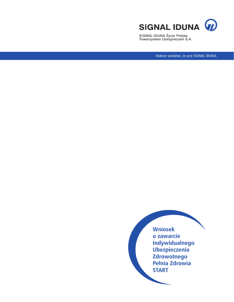 Dobrze wiedzieć, że jest SIGNAL IDUNA. Wniosek o zawarcie Indywidualnego Ubezpieczenia Zdrowotnego Pełnia Zdrowia START Wniosek o zawarcie Indywidualnego Ubezpieczenia Zdrowotnego Pełnia Zdrowia START WNIOSEK PROSIMY WYPEŁNIĆ CZYTELNIE, DRUKOWANYMI LITERAMI, CZARNYM LUB NIEBIESKIM DŁUGOPISEM Numer polisy Numer aplikacji 1. POŚREDNIK UBEZPIECZENIOWY Numer pośrednika Oddział / Agencja Nazwisko i imię agenta Nr RAU OWCA Telefon agenta nr kierunkowy nr telefonu nr wewnętrzny nr telefonu komórkowego 2. UBEZPIECZAJĄCY Nazwisko/Nazwa Imiona Narodowość Typ formy prawnej PESEL/ NIP/REGON Zawód wykonywany/rodzaj wykonywanej działalności osoba fizyczna osoba prawna* jednostka organizacyjna nie posiadająca osobowości prawnej, fundacja lub stowarzyszenie * jeżeli spółka akcyjna notowana na rynku regulowanym - podać gdzie e-mail Telefon nr kierunkowy nr telefonu Adres zameldownia /siedziby nr wewnętrzny ulica nr telefonu komórkowego nr domu nr lokalu (proszę wypełnić w przypadku, gdy jest inny niż adres zameldowania /siedziby) kod pocztowy miejscowość województwo Adres korespondencyjny poczta ulica nr domu nr lokalu poczta kod pocztowy miejscowość województwo 3. UBEZPIECZONY 1 (wypełnić w przypadku, gdy Główny Ubezpieczony nie jest Ubezpieczającym) Nazwisko i imię PESEL Zawód wykonywany e-mail: Telefon nr kierunkowy nr telefonu nr wewnętrzny nr telefonu komórkowego Adres ulica nr domu nr lokalu poczta nr lokalu kod pocztowy miejscowość województwo 4. UBEZPIECZONY 2 (w przypadku dzieci Głównego Ubezpieczonego w rubryce zawód wykonywany prosimy podać: uczeń / student / inne) Nazwisko i imię PESEL Zawód wykonywany e-mail: Telefon nr kierunkowy nr telefonu nr wewnętrzny nr telefonu komórkowego Adres ulica nr domu poczta nr lokalu nr lokalu kod pocztowy miejscowość województwo Stopień pokrewieństwa (powinowactwa) z Głównym Ubezpieczonym 5. UBEZPIECZONY 3 (w przypadku dzieci Głównego Ubezpieczonego w rubryce zawód wykonywany prosimy podać: uczeń / student / inne) Nazwisko i imię PESEL Zawód wykonywany e-mail: Telefon nr kierunkowy nr telefonu nr wewnętrzny nr telefonu komórkowego Adres ulica nr domu nr lokalu poczta nr lokalu województwo Stopień pokrewieństwa (powinowactwa) z Głównym Ubezpieczonym miejscowość kod pocztowy 6. WARIANT PŁATNOŚCI I KWOTA SKŁADKI DO ZAPŁATY (wyrażona w polskich złotych; proszę zaznaczyć wybrany wariant płatności znakiem X we właściwym polu) Cykl płatności musi być ten sam dla wszystkich Ubezpieczonych. Ubezpieczony nr 1 Cykl płatności wiek 15-40 6 6 6 6 miesięczny kwartalny półroczny roczny 79,00 234,63 464,52 910,08 Ubezpieczony nr 2 wiek 1-14 lub 41-60 6 6 6 6 89,00 264,33 523,32 1 025,28 Wnioskowana data rozpoczęcia ochrony ubezpieczeniowej: 6 6 6 6 D D 6 6 6 6 79,00 234,63 464,52 910,08 M M R Ubezpieczony nr 3 wiek 1-14 lub 41-60 wiek 15-40 R 89,00 264,33 523,32 1 025,28 wiek 1-14 lub 41-60 wiek 15-40 6 6 6 6 6 6 6 6 79,00 234,63 464,52 910,08 Łączna wysokość raty 89,00 264,33 523,32 1 025,28 R R Zaproponowana składka może się różnić maksymalnie o +/- 0,50 zł od składki wskazanej na polisie, natomiast w przypadku konieczności indywidualnej oceny ryzyka jest określana przez SIGNAL IDUNA Życie Polska TU S.A. Nie Czy łączna składka roczna (uroczniona) przekracza równowartość 1 000 EUR*? Tak** * wg średniego kursu EUR/PLN publikowanego przez NBP w dniu podpisania wniosku. ** w przypadku zaznaczenia odpowiedzi „Tak” należy wypełnić punkt 9 wniosku. 7. NUMER KONTA BANKOWEGO UBEZPIECZAJĄCEGO Numer konta bankowego Ubezpieczającego: (konieczny do wypłaty premii pieniężnej) 8. OŚWIADCZENIE Oświadczam, że: 1.Udzieliłem(am) odpowiedzi na pytania zawarte we wniosku zgodnie z prawdą i wyczerpująco oraz przyjmuję do wiadomości, że podanie informacji niezgodnych z prawdą lub zatajenie informacji stanowi naruszenie umowy ubezpieczenia i może skutkować brakiem odpowiedzialności SIGNAL IDUNA Życie Polska Towarzystwo Ubezpieczeń S.A. 2.Wyrażam zgodę na występowanie w trybie przepisów art. 22 ust. 1-5 ustawy o działalności ubezpieczeniowej przez SIGNAL IDUNA Życie Polska Towarzystwo Ubezpieczeń S.A. do zakładów opieki zdrowotnej i innych podmiotów, o których mowa w przepisie art. 4 ustawy o zakładach opieki zdrowotnej, tudzież do innych zakładów ubezpieczeń, z pytaniami i prośbami dotyczącymi okoliczności wymienionych w powołanych przepisach ustawy o działalności ubezpieczeniowej, a w szczególności mojego stanu zdrowia i udzielonych mi usług zdrowotnych. 3.Oświadczam, że doręczone mi zostały Ogólne Warunki Ubezpieczenia, Szczególne Warunki Ubezpieczenia oraz Katalog Świadczeń Gwarantowanych obowiązujące w dniu zawarcia umowy i zapoznałem(am) się z ich treścią. Zapoznałem(am) się również z treścią i zakresem pełnomocnictwa wystawionego przez SIGNAL IDUNA Życie Polska TU S.A. agentowi, który przyjął wniosek. Wyrażam zgodę na przekazanie informacji o zawarciu umowy ubezpieczenia do Placówek Medycznych SIGNAL IDUNA Życie Polska Towarzystwo Ubezpieczeń S.A. 4.Wyrażam zgodę na przetwarzanie przez SIGNAL IDUNA Polska TU S.A., SIGNAL IDUNA Życie Polska TU S.A. a także przez inne spółki koncernu SIGNAL IDUNA Gruppe, zarówno obecnie jak i w przyszłości, moich danych osobowych, podanych przeze mnie dobrowolnie, dla celów związanych z prowadzoną działalnością ubezpieczeniową oraz dla celów marketingowych, zgodnie z Ustawą z dnia 29 sierpnia 1997 r. o ochronie danych osobowych (t.j. Dz. U. z 2002 r., Nr 101, poz. 926, z późn. zmianami). Ponadto przyjmuję do wiadomości, iż mam prawo do wglądu do moich danych oraz do ich poprawiania. tak nie 5.Zostałem poinformowany o prawie dostępu do moich danych osobowych i ich poprawiania oraz o podstawie prawnej przetwarzania moich danych osobowych, art. 24 ust. 1 ustawy z dnia 22 maja 2003 r. o działalności ubezpieczeniowej (Dz.U. z 2003 r.