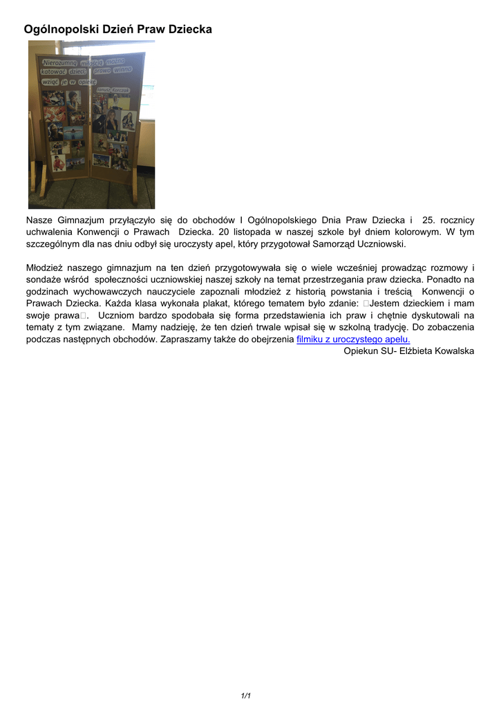Ogólnopolski Dzień Praw Dziecka Nasze Gimnazjum przyłączyło się do obchodów I Ogólnopolskiego Dnia Praw Dziecka i 25. rocznicy uchwalenia Konwencji o Prawach Dziecka. 20 listopada w naszej szkole był dniem kolorowym. W tym szczególnym dla nas dniu odbył się uroczysty apel, który przygotował Samorząd Uczniowski. Młodzież naszego gimnazjum na ten dzień przygotowywała się o wiele wcześniej prowadząc rozmowy i sondaże wśród społeczności uczniowskiej naszej szkoły na temat przestrzegania praw dziecka. Ponadto na godzinach wychowawczych nauczyciele zapoznali młodzież z historią powstania i treścią Konwencji o Prawach Dziecka. Każda klasa wykonała plakat, którego tematem było zdanie: Jestem dzieckiem i mam swoje prawa . Uczniom bardzo spodobała się forma przedstawienia ich praw i chętnie dyskutowali na tematy z tym związane. Mamy nadzieję, że ten dzień trwale wpisał się w szkolną tradycję. Do zobaczenia podczas następnych obchodów. Zapraszamy także do obejrzenia filmiku z uroczystego apelu. Opiekun SU- Elżbieta Kowalska 1/1