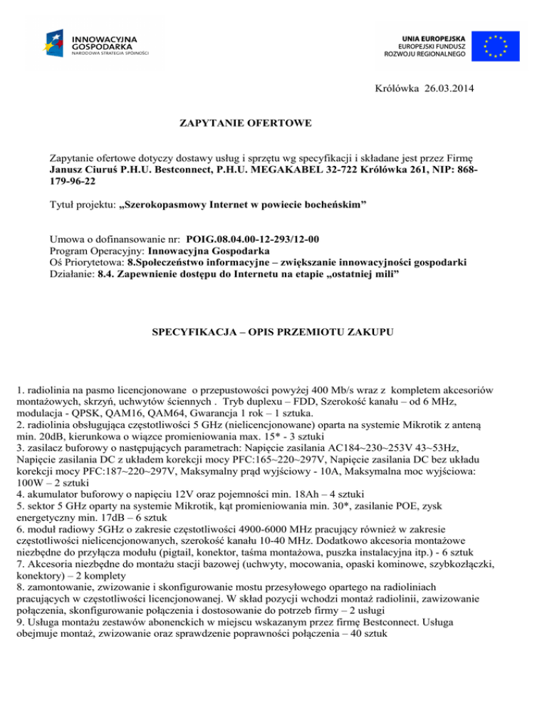 Królówka 26.03.2014 ZAPYTANIE OFERTOWE Zapytanie ofertowe dotyczy dostawy usług i sprzętu wg specyfikacji i składane jest przez Firmę Janusz Ciuruś P.H.U. Bestconnect, P.H.U. MEGAKABEL 32-722 Królówka 261, NIP: 868179-96-22 Tytuł projektu: „Szerokopasmowy Internet w powiecie bocheńskim” Umowa o dofinansowanie nr: POIG.08.04.00-12-293/12-00 Program Operacyjny: Innowacyjna Gospodarka Oś Priorytetowa: 8.Społeczeństwo informacyjne – zwiększanie innowacyjności gospodarki Działanie: 8.4. Zapewnienie dostępu do Internetu na etapie „ostatniej mili” SPECYFIKACJA – OPIS PRZEMIOTU ZAKUPU 1. radiolinia na pasmo licencjonowane o przepustowości powyżej 400 Mb/s wraz z kompletem akcesoriów montażowych, skrzyń, uchwytów ściennych . Tryb duplexu – FDD, Szerokość kanału – od 6 MHz, modulacja - QPSK, QAM16, QAM64, Gwarancja 1 rok – 1 sztuka. 2. radiolinia obsługująca częstotliwości 5 GHz (nielicencjonowane) oparta na systemie Mikrotik z anteną min. 20dB, kierunkowa o wiązce promieniowania max. 15* - 3 sztuki 3. zasilacz buforowy o następujących parametrach: Napięcie zasilania AC184~230~253V 43~53Hz, Napięcie zasilania DC z układem korekcji mocy PFC:165~220~297V, Napięcie zasilania DC bez układu korekcji mocy PFC:187~220~297V, Maksymalny prąd wyjściowy - 10A, Maksymalna moc wyjściowa: 100W – 2 sztuki 4. akumulator buforowy o napięciu 12V oraz pojemności min. 18Ah – 4 sztuki 5. sektor 5 GHz oparty na systemie Mikrotik, kąt promieniowania min. 30*, zasilanie POE, zysk energetyczny min. 17dB – 6 sztuk 6. moduł radiowy 5GHz o zakresie częstotliwości 4900-6000 MHz pracujący również w zakresie częstotliwości nielicencjonowanych, szerokość kanału 10-40 MHz. Dodatkowo akcesoria montażowe niezbędne do przyłącza modułu (pigtail, konektor, taśma montażowa, puszka instalacyjna itp.) - 6 sztuk 7. Akcesoria niezbędne do montażu stacji bazowej (uchwyty, mocowania, opaski kominowe, szybkozłączki, konektory) – 2 komplety 8. zamontowanie, zwizowanie i skonfigurowanie mostu przesyłowego opartego na radioliniach pracujących w częstotliwości licencjonowanej. W skład pozycji wchodzi montaż radiolinii, zawizowanie połączenia, skonfigurowanie połączenia i dostosowanie do potrzeb firmy – 2 usługi 9. Usługa montażu zestawów abonenckich w miejscu wskazanym przez firmę Bestconnect. Usługa obejmuje montaż, zwizowanie oraz sprawdzenie poprawności połączenia – 40 sztuk 10. Zestaw Abonencki oparty na systemie Mikrotik, antena 16dBi, moduł radiowy: 911G, adapter POE, częstotliwość obsługiwana: 5-6 GHz (nielicencjonowana), zasilacz 16V – 40 sztuk Termin dostawy: max. 4 dni robocze od złożenia zamówienia na zakup Termin i forma płatności: minimum 7 dni od daty dostawy na podstawie faktury VAT, przelew Gwarancja - min. 12 miesięcy Zamówienie zrealizowane będzie w drugim kwartale 2014 roku. 1. a. b. c. 2. 3. 4. 5. 6. Zawartość oferty oraz warunki ogólne: dane oferent: pełna nazwa oraz adres pocztowy, numer wpisu do KRS, EGD lub innego właściwego rejestru (wskazanie jego nazwy), adres poczty elektronicznej oraz numer telefonu osoby kontaktowej; datę sporządzenia i termin ważności oferty; cenę całkowitą (PLN) netto i brutto oraz ceny dla poszczególnych kategorii; warunki i termin płatności; warunki gwarancji; podpis osoby lub osób upoważnionych do reprezentowania oferenta. Kryterium oceny oferty: Wybór najkorzystniejszej oferty nastąpi w oparciu o kryterium najniższej ceny dla całego zapytania. Zamawiający po dokonaniu oceny ofert zaproponuje oferentowi, który zostanie wybrany dostarczenie sprzętu i usług. Oferta może być złożona: - w formie papierowej przesyłką pocztową na adres: PHU Bestconnect 32-722 Królówka 261 - w formie papierowej w siedzibie firmy: : PHU Megakabel Połom Duży 175 32-720 Nowy Wiśnicz Termin składania ofert mija 29.03.2014 r. Decyduje data dostarczenia oferty pod wskazany powyżej adres. Niniejsze zapytanie ofertowe przesłano drogą mailową do potencjalnych oferentów (dostawców) oraz zamieszczono na stronie internetowej firmy : www.bestconnect.pl