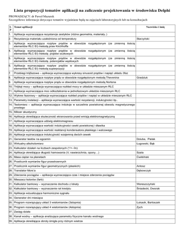 Lista propozycji tematów aplikacji na zaliczenie projektowania w środowisku Delphi PROWADZĄCY: dr Paweł Mazurek Szczegółowe informacje dotyczące tematów wyjaśniane będą na zajęciach laboratoryjnych lub na konsultacjach Nazwisko i imię L Temat aplikacji P 1. Aplikacja wyznaczająca rezystancje zestyków (różna geometria, materiały..) 2. Rezystancja materiału uzależniona od temperatury 3. Aplikacja wyznaczająca rozpływ prądów w obwodzie rozgałęzionym (ze zmienną ilością elementów RLC EI) metodą praw Kirchhoffa 4. Aplikacja wyznaczająca rozpływ prądów w obwodzie rozgałęzionym (ze zmienną ilością elementów RLC EI) metodą prądów oczkowych 5. Aplikacja wyznaczająca rozpływ prądów w obwodzie rozgałęzionym (ze zmienną ilością elementów RLC EI) metodą potencjałów węzłowych 6. Aplikacja wyznaczająca rozpływ prądów w obwodzie rozgałęzionym (ze zmienną ilością elementów RLC EI) metodą superpozycji 7. Przebiegi trójfazowe – aplikacja wyznaczająca wykresy sinusoid prądów i napięć układu 3faz 8. Aplikacja wyznaczająca rozpływ prądu w obwodzie rozgałęzionym metodą Thevenina 9. Aplikacja wyznaczająca rozpływ prądu w obwodzie rozgałęzionym metodą Nortona Starzyński Gradziuk 10. Trójkąt mocy – aplikacja wyznaczająca rozkład mocy w układzie mieszanym RLC 11. Aplikacja wyznaczająca moc odkształcenia w jednofazowym układzie mieszanym RLC 12. Wykres fazorowy – aplikacja wyznaczająca rozkład prądów i napięć w układzie mieszanym RLC 13. Parametry instalacji – aplikacja wyznaczająca wartość rezystancji, indukcyjności itp.. 14. Teslomierz – aplikacja wyznaczająca indukcje w szczelinie powietrznej obwodu magnetycznego prostego 15. Mikser akustyczny 16. Aplikacja określająca skuteczność ekranowania przed emisją elektromagnetyczną 17. Aplikacja wyznaczająca udźwig elektromagnesu 18. Aplikacja wyznaczająca wartość indukcyjności cewki powietrznej i dławika 19. Aplikacja wyznaczająca wartość reaktancji kondensatora płaskiego i walcowego 20. Aplikacja wyznaczająca indukcyjność wzajemną dwóch cewek 21. Generator testów na egzamin Dziuba, Pielak 22. Wirtualny alkoholomierz Ługowski, Bąk 23. Kalkulator działań na liczbach zespolonych (*/+-√ln) 24. Aplikacja określająca długość hamowania (V, nawierzchnia, opony…) Szala 25. Masa ciężar na planetach Ćwikliński 26. Przelicznik wymiarów figur przestrzennych 27. Przelicznik wymiarów figur geometrycznych (płaskich) Antosz 28. Translator Mors’a Dębowczyk 29. Zderzenie pociągów – aplikacja wyznaczająca czas i miejsce zderzenia pociągów 30. Mieszacz kolorów (farb) 31. Kalkulator bankowy – wyznaczenie dochodu z lokaty Wereszczyński 32. Kalkulator bankowy – wyznaczenie rat kredytu Śniadecki, Dworak 33. Aplikacja wizualizująca harmoniczne sygnału 34. Generator dni miesiąca 35. Program rozwiązujący układ 3 wielomianów (3stopnia) Łukasik, Bartoszek 36. Program rozwiązujący układ 4 wielomianów (4stopnia) Zych 37. Zasięg działa 38. Kanał wodny – aplikacja analizująca parametry fizyczne kanału wodnego 39. Aplikacja określająca obroty śmigła przy różnym wietrze