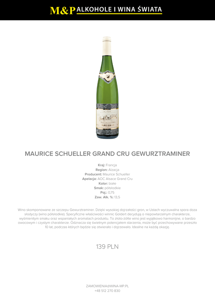MAURICE SCHUELLER GRAND CRU GEWURZTRAMINER Kraj: Francja Region: Alzacja Producent: Maurice Schueller Apelacja: AOC Alsace Grand Cru Kolor: białe Smak: półsłodkie Poj.: 0,75 Zaw. Alk. %: 13,5 Wino skomponowane ze szczepu Gewurztraminer. Dzięki wysokiej dojrzałości gron, w Ustach wyczuwalna spora doza słodyczy (wino półsłodkie). Specyficzne właściwości winnic Goldert decydują o niepowtarzalnym charakterze, wyśmienitym smaku oraz wspaniałych aromatach produktu. To złoto-żółte wino jest wyjątkowo harmonijne, o bardzo owocowym i czystym charakterze. Odznacza się świetnym potencjałem starzenia, może być przechowywane przeszło 10 lat, podczas których będzie się otwierało i dojrzewało. Idealne na każdą okazję. 139 PLN [email protected] +48 512 270 830