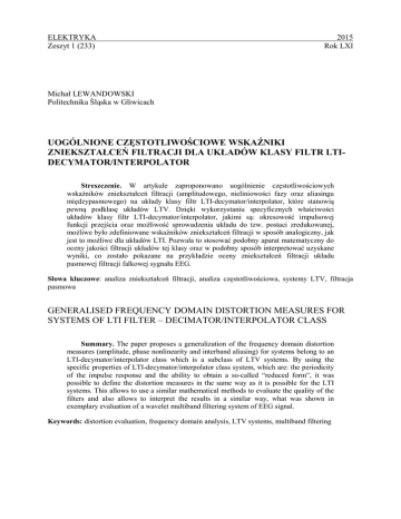 ELEKTRYKA Zeszyt 1 (233) 2015 Rok LXI Michał LEWANDOWSKI Politechnika Śląska w Gliwicach UOGÓLNIONE CZĘSTOTLIWOŚCIOWE WSKAŹNIKI ZNIEKSZTAŁCEŃ FILTRACJI DLA UKŁADÓW KLASY FILTR LTIDECYMATOR/INTERPOLATOR Streszczenie. W artykule zaproponowano uogólnienie częstotliwościowych wskaźników zniekształceń filtracji (amplitudowego, nieliniowości fazy oraz aliasingu międzypasmowego) na układy klasy filtr LTI-decymator/interpolator, które stanowią pewną podklasę układów LTV. Dzięki wykorzystaniu specyficznych właściwości układów klasy filtr LTI-decymator/interpolator, jakimi są: okresowość impulsowej funkcji przejścia oraz możliwość sprowadzenia układu do tzw. postaci zredukowanej, możliwe było zdefiniowane wskaźników zniekształceń filtracji w sposób analogiczny, jak jest to możliwe dla układów LTI. Pozwala to stosować podobny aparat matematyczny do oceny jakości filtracji układów tej klasy oraz w podobny sposób interpretować uzyskane wyniki, co zostało pokazane na przykładzie oceny zniekształceń filtracji układu pasmowej filtracji falkowej sygnału EEG. Słowa kluczowe: analiza zniekształceń filtracji, analiza częstotliwościowa, systemy LTV, filtracja pasmowa GENERALISED FREQUENCY DOMAIN DISTORTION MEASURES FOR SYSTEMS OF LTI FILTER – DECIMATOR/INTERPOLATOR CLASS Summary. The paper proposes a generalization of the frequency domain distortion measures (amplitude, phase nonlinearity and interband aliasing) for systems belong to an LTI-decymator/interpolator class which is a subclass of LTV systems. By using the specific properties of LTI-decymator/interpolator class system, which are: the periodicity of the impulse response and the ability to obtain a so-called “reduced form”, it was possible to define the distortion measures in the same way as it is possible for the LTI systems. This allows to use a similar mathematical methods to evaluate the quality of the filters and also allows to interpret the results in a similar way, what was shown in exemplary evaluation of a wavelet multiband filtering system of EEG signal. Keywords: distortion evaluation, frequency domain analysis, LTV systems, multiband filtering 94 M. Lewandowski 1. WPROWADZENIE W przypadku rzeczywistych układów filtrujących często zachodzi potrzeba oceny zniekształceń, jakie dany układ wnosi do filtrowanego sygnału [14], [1]. Zniekształcenia filtracji można opisywać względem parametrów (charakterystyk) układów [5] bądź też względem sygnałów filtrowanych przez te układy [11]. Dodatkowo zniekształcenia można zdefiniować w jednej z wybranych dziedzin (np. czasu, częstotliwości, transformaty Z). Skutkiem tak szerokich możliwości wyboru sposobu opisu zniekształceń jest duża swoboda w konstruowaniu funkcjonałów określających wskaźniki jakości filtracji. Wygodnym sposobem opisu zniekształceń od strony parametrów układów jest przyjęcie, że oceniamy badany układ względem pewnego referencyjnego układu odniesienia [5]. W układzie przedstawionym na rys.1 wejściowy dyskretny sygnał x[i] jest podawany równocześnie na badany filtr LTI (ang. linear time-invariant – liniowy czasowo niezmienniczy) o impulsowej funkcji przejścia h[i] oraz filtr odniesienia opisany funkcją h0[i]. x[i] filtr odniesienia h0[i] y0[i] filtr badany h[i] y[i] Rys. 1. Metoda oceny zniekształceń filtracji wykorzystująca referencyjny filtr odniesienia Fig. 1. Evaluation of filtering distortion using reference filter Metoda wykorzystująca filtr odniesienia pozwala w elastyczny sposób zdefiniować funkcjonały opisujące rozpatrywane typy zniekształceń filtracji (amplitudowe, fazowe, opóźnienia itd.) w zależności od wyboru tego filtru. W pracy [5] przedstawiono definicje funkcjonałów opisujących trzy częstotliwościowe wskaźniki zniekształceń filtracji: amplitudowy, nieliniowości fazy oraz aliasingu międzypasmowego, które zostały zdefiniowane dla układów LTI. Interpretację wskaźników przedstawionych w [5] przedstawiono na rys.2. Charakterystykę częstotliwościową badanego filtru LTI oznaczono H(f), a charakterystykę filtru odniesienia jako H0(f). Kolorem szarym oznaczono obszary, których pole powierzchni jest proporcjonalne do zniekształceń danego typu. Wskaźniki zostały opisane następującymi zależnościami: EA 1 f g fd H( f ) H fg fd 0 ( f ) df , 2 (1) Uogólnione częstotliwościowe wskaźniki ... E EP 1 f g fd 1 fd fd 0 95 arg( H ( f )) arg( H ( f )) df , (2) H ( f ) df , (3) fg fd 1 H ( f ) df fN fg 2 fN fg 0 2 2 gdzie: E A – wskaźnik zniekształceń amplitudowych w przedziale częstotliwości f d , f g , E – wskaźnik zniekształceń fazowych w przedziale częstotliwości f d , f g , EP – wskaźnik aliasingu międzypasmowego dla pasma przepustowego f d , f g , H ( f ) – zespolona charakterystyka częstotliwościowa filtru odniesienia, H 0 ( f ) – zespolona charakterystyka częstotliwościowa filtru badanego, f N – częstotliwość Nyquista. Rys. 2. Interpretacja wskaźników jakości filtracji: a) zniekształceń amplitudy, b) alisingu międzypasmowego, c) zniekształceń (nieliniowości) fazy Fig. 2. Intepretation of filtering distortion measures: a) amplitude distortion, b) interband aliasing, c) phase nonlinearity Tak określone wskaźniki zniekształceń zostały następnie z dobrym skutkiem wykorzystane w pracy [6] do analizy szerokiej klasy układów LTI służących do filtracji sygnałów EEG. W niniejszej pracy przedstawiono rozszerzenie definicji wskaźników opisanych równaniami (1), (2) i (3) na pewną podklasę układów liniowych zmiennych w czasie LTV (ang. linear time-varying) nazwaną: filtr LTI-decymator/interpolator. 96 M. Lewandowski 2. TRANSMISYJNY OPIS UKŁADÓW KLASY FILTR LTI – DECYMATOR/INTERPOLATOR W dziedzinie czasu dyskretnego opis transmisyjny dowolnego układu LTV można wyrazić przez parametryczną impulsową funkcję przejścia h i, k (rys.3). LTV x[i] z[i] h[i,k] R
