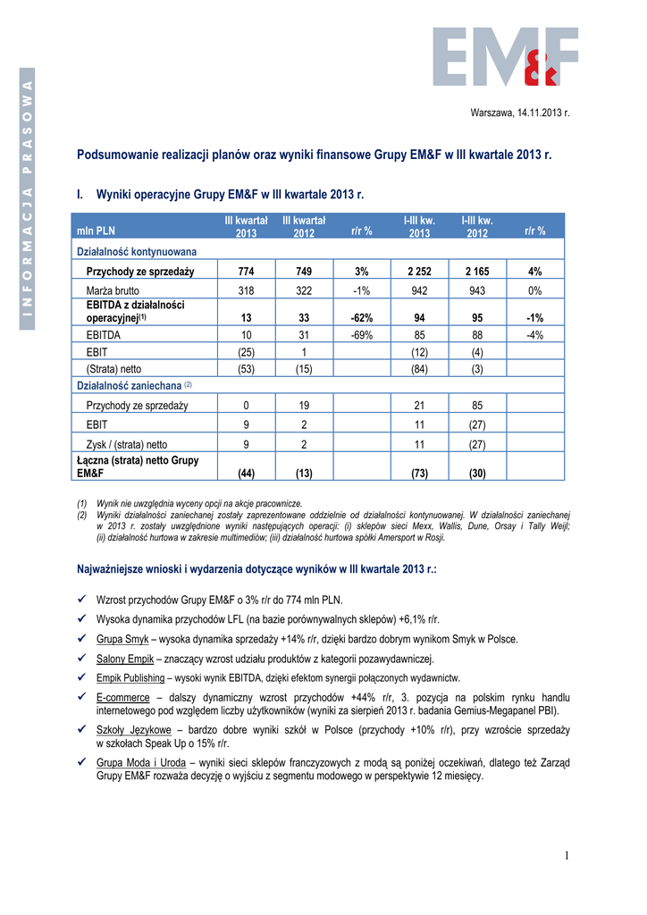 Warszawa, 14.11.2013 r. Podsumowanie realizacji planów oraz wyniki finansowe Grupy EM&F w III kwartale 2013 r. I. Wyniki operacyjne Grupy EM&F w III kwartale 2013 r. III kwartał 2013 III kwartał 2012 r/r % I-III kw. 2013 I-III kw. 2012 r/r % Przychody ze sprzedaży 774 749 3% 2 252 2 165 4% Marża brutto EBITDA z działalności operacyjnej(1) EBITDA EBIT (Strata) netto Działalność zaniechana (2) 318 322 -1% 942 943 0% 13 10 (25) (53) 33 31 1 (15) -62% -69% 94 85 (12) (84) 95 88 (4) (3) -1% -4% Przychody ze sprzedaży 0 19 21 85 EBIT 9 2 11 (27) 9 2 11 (27) (44) (13) (73) (30) mln PLN Działalność kontynuowana Zysk / (strata) netto Łączna (strata) netto Grupy EM&F (1) (2) Wynik nie uwzględnia wyceny opcji na akcje pracownicze. Wyniki działalności zaniechanej zostały zaprezentowane oddzielnie od działalności kontynuowanej. W działalności zaniechanej w 2013 r. zostały uwzględnione wyniki następujących operacji: (i) sklepów sieci Mexx, Wallis, Dune, Orsay i Tally Weijl; (ii) działalność hurtowa w zakresie multimediów; (iii) działalność hurtowa spółki Amersport w Rosji. Najważniejsze wnioski i wydarzenia dotyczące wyników w III kwartale 2013 r.: Wzrost przychodów Grupy EM&F o 3% r/r do 774 mln PLN. Wysoka dynamika przychodów LFL (na bazie porównywalnych sklepów) +6,1% r/r. Grupa Smyk – wysoka dynamika sprzedaży +14% r/r, dzięki bardzo dobrym wynikom Smyk w Polsce. Salony Empik – znaczący wzrost udziału produktów z kategorii pozawydawniczej. Empik Publishing – wysoki wynik EBITDA, dzięki efektom synergii połączonych wydawnictw. E-commerce – dalszy dynamiczny wzrost przychodów +44% r/r, 3. pozycja na polskim rynku handlu internetowego pod względem liczby użytkowników (wyniki za sierpień 2013 r. badania Gemius-Megapanel PBI). Szkoły Językowe – bardzo dobre wyniki szkół w Polsce (przychody +10% r/r), przy wzroście sprzedaży w szkołach Speak Up o 15% r/r. Grupa Moda i Uroda – wyniki sieci sklepów franczyzowych z modą są poniżej oczekiwań, dlatego też Zarząd Grupy EM&F rozważa decyzję o wyjściu z segmentu modowego w perspektywie 12 miesięcy. 1 a. Całkowite przychody ze sprzedaży III kwartał 2013 III kwartał 2012 r/r % I-III kwartał 2013 I-III kwartał 2012 r/r % Razem Grupa EM&F 774 749 3% 2 252 2 165 4% Grupa Empik 300 282 7% 835 804 4% Grupa Smyk 283 248 14% 806 715 13% Szkoły Językowe 47 43 9% 144 142 1% Grupa Moda i Uroda 143 176 -19% 465 503 -8% mln PLN Przychody ze sprzedaży Grupy EM&F wzrosły w III kwartale 2013 r. o 3% r/r do 774 mln PLN, a narastająco w okresie 9 miesięcy wyniosły 2 252 mln PLN, co oznacza wzrost o 4%. Największą dynamikę wykazały sklepy z Grupy Smyk (ze względu na rozwój sieci i pozytywne LFL). Struktura przychodów Grupy EM&F wg segmentów w III kwartale 2013 r. jest zbliżona do poprzedniego roku. Struktura przychodów ze sprzedaży Grupy EM&F w III kwartale 2013 r. (kurs stały) wg segmentów wg krajów Grupa Moda i Uroda 21% Niemcy Pozostałe kraje 2% 12% Grupa Empik 37% Szkoły Językowe 6% Rosja i Ukraina 16% Polska 70% Grupa Smyk 36% b. Przychody ze sprzedaży LFL (na porównywalnej bazie punktów handlowo-usługowych, liczone po kursie stałym) mln PLN (stały kurs) III kwartał 2013 r/r % I-II kwartał 2013 r/r % Razem Grupa EM&F 6,1% 2,8% Grupa Empik 5,5% 1,5% Salony Empik 0,6% -2,8% E-commerce 44% 41% Grupa Smyk 5,4% 4,2% Szkoły Językowe 1,8% -1,0% Grupa Moda i Uroda -9,0% -2,2% W III kwartale 2013 r. przychody ze sprzedaży LFL Grupy EM&F (na porównywalnej grupie punktów handlowousługowych, liczone po kursie stałym) wzrosły o 6,1% r/r. Do pozytywnego wyniku przyczyniły się przede wszystkim: Sklepy z Grupy Smyk, w tym w szczególności wyniki sprzedaży Smyk Polska, gdzie przychody LFL wzrosły o 12,7% r/r. 2 Kolejny kwartał z bardzo wysoką dynamiką sprzedaży w segmencie E-commerce +44% r/r, gdzie sprzedaż rośnie we wszystkich kategoriach produktów, w tym nowo wprowadzonych takich jak ubrania, buty, elektronika oraz kosmetyki. Salony Empik, które zanotowały wysoką dynamikę sprzedaży LFL +5,5% r/r, głównie dzięki dynamicznemu wzrostowi przychodów ze sprzedaży artykułów pozawydawniczych (wzrost w III kwartale br. o 37% r/r). Szkoły Językowe, które odnotowały dynamikę LFL 1,8% r/r, głównie ze względu na wzrost o 9% r/r liczby sprzedanych kursów szkołach Speak Up w Polsce. Mimo przeprowadzonej restrukturyzacji Grupa Moda i Uroda odnotowała spadek przychodów ze sprzedaży LFL - największe spadki zanotowały sklepy w Polsce. c. Marża brutto W III kwartale 2013 r. marża brutto Grupy EM&F w ujęciu wartościowym spadła o 1% r/r do 318 mln PLN. Bardzo duży spadek marży o 37% r/r do 49 mln PLN nastąpił w Grupie Moda i Uroda, ze względu na słabe wyniki sieci sklepów franczyzowych. Natomiast największą dynamikę wzrostu marży brutto wykazała Grupa Empik (+13% r/r) oraz Grupa Smyk (+10% r/r/). W III kwartale 2013 r. rentowność brutto na sprzedaży Grupy EM&F w ujęciu procentowym spadła o 1,9 p.p. do 41,1%, ze względu na spadek marży brutto w Grupie Moda i Uroda (-10,2 p.p.), w segmencie Szkół Językowych (-3,0 p.p.) oraz w Grupie Smyk (-1,8 p.p.). Z kolei poprawa rentowności miała miejsce w Grupie Empik (+2,1 p.p.), głównie ze względu na wzrost marży w salonach na artykułach pozawydawniczych, książkach, muzyce i filmie. d. Wynik EBITDA z działalności operacyjnej Wynik EBITDA z działalności operacyjnej Grupy EM&F w III kwartale 2013 r. spadł o 62% r/r do 13 mln PLN: W Grupie Empik odnotowano spadek EBITDA o 5% r/r do 22 mln PLN, ze względu na gorsze wyniki salonów Empik. Jednocześnie w segmencie E-commerce wzrost zysku był możliwy dzięki rozwojowi biznesu, przy jednoczesnym utrzymaniu kosztów operacyjnych na podobnym poziomie jak w roku poprzednim oraz dynamicznemu wzrostowi przychodów. W Grupie Smyk zysk EBITDA spadł o 79% r/r do 3 mln PLN, ze względu na spadek zysku w Niemczech, Rosji i Tu