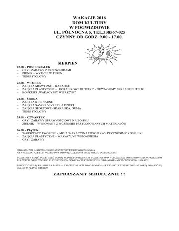 WAKACJE 2016 DOM KULTURY W POGWIZDOWIE UL. PÓŁNOCNA 5, TEL.338567-025 CZYNNY OD GODZ. 9.00.- 17.00. SIERPIEŃ 22.08. - PONIEDZIAŁEK  GRY I ZABAWY Z PRZESZKODAMI  PIKNIK – WYJŚCIE W TEREN  TENIS STOŁOWY 23.08. - WTOREK  ZAJĘCIA MUZYCZNE – KARAOKE  ZAJĘCIA PLASTYCZNE – „KORALIKOWE BUTELKI” - PRZYNOSIMY SZKLANE BUTELKI  KONKURS „WAKACYJNY WIERSZYK” 24.08. - ŚRODA  ZAJĘCIA KULINARNE  ZAJĘCIA SAVOIR VIVRE DLA DZIECI  ZAJĘCIA SPORTOWE -SKAKANKA, GUMA  TENIS STOŁOWY 25.08. - CZWARTEK  GRY I ZABAWY SPRAWNOŚCIOWE NA BOISKU  ZIELNIK – WYKONANY Z WCZEŚNIEJ PRZYGOTOWANYCH MATERIAŁÓW 26.08. - PIĄTEK  WARSZTATY TWÓRCZE -„MOJA WAKACYJNA KOSZULKA”- PRZYNOSIMY KOSZULKI  ZAJĘCIA PLASTYCZNE – WAKACYJNE WSPOMNIENIA  GRY I ZABAWY ORGANIZATOR ZASTRZEGA SOBIE MOŻLIWOŚĆ WPROWADZENIA ZMIAN. NA WYCIECZKI I ZAJĘCIA WYJAZDOWE OBOWIĄZUJĄ ZAPISY. ILOŚĆ MIEJSC OGRANICZONA. UCZESTNICY ZAJĘĆ MUSZĄ MIEĆ ZGODĘ RODZICA/OPIEKUNA NA UCZESTNICTWO W ZAJĘCIACH ORGANIZOWANYCH PRZEZ DOM KULTURY W POGWIZDOWIE, W WYCIECZKACH I ZAJĘCIACH WYJAZDOWYCH ORGANIZOWANYCH PRZEZ GOK- HAŻLACH. PRZEWIDZIANE SĄ WYJAZDY NA BASEN – UZALEŻNIONE JEST TO OD POGODY – W ZWIĄZKU Z TYMI WYJAZDAMI MOGĄ POJAWIĆ SIĘ ZMIANY W PLANIE WAKACJI. ZAPRASZAMY SERDECZNIE !!!