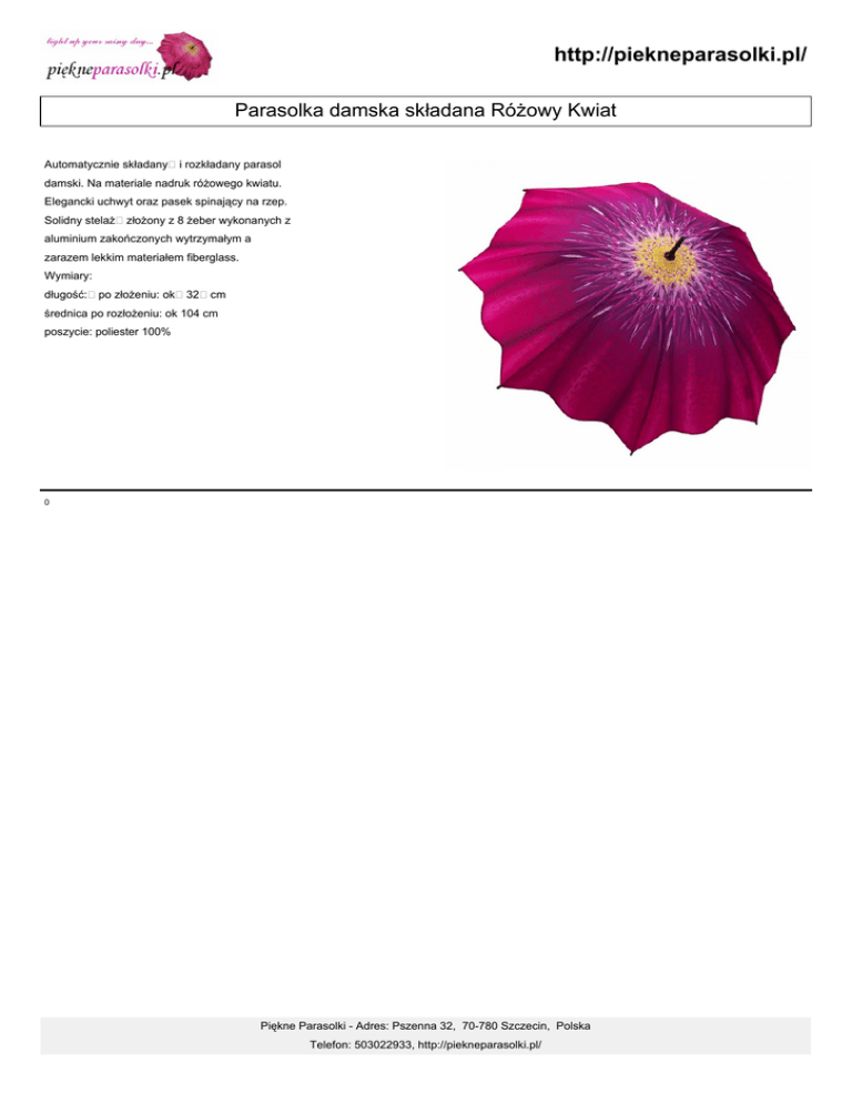 http://piekneparasolki.pl/ Parasolka damska składana Różowy Kwiat Automatycznie składany i rozkładany parasol damski. Na materiale nadruk różowego kwiatu. Elegancki uchwyt oraz pasek spinający na rzep. Solidny stelaż złożony z 8 żeber wykonanych z aluminium zakończonych wytrzymałym a zarazem lekkim materiałem fiberglass. Wymiary: długość: po złożeniu: ok 32 cm średnica po rozłożeniu: ok 104 cm poszycie: poliester 100% 0 Piękne Parasolki - Adres: Pszenna 32, 70-780 Szczecin, Polska Telefon: 503022933, http://piekneparasolki.pl/ http://piekneparasolki.pl/ Piękne Parasolki - Adres: Pszenna 32, 70-780 Szczecin, Polska Telefon: 503022933, http://piekneparasolki.pl/