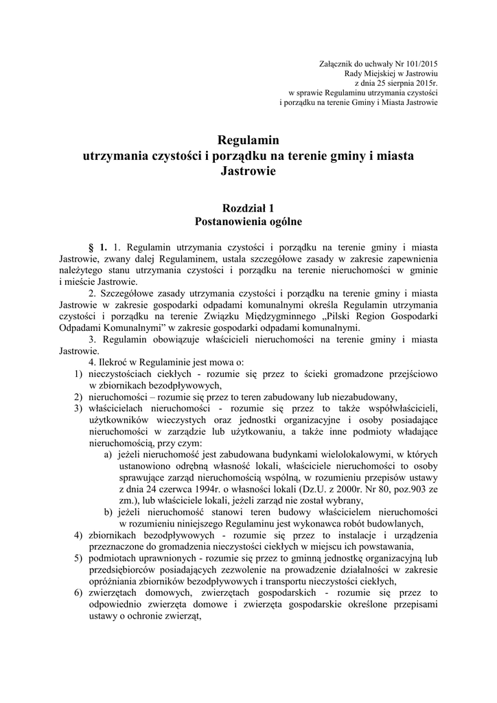 Załącznik do uchwały Nr 101/2015 Rady Miejskiej w Jastrowiu z dnia 25 sierpnia 2015r. w sprawie Regulaminu utrzymania czystości i porządku na terenie Gminy i Miasta Jastrowie Regulamin utrzymania czystości i porządku na terenie gminy i miasta Jastrowie Rozdział 1 Postanowienia ogólne § 1. 1. Regulamin utrzymania czystości i porządku na terenie gminy i miasta Jastrowie, zwany dalej Regulaminem, ustala szczegółowe zasady w zakresie zapewnienia należytego stanu utrzymania czystości i porządku na terenie nieruchomości w gminie i mieście Jastrowie. 2. Szczegółowe zasady utrzymania czystości i porządku na terenie gminy i miasta Jastrowie w zakresie gospodarki odpadami komunalnymi określa Regulamin utrzymania czystości i porządku na terenie Związku Międzygminnego „Pilski Region Gospodarki Odpadami Komunalnymi” w zakresie gospodarki odpadami komunalnymi. 3. Regulamin obowiązuje właścicieli nieruchomości na terenie gminy i miasta Jastrowie. 4. Ilekroć w Regulaminie jest mowa o: 1) nieczystościach ciekłych - rozumie się przez to ścieki gromadzone przejściowo w zbiornikach bezodpływowych, 2) nieruchomości – rozumie się przez to teren zabudowany lub niezabudowany, 3) właścicielach nieruchomości - rozumie się przez to także współwłaścicieli, użytkowników wieczystych oraz jednostki organizacyjne i osoby posiadające nieruchomości w zarządzie lub użytkowaniu, a także inne podmioty władające nieruchomością, przy czym: a) jeżeli nieruchomość jest zabudowana budynkami wielolokalowymi, w których ustanowiono odrębną własność lokali, właściciele nieruchomości to osoby sprawujące zarząd nieruchomością wspólną, w rozumieniu przepisów ustawy z dnia 24 czerwca 1994r. o własności lokali (Dz.U. z 2000r. Nr 80, poz.903 ze zm.), lub właściciele lokali, jeżeli zarząd nie został wybrany, b) jeżeli nieruchomość stanowi teren budowy właścicielem nieruchomości w rozumieniu niniejszego Regulaminu jest wykonawca robót budowlanych, 4) zbiornikach bezodpływowych - rozumie się przez to instalacje i urządzenia przeznaczone do gromadzenia nieczystości ciekłych w miejscu ich powstawania, 5) podmiotach uprawnionych - rozumie się przez to gminną jednostkę organizacyjną lub przedsiębiorców posiadających zezwolenie na prowadzenie działalności w zakresie opróżniania zbiorników bezodpływowych i transportu nieczystości ciekłych, 6) zwierzętach domowych, zwierzętach gospodarskich - rozumie się przez to odpowiednio zwierzęta domowe i zwierzęta gospodarskie określone przepisami ustawy o ochronie zwierząt, 7) chodnikach - rozumie się przez to wydzieloną dla ruchu pieszego części drogi publicznej, położoną bezpośrednio przy granicy nieruchomości. Rozdział 2 Wymagania w zakresie utrzymania czystości i porządku na terenie nieruchomości Wymagania dotyczące uprzątania z błota, śniegu, lodu i innych zanieczyszczeń z części nieruchomości służących do użytku publicznego § 2. 1. Właściciele nieruchomości zobowiązani są do możliwie niezwłocznego uprzątnięcia błota, śniegu, lodu i innych zanieczyszczeń z chodników położonych wzdłuż nieruchomości. 2. Obowiązek, o którym mowa w ust. 1 polega na przemieszczeniu błota, lodu lub śniegu w miejsce nie kolidujące z ruchem pieszych lub pojazdów, oraz zapewnieniu likwidacji lub znacznego zmniejszenia śliskości powierzchni środkami obojętnymi dla środowiska lub innymi przewidzianymi przepisami prawa. 3. Inne zanieczyszczenia, o których mowa w ust. 1 usuwane przez właścicieli nieruchomości z chodników należy gromadzić w pojemnikach na odpady komunalne. 4. Właściciele nieruchomości mają obowiązek usuwania sopli dachowych i nawisów śniegu w rejonie chodnika położonego wzdłuż nieruchomości. 5. Zabrania się stosowania środków chemicznych szkodliwych dla środowiska podczas usuwania śniegu i lodu. Wymagania dotyczące prowadzenia mycia i naprawy pojazdów samochodowych § 3. 1. Mycie pojazdów samochodowych powinno być prowadzone wyłącznie w myjniach samochodowych. 2. Dopuszcza się mycie pojazdów samochodowych poza myjniami samochodowymi, ale tylko wówczas, gdy nie nastąpi żadne niebezpieczeństwo zanieczyszczania środowiska, a powstające ścieki odprowadzone będą w całości do kanalizacji sanitarnej lub zbiornika bezodpływowego. 3. Naprawa pojazdów samochodowych powinna być prowadzona wyłącznie w warsztatach naprawczych. 4. Dopuszcza się prowadzenie napraw pojazdów samochodowych poza warsztatami naprawczymi, ale tylko wówczas, gdy nie nastąpi żadne niebezpieczeństwo zanieczyszczania środowiska oraz uciążliwość dla ludzi, a sposób magazynowania i postępowania z wytworzonymi odpadami będzie prowadzony zgodnie z wymaganiami prawnymi w tym zakresie. Rozdział 3 Częstotliwość i sposoby pozbywania się nieczystości ciekłych § 4. 1. Właściciele nieruchomości zobowiązani są do przyłączenia nieruchomości do istniejącej sieci kanalizacyjnej, a w przypadku braku takiej sieci do wyposażenia nieruchomości w zbiorniki bezodpływowe lub w przydomową oczyszczalnię ścieków, jeśli spełnione są warunki prawne do jej instalacji. 2. Właściciele nieruchomości są zwolnieni z obowiązku przyłączenia nieruchomości do istniejącej sieci kanalizacyjnej, jeśli nieruchomość ta jest wyposażona w istniejącą przydomową oczyszczalnię ścieków spełniającą wymagania określone w przepisach odrębnych. 3. Właściciele nieruchomości zobowiązani są do usuwania nieczystości ciekłych gromadzonych w zbiornikach bezodpływowych z częstotliwością, która uniemożliwia przepełnianie posiadanych zbiorników bezodpływowych jednak nie rzadziej niż raz na 4 miesiące. 4. Właściciele nieruchomości zobowiązani są do przekazywania nieczystości ciekłych wyłącznie podmiotom uprawnionym. 5. Właściciele nieruchomości zobowiązani są do zawarcia pisemnej umowy na opróżni