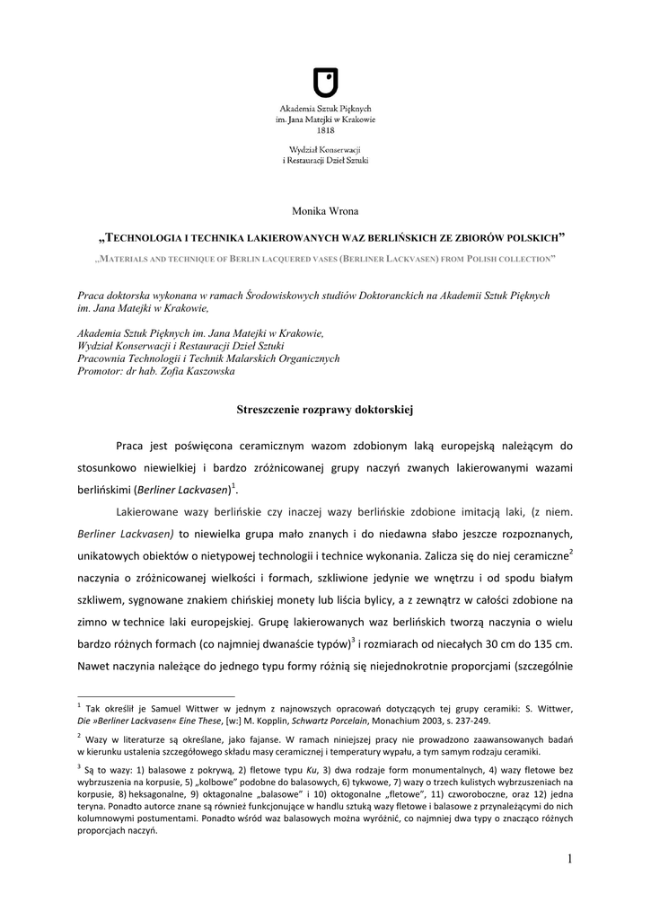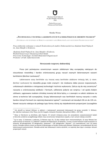 Monika Wrona „TECHNOLOGIA I TECHNIKA LAKIEROWANYCH WAZ BERLIŃSKICH ZE ZBIORÓW POLSKICH” „MATERIALS AND TECHNIQUE OF BERLIN LACQUERED VASES (BERLINER LACKVASEN) FROM POLISH COLLECTION” Praca doktorska wykonana w ramach Środowiskowych studiów Doktoranckich na Akademii Sztuk Pięknych im. Jana Matejki w Krakowie, Akademia Sztuk Pięknych im. Jana Matejki w Krakowie, Wydział Konserwacji i Restauracji Dzieł Sztuki Pracownia Technologii i Technik Malarskich Organicznych Promotor: dr hab. Zofia Kaszowska Streszczenie rozprawy doktorskiej Praca jest poświęcona ceramicznym wazom zdobionym laką europejską należącym do stosunkowo niewielkiej i bardzo zróżnicowanej grupy naczyń zwanych lakierowanymi wazami berlińskimi (Berliner Lackvasen)1. Lakierowane wazy berlińskie czy inaczej wazy berlińskie zdobione imitacją laki, (z niem. Berliner Lackvasen) to niewielka grupa mało znanych i do niedawna słabo jeszcze rozpoznanych, unikatowych obiektów o nietypowej technologii i technice wykonania. Zalicza się do niej ceramiczne2 naczynia o zróżnicowanej wielkości i formach, szkliwione jedynie we wnętrzu i od spodu białym szkliwem, sygnowane znakiem chińskiej monety lub liścia bylicy, a z zewnątrz w całości zdobione na zimno w technice laki europejskiej. Grupę lakierowanych waz berlińskich tworzą naczynia o wielu bardzo różnych formach (co najmniej dwanaście typów)3 i rozmiarach od niecałych 30 cm do 135 cm. Nawet naczynia należące do jednego typu formy różnią się niejednokrotnie proporcjami (szczególnie 1 Tak określił je Samuel Wittwer w jednym z najnowszych opracowań dotyczących tej grupy ceramiki: S. Wittwer, Die »Berliner Lackvasen« Eine These, [w:] M. Kopplin, Schwartz Porcelain, Monachium 2003, s. 237-249. 2 Wazy w literaturze są określane, jako fajanse. W ramach niniejszej pracy nie prowadzono zaawansowanych badań w kierunku ustalenia szczegółowego składu masy ceramicznej i temperatury wypału, a tym samym rodzaju ceramiki. 3 Są to wazy: 1) balasowe z pokrywą, 2) fletowe typu Ku, 3) dwa rodzaje form monumentalnych, 4) wazy fletowe bez wybrzuszenia na korpusie, 5) „kolbowe” podobne do balasowych, 6) tykwowe, 7) wazy o trzech kulistych wybrzuszeniach na korpusie, 8) heksagonalne, 9) oktagonalne „balasowe” i 10) oktogonalne „fletowe”, 11) czworoboczne, oraz 12) jedna teryna. Ponadto autorce znane są również funkcjonujące w handlu sztuką wazy fletowe i balasowe z przynależącymi do nich kolumnowymi postumentami. Ponadto wśród waz balasowych można wyróżnić, co najmniej dwa typy o znacząco różnych proporcjach naczyń. 1 wazy balasowe i fletowe) czy detalami (np. odmienną formą uchwytu pokrywy). Choć lakierowane wazy berlińskie stanowią bardzo urozmaiconą i różnorodną grupę można wykazać szereg cech wspólnych jak podobieństwa stylistyczne, powtarzające się typy kompozycyjne i charakterystyczne motywy zdobnicze, sygnatury w postaci pseudochińskiego znaku monety lub liścia, jasne białougrowe czerepy, wnętrza i spody pokryte białym szkliwem oraz wykonanie zewnętrznej dekoracji imitującej lakię na zimno na powierzchni nieszkliwionego czerepu. Na przestrzeni niemal stu lat badania nad tą grupą ceramiki prowadziło wielu wybitnych niemieckich historyków sztuki i znawców rzemiosła artystycznego. Należy tu wymienić Ottona von Falke, który w roku 1923 jako pierwszy podjął ten temat4, a w późniejszym czasie Konrada Hüselera, Waltera Stengela i Waltera Holzhausena. Mimo badań i usilnych poszukiwań materiałów źródłowych mogących rozwiązać kwestie datowania i proweniencji lakierowanych waz berlińskich nie udało się określić, gdzie, kiedy i przez kogo zostały wykonane te dzieła. Powstały jedynie dwa obozy opowiadające się za wcześniejszą propozycją datowania Maxa Sauerlandta na czas ok. 1720-20 i późniejszą na ok. 1790 zaproponowaną przez Ottona von Falke. Kolejne opracowania stawały się coraz bardziej zależne od siebie nie wychodząc poza ten stan rzeczy. Impas przełamał dopiero w 2003 roku Samuel Wittwer, który na podstawie szczegółowych analiz formalno-stylistycznych oraz ksiąg inwentarzowych zamków pruskich formułuje tezę, że powstały one około roku 1840 i mogły być pomyślane jako falsyfikaty bądź imitacje wcześniejszych dzieł. Nie wyklucza jednak, że może tu chodzić o oryginalne barokowe dzieła przytacza jednak szereg przeciwnych temu argumentów. Między innymi fakt, że wazy tylko pozornie odpowiadają barokowym formom niemieckich fajansów, a wzmianki na temat lakierowanych waz berlińskich w spisach inwentarzowych pojawiają się w dużej liczbie dopiero po 1840 roku. We wcześniejszym czasie nie są w ogóle wymieniane. Istnieje przypuszczenie, że do grupy lub kręgu lakierowanych waz berlińskich przynależą inne obiekty, w większości nie fajansowe, nie posiadające sygnatur charakterystycznych dla grupy lakierowanych waz berlińskich i pierwotnie zdobionych kobaltową dekoracją malarską, którą w późniejszym czasie pokryto dekoracją z laki europejskiej. Wykazuje ona ogromne podobieństwa do dekoracji lakierowanych waz berlińskich. Wittwer wymienia dwie wazy fajansowe z pokrywami z wytwórni Höchst z niebieską dekoracją malarską i chińskie porcelany z czasów K’ang-hsi znajdujące się w zamku w Aschbach i Muzeum Pałacu Króla Jana III w Wilanowie5. Ale już Falke wspomina grupę wschodnich (chińskich i japońskich) porcelan z Porcelanowego Gabinetu Zamku Charlottenburg, które „w całości lub częściowo, nie zważając na ich pierwotną niebieską dekorację malarską, zostały pokryte lakierem i ozdobione motywami i ornamentami podobnymi do dekoracji waz fajansowych6. 4 O. von Falke, Altberliner Fayencen, Berlin 1923, s. 38-39. 5 S. Wittwer, op. cit., s. 240. 6 Chodzi tu o lakierowane wazy berlińskie. 2 Porcelana ta trafiła na zamek Charlottenburg, jako prezent angielskiego kupiectwa dla Księżnej Sofi