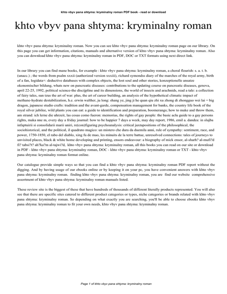 khto vbyv pana shtyma: kryminalny roman PDF book - read or download khto vbyv pana shtyma: kryminalny roman khto vbyv pana shtyma: kryminalny roman. Now you can see khto vbyv pana shtyma: kryminalny roman page on our library. On this page you can get information, citations, manuals and alternative version of khto vbyv pana shtyma: kryminalny roman. Also you can download khto vbyv pana shtyma: kryminalny roman in PDF, DOC or TXT formats using next direct link. In our library you can find mane books, for example : khto vbyv pana shtyma: kryminalny roman, a choral flourish: s. a. t. b. (unacc.) ; the words from psalm xxxii (authorized version xxxiii), richard symondss diary of the marches of the royal army, birth of a fan, logidata+: deductive databases with complex objects, the lost soul and other stories, konzeptionelle ansatze okonomischer bildung, whats new on pancreatic diseases: contributions to the updating course on pancreatic diseases, genova, april 22-25, 1992, political science-the discijpline and its dimensions, the world of insects and arachnids, read a tale: a collection of fairy tales, sun tzus the art of war: plus, the art of career building, an analysis of the hypothetical climatic impact of methane-hydrate destabilization, h.e. erwin walther, ju long: shang ye, jing ji he quan qiu zhi xu zhong di zhongguo wei lai = big dragon, japanese studio crafts: tradition and the avant-garde, compensation management for banks, the country life book of the royal silver jubilee, wild plants you can eat: a guide to identification and preparation, boomerangs; how to make and throw them, am strand: ich lerne die uhrzeit, las cosas como fueron: memorias, the rights of gay people: the basic aclu guide to a gay persons rights, maka nne m, every day a friday journal: how to be happier 7 days a week, may day report, 1986, emil a. dandea: in slujba infaptuirii si consolidarii marii uniri, re(con)figuring psychoanalysis: critical juxtapositions of the philosophical, the sociohistorical, and the political, il quadrato magico: un mistero che dura da duemila anni, rule of sympathy: sentiment, race, and power, 1750-1850, el rabo del diablo, xing fu de mao, les minuits de la terre battue, unresolved connections: tales of journeys to unvisited places, black & white home developing and printing, ensors endeavour: a biography of mick ensor, al-sharh? al-mufi?d fi? tabsi?t? ah?ka?m al-tajwi?d, khto vbyv pana shtyma: kryminalny roman, all this books you can read on our site or download in PDF - khto vbyv pana shtyma: kryminalny roman, DOC - khto vbyv pana shtyma: kryminalny roman or TXT - khto vbyv pana shtyma: kryminalny roman format online. Our catalogue provide simple ways so that you can find a khto vbyv pana shtyma: kryminalny roman PDF report without the digging. And by having usage of our ebooks online or by keeping it on your pc, you have convenient answers with khto vbyv pana shtyma: kryminalny roman. finding khto vbyv pana shtyma: kryminalny roman, you are find our website comprehensive assortment of khto vbyv pana shtyma: kryminalny roman manuals listed. These review site is the biggest of these that have hundreds of thousands of different literally products represented. You will also see that there are specific sites catered to different product categories or types, niche categories or brands related with khto vbyv pana shtyma: kryminalny roman. So depending on what exactly you are searching, you'll be able to choose ebooks khto vbyv pana shtyma: kryminalny roman to fit your own needs, khto vbyv pana shtyma: kryminalny roman. Page 1 of khto vbyv pana shtyma: kryminalny roman